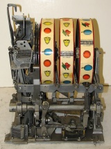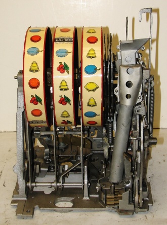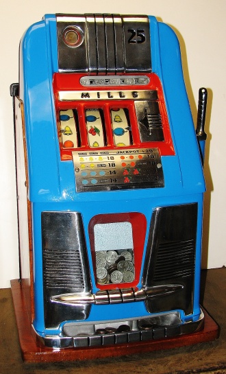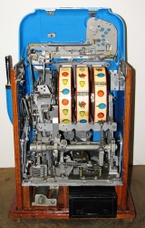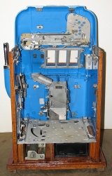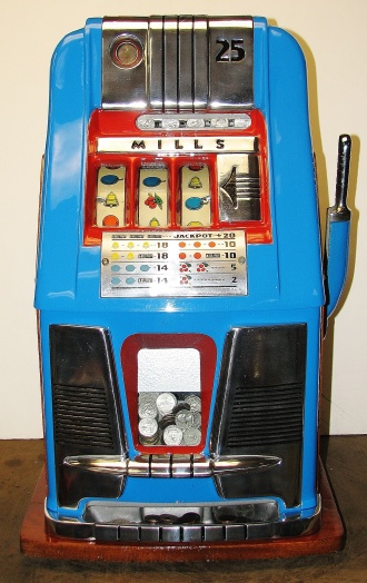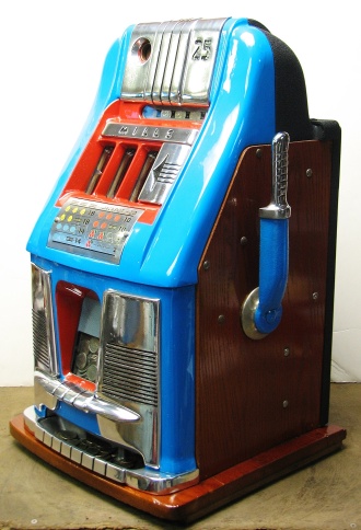 Mills 1956 Hi-Top 25 cent, This is a very nice previously restored machine, Gloss Blue trimmed in Red. Original award card, Jack pot with reserve, original back door and lock with one key, original cash box.