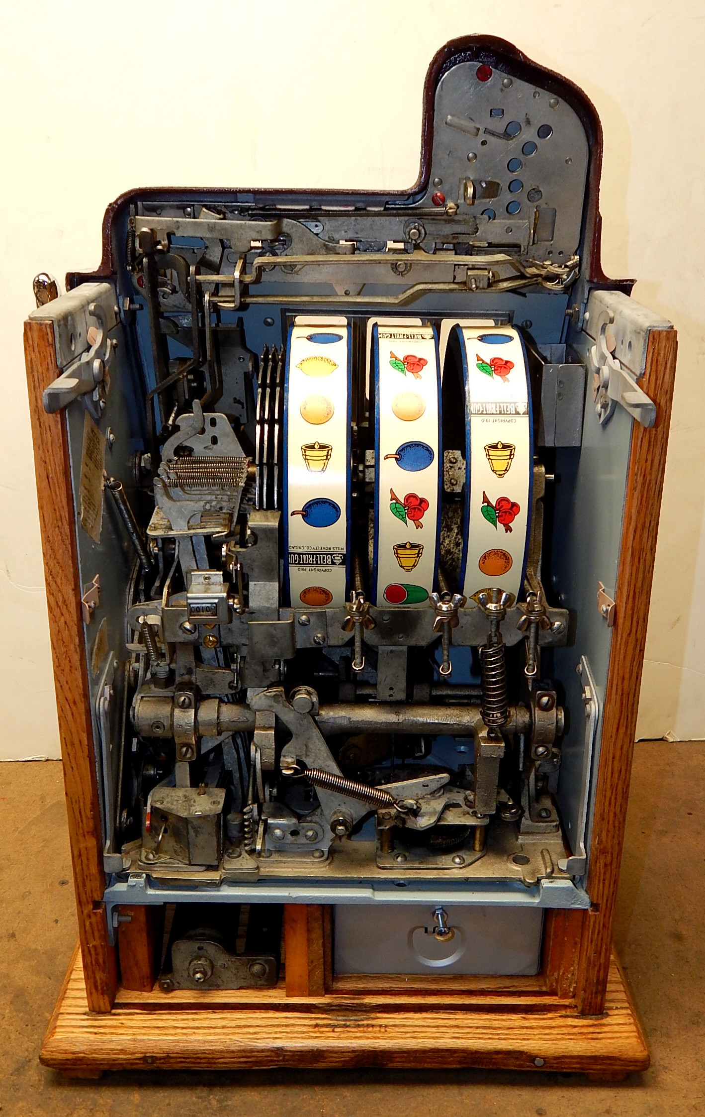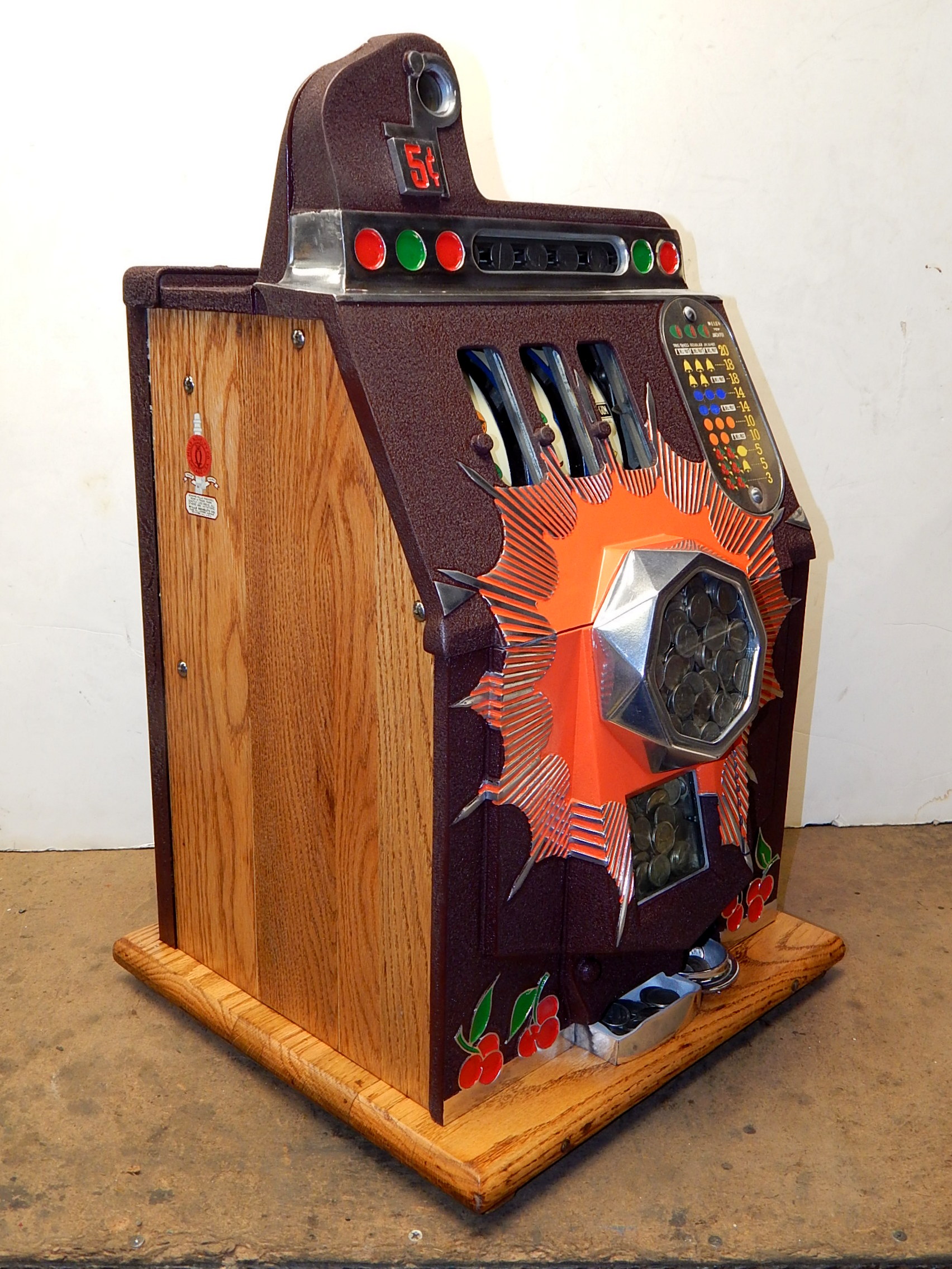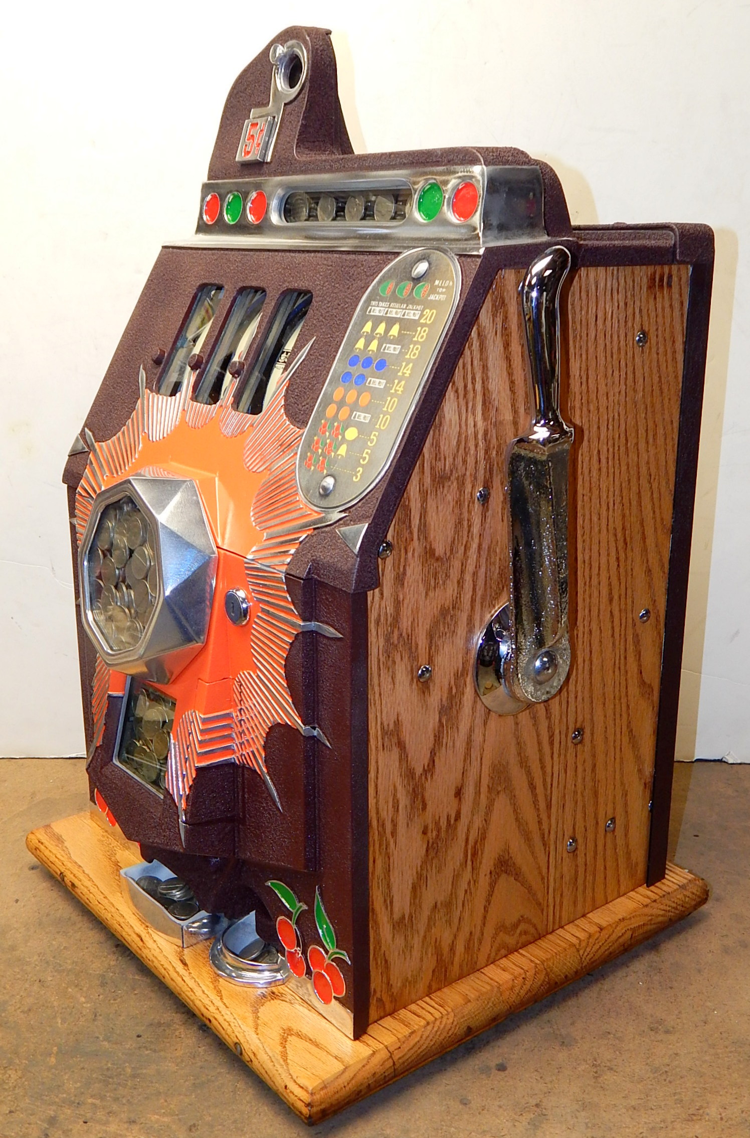 Mills 1941 Bursting Cherry "Melon Bell" 5 cent, restored, wrinkle brown, orange, with red and green trim colors. Original award card, Jack pot with reserve, original back door and lock with one key, original cash box, new reel strips, new oak base on the cabinet. What is special about this slot machine is it has two Jackpots, one for three Bars and the other is for three Melons. The large diamond jackpot on the front was for the three melons. Back in the day operators would place a watch or paper money in the diamond on the front to attract more players. Plays very easy.