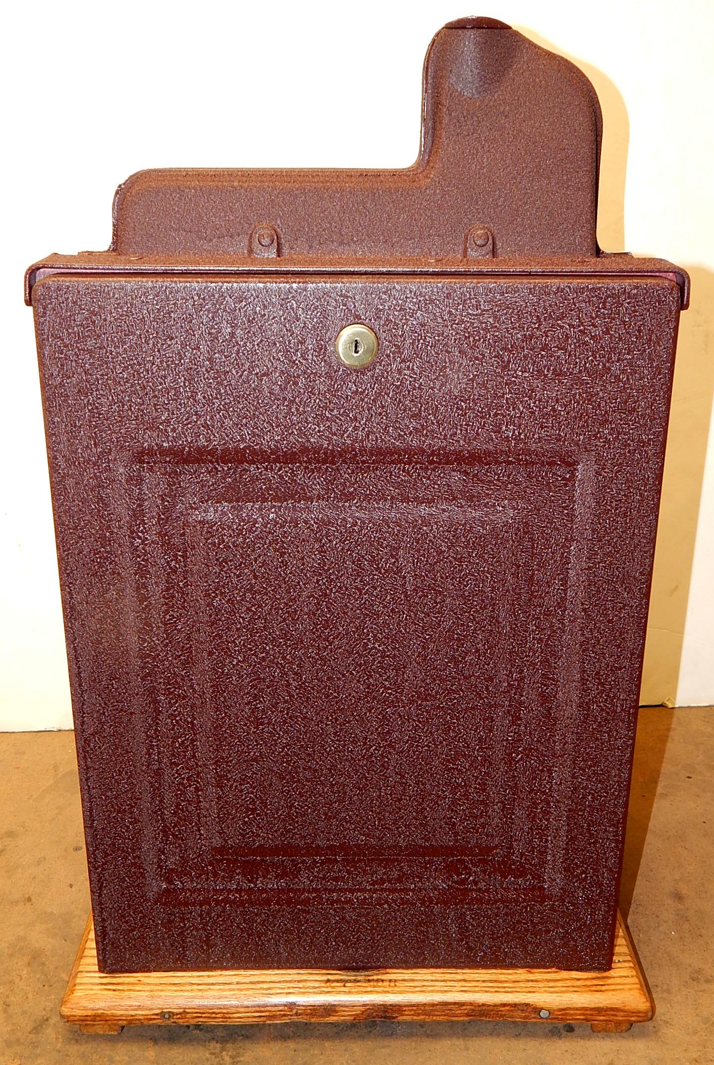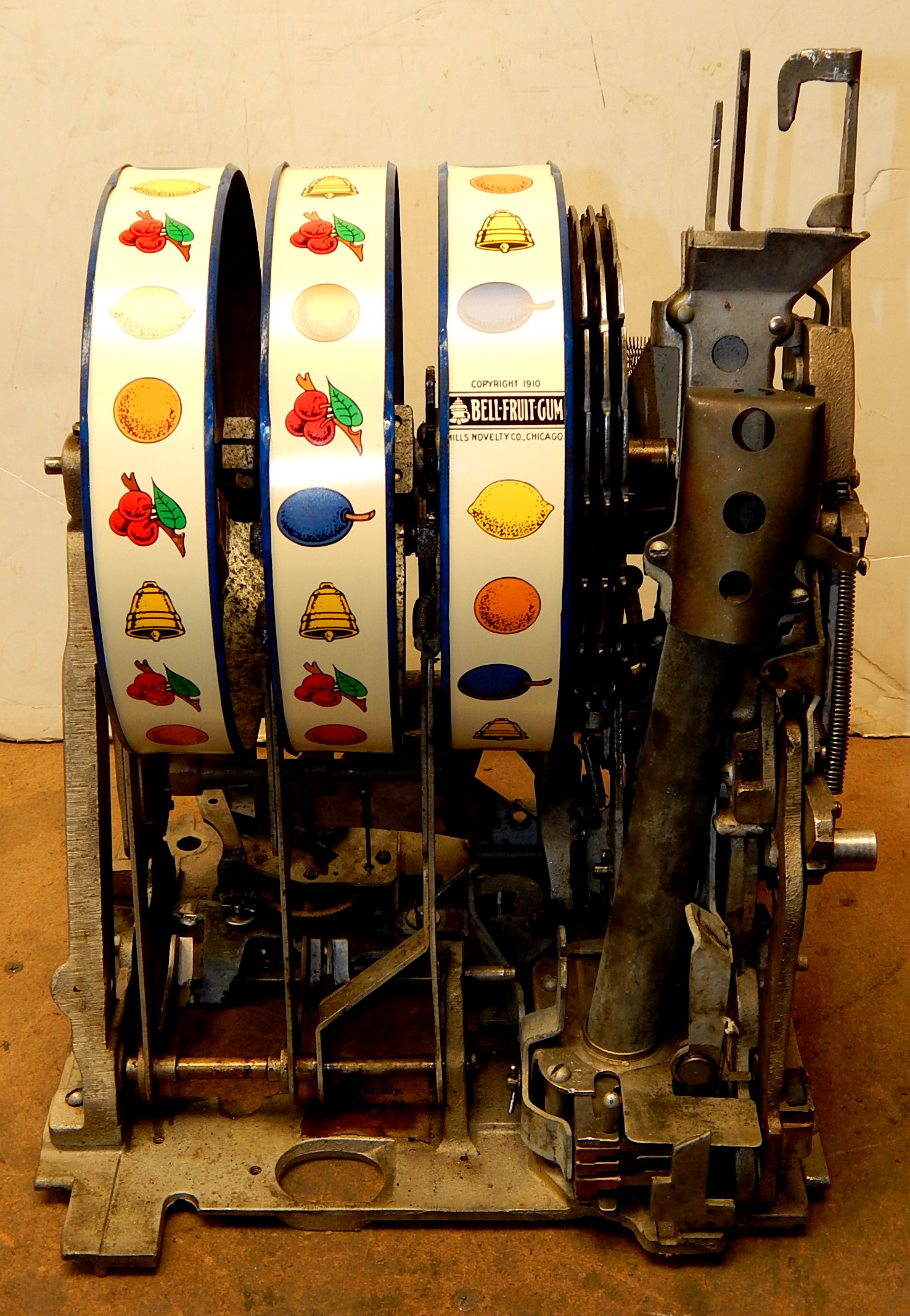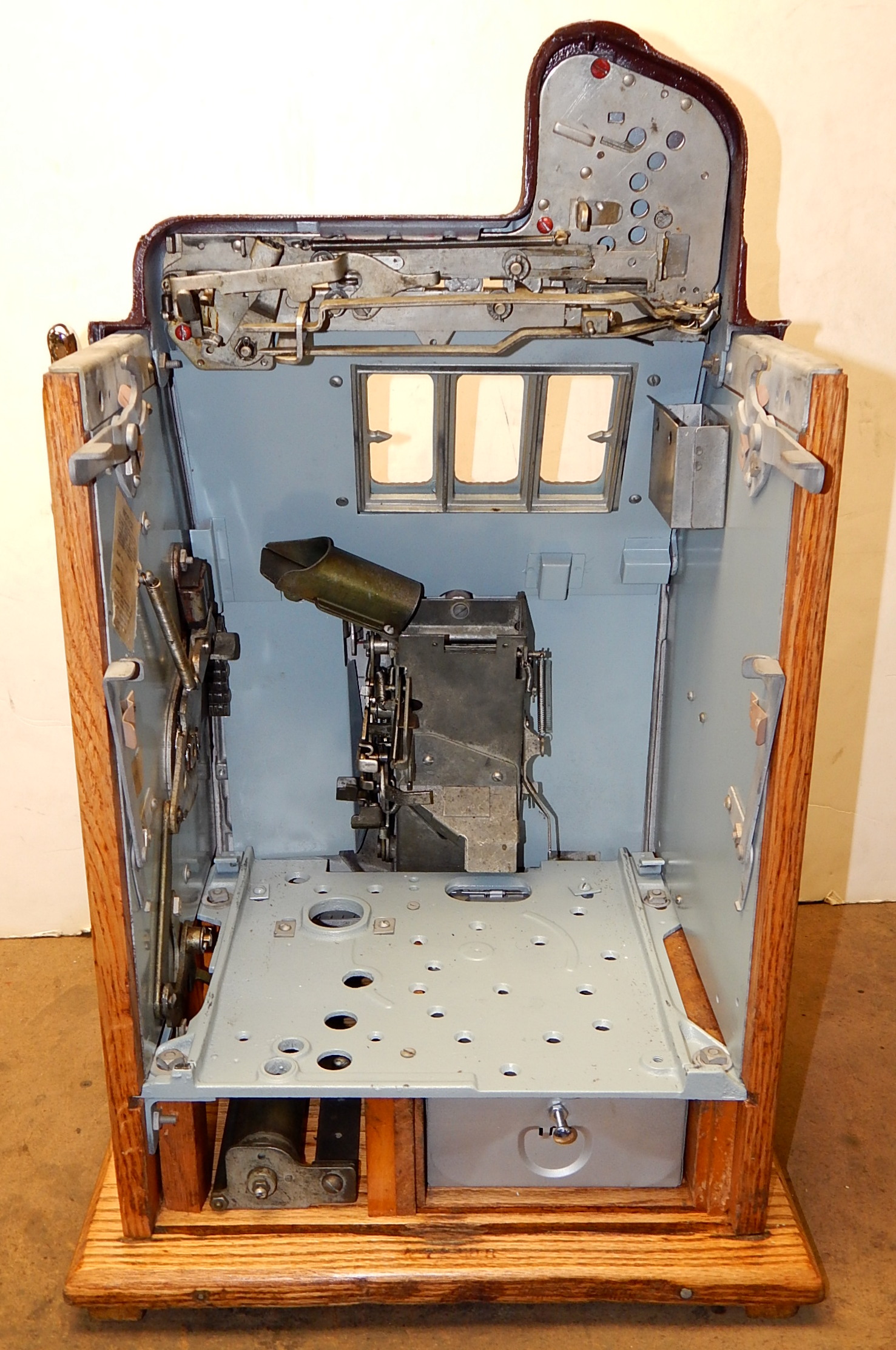Mills 1941 Bursting Cherry "Melon Bell" 5 cent, restored, wrinkle brown, orange, with red and green trim colors. Original award card, Jack pot with reserve, original back door and lock with one key, original cash box, new reel strips, new oak base on the cabinet. What is special about this slot machine is it has two Jackpots, one for three Bars and the other is for three Melons. The large diamond jackpot on the front was for the three melons. Back in the day operators would place a watch or paper money in the diamond on the front to attract more players. Plays very easy.
