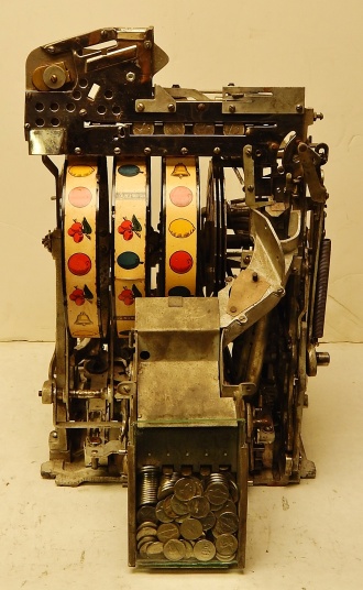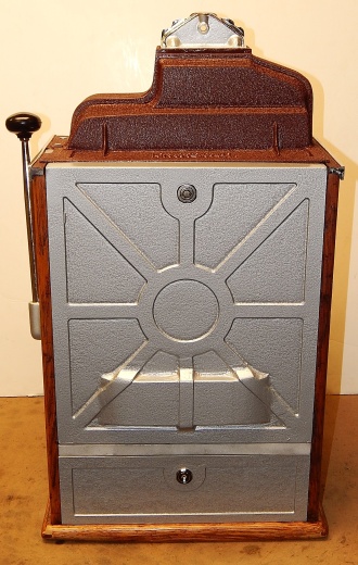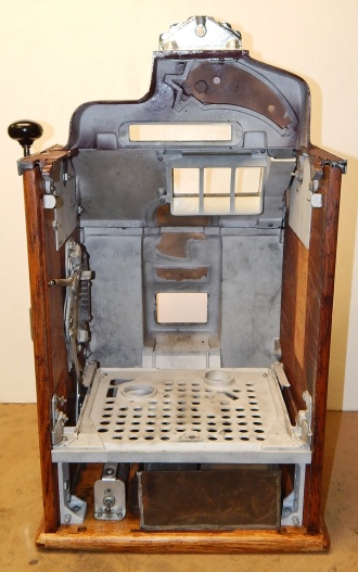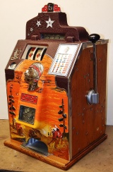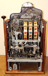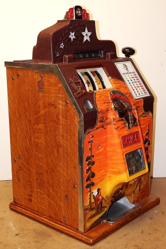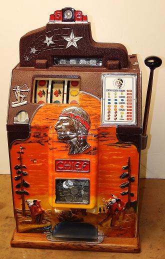 1936 Jennings "4 Star" Chief, 5 cent. Very nice original number matching machine. Casting are polished not plated. Oak cabinet, cash box, original back door, original reel stripes. The hunting scene on this machine was hand painted