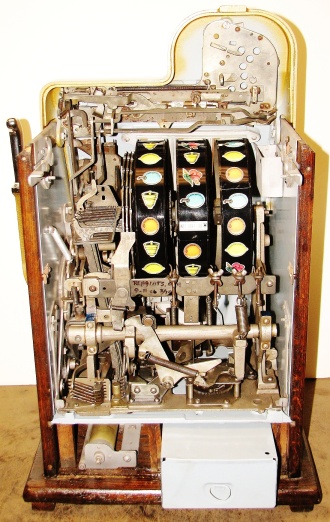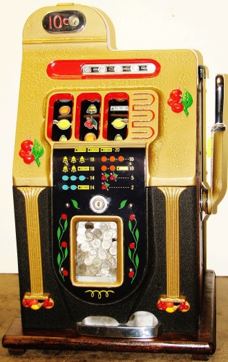 Mills 1948 Golden Falls 10 cent, Painted Hammer Gold trimed in red. Front load Jack pot, original back door and lock with one key, original cash box. Plays very easy, 2-5 payout.