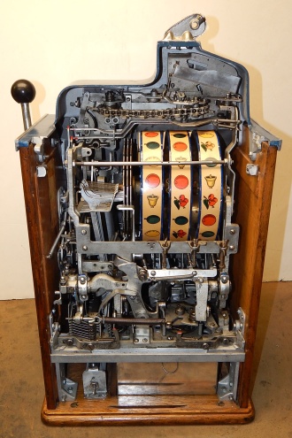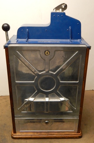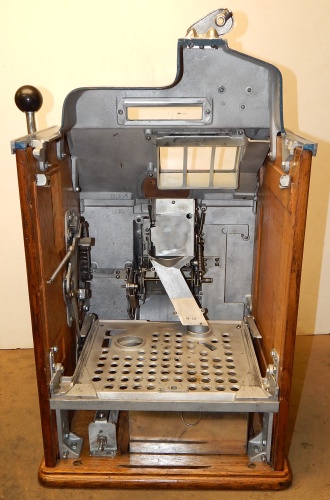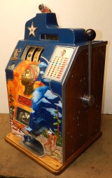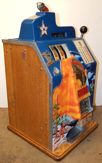 1935 Jennings "One Star" Chief, 5 cent. Very nice original number matching machine. Previously restored. Hand painted Hunting Scene. Casting are polished not plated. Oak cabinet, new cash box, original back door, original reel stripes. Still has the original paper sticker from Jennings on the inside with the serial number. Play very easy.
