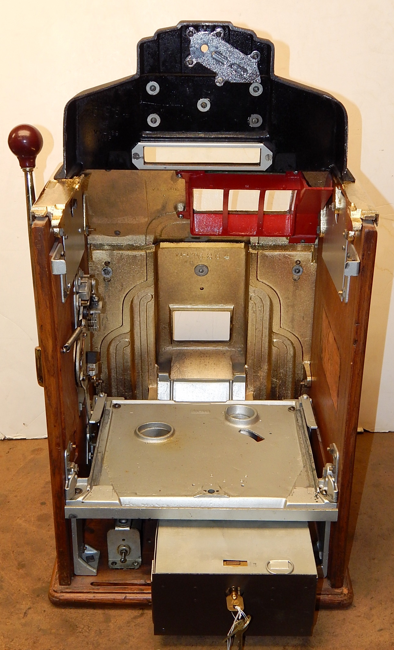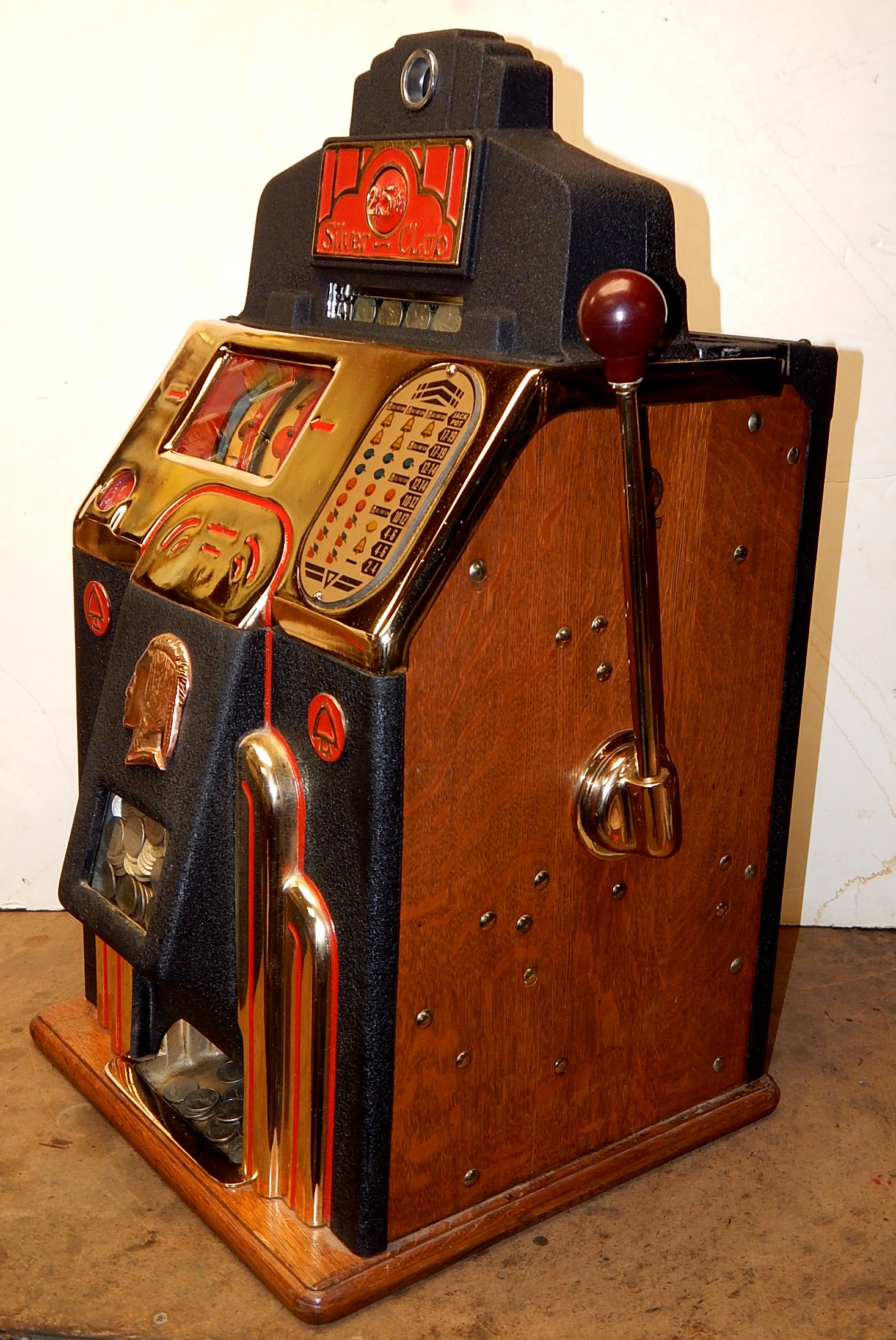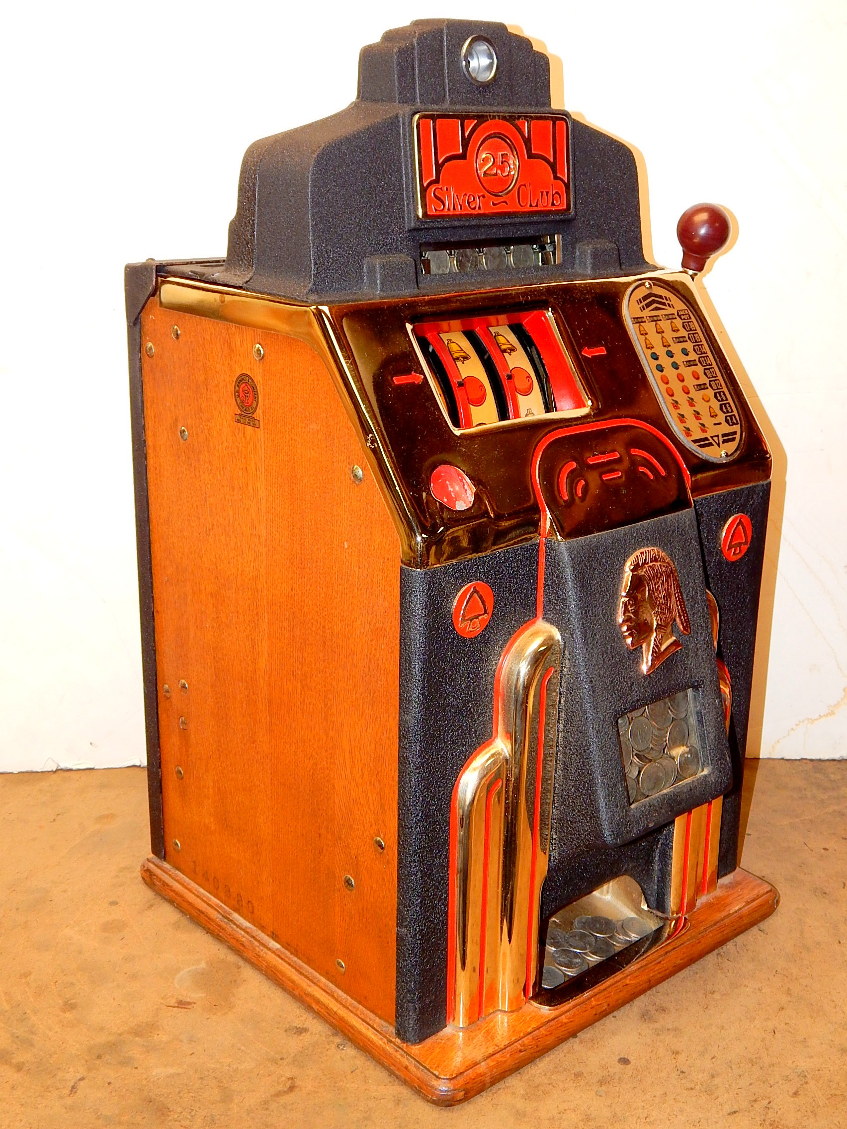 1938 Jennings Silver Club Chief, 25 cent. Previously restored. Casting are chrome plated with gold tint just beautiful, trimmed in red with black wrinkle paint. Very nice original machine, Oak Cabinet, cash box with Ace lock, original back door with OJ Lock and two keys, original reel stripes. Jackpot with reserve. Plays nice.