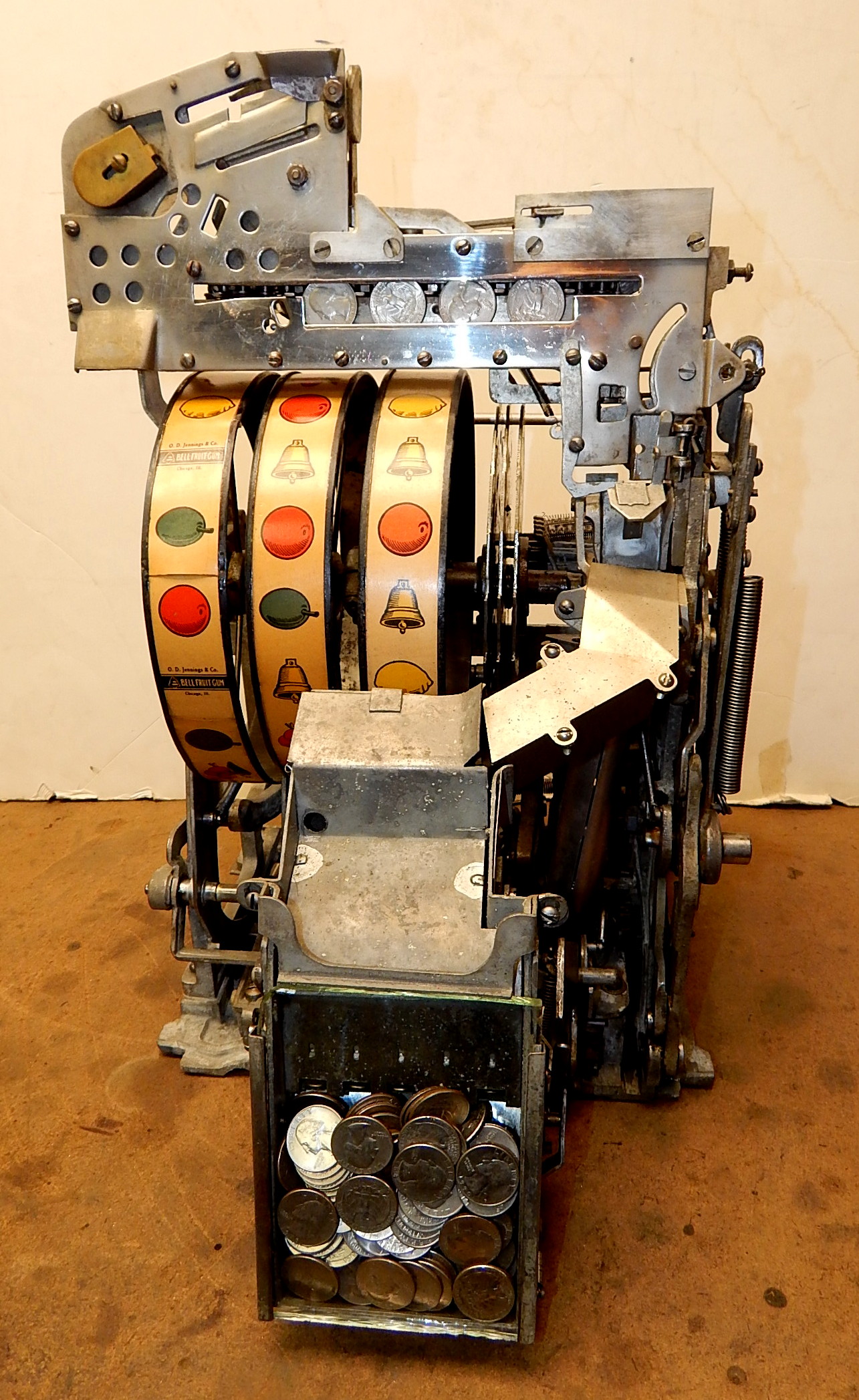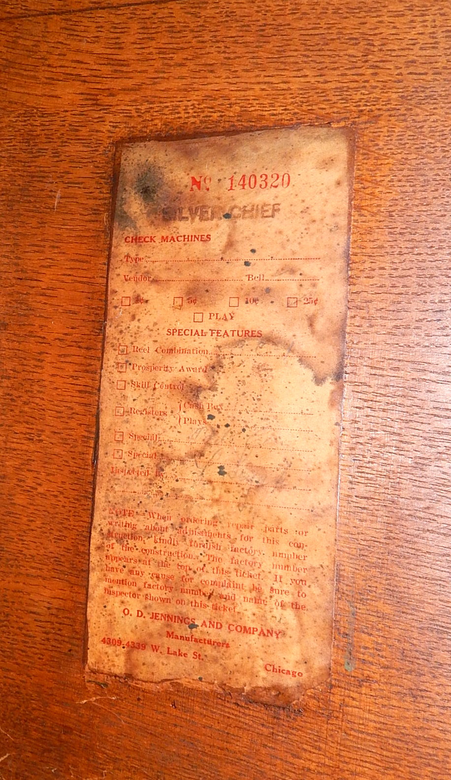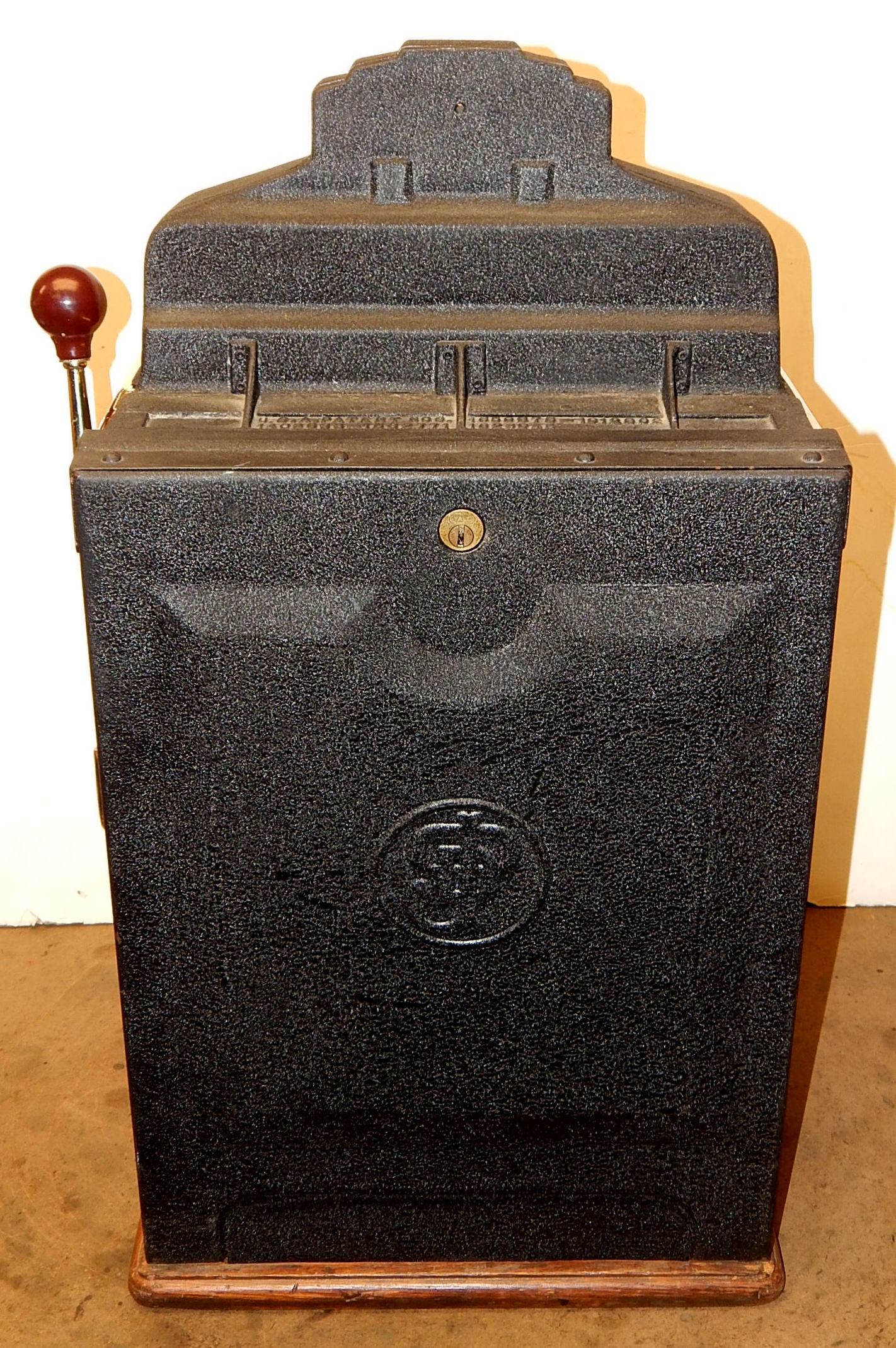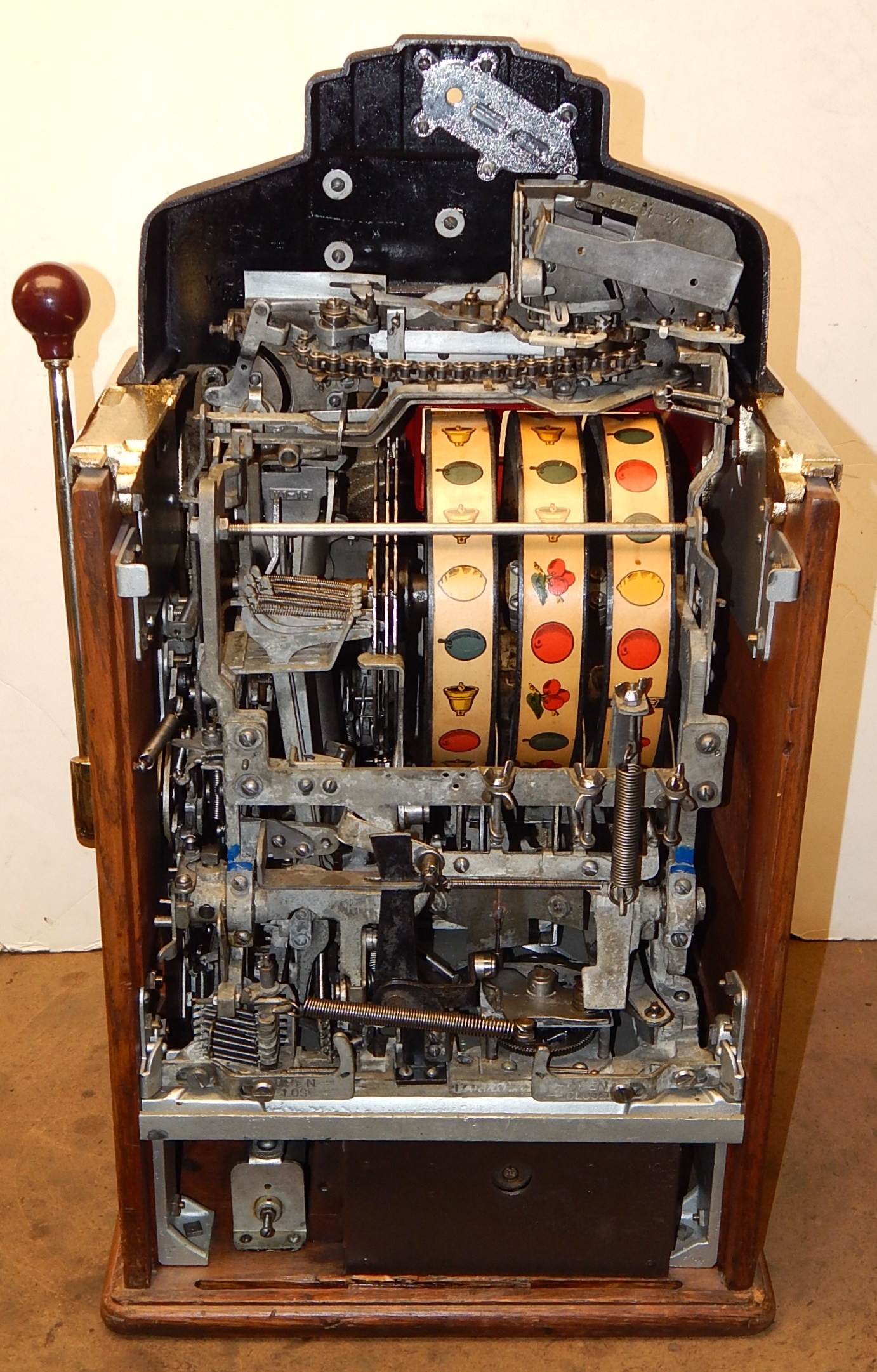 1938 Jennings Silver Club Chief, 25 cent. Previously restored. Casting are chrome plated with gold tint just beautiful, trimmed in red with black wrinkle paint. Very nice original machine, Oak Cabinet, cash box with Ace lock, original back door with OJ Lock and two keys, original reel stripes. Jackpot with reserve. Plays nice.
