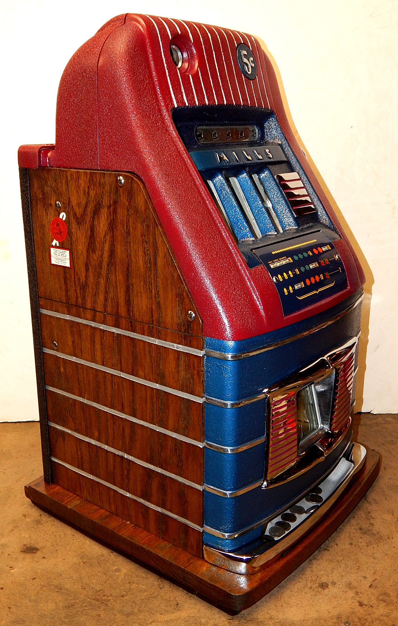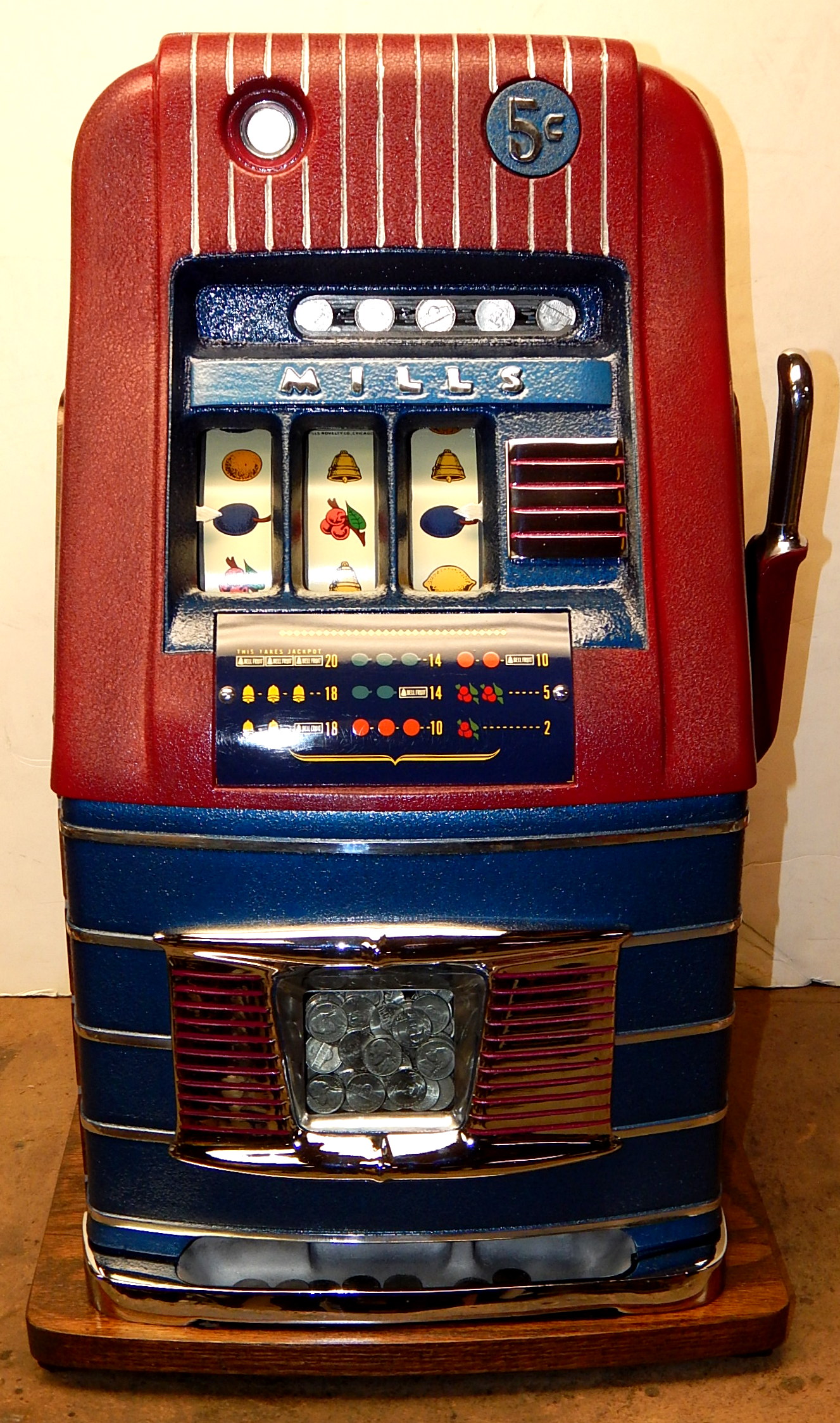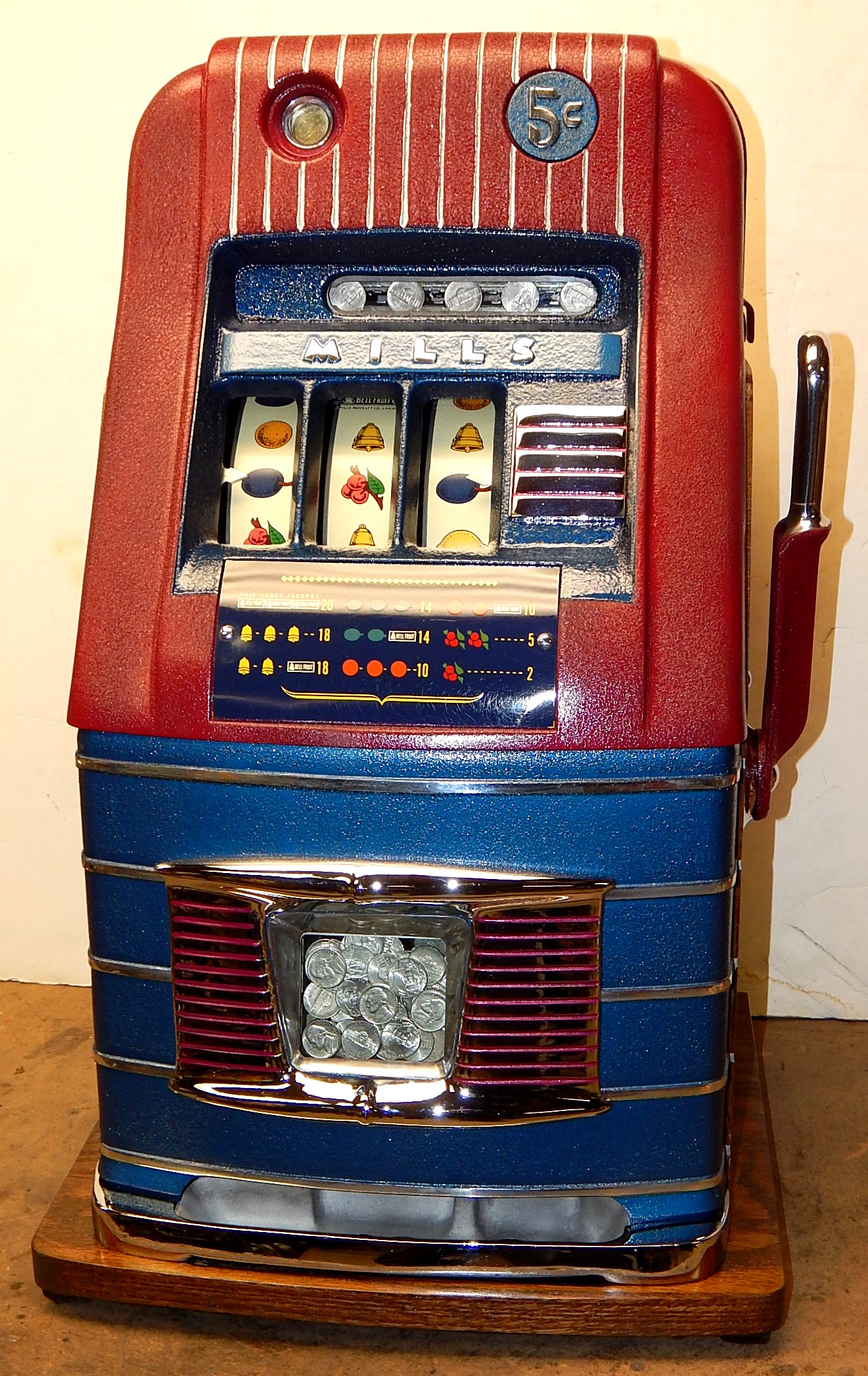 Mills 1946 Jewel Bell Hi-Top 5 cent, "restored" back to the original colors. Original award card, new reel strips, original back door, original cash box. Still has the original Mills stickers and serail number on the inside of the cabinet. Oak cabinet, all trim on this machine is chrome plated. Plays very easy.