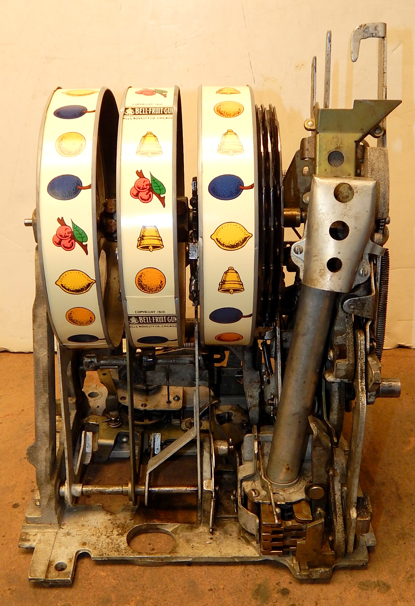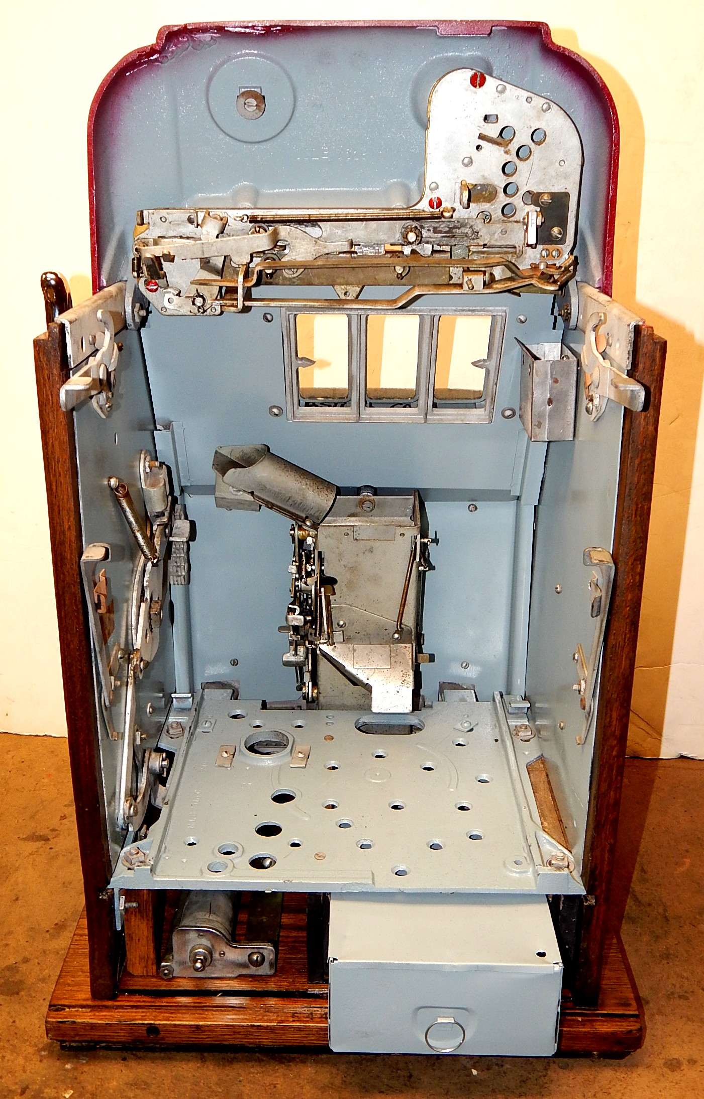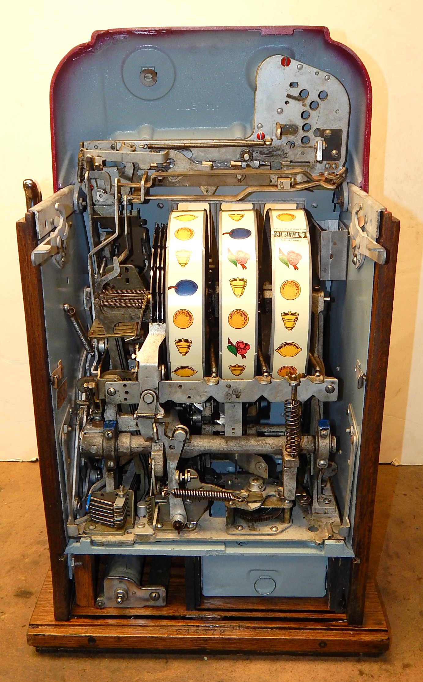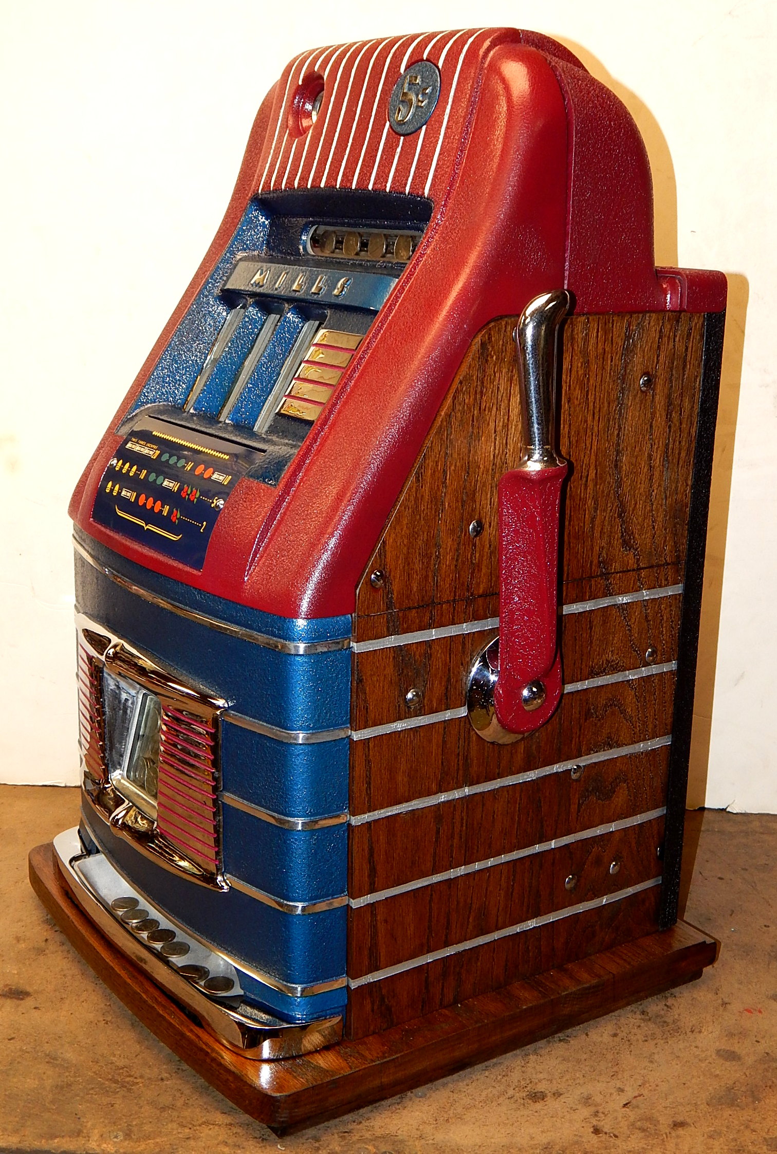 Mills 1946 Jewel Bell Hi-Top 5 cent, "restored" back to the original colors. Original award card, new reel strips, original back door, original cash box. Still has the original Mills stickers and serail number on the inside of the cabinet. Oak cabinet, all trim on this machine is chrome plated. Plays very easy.