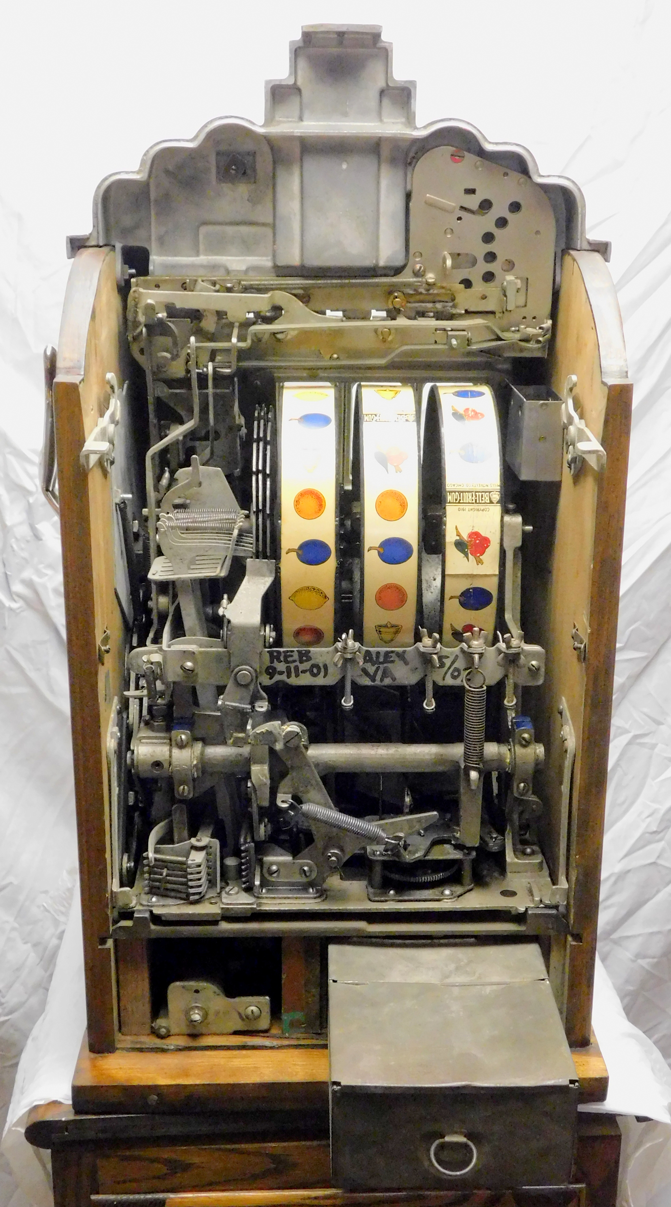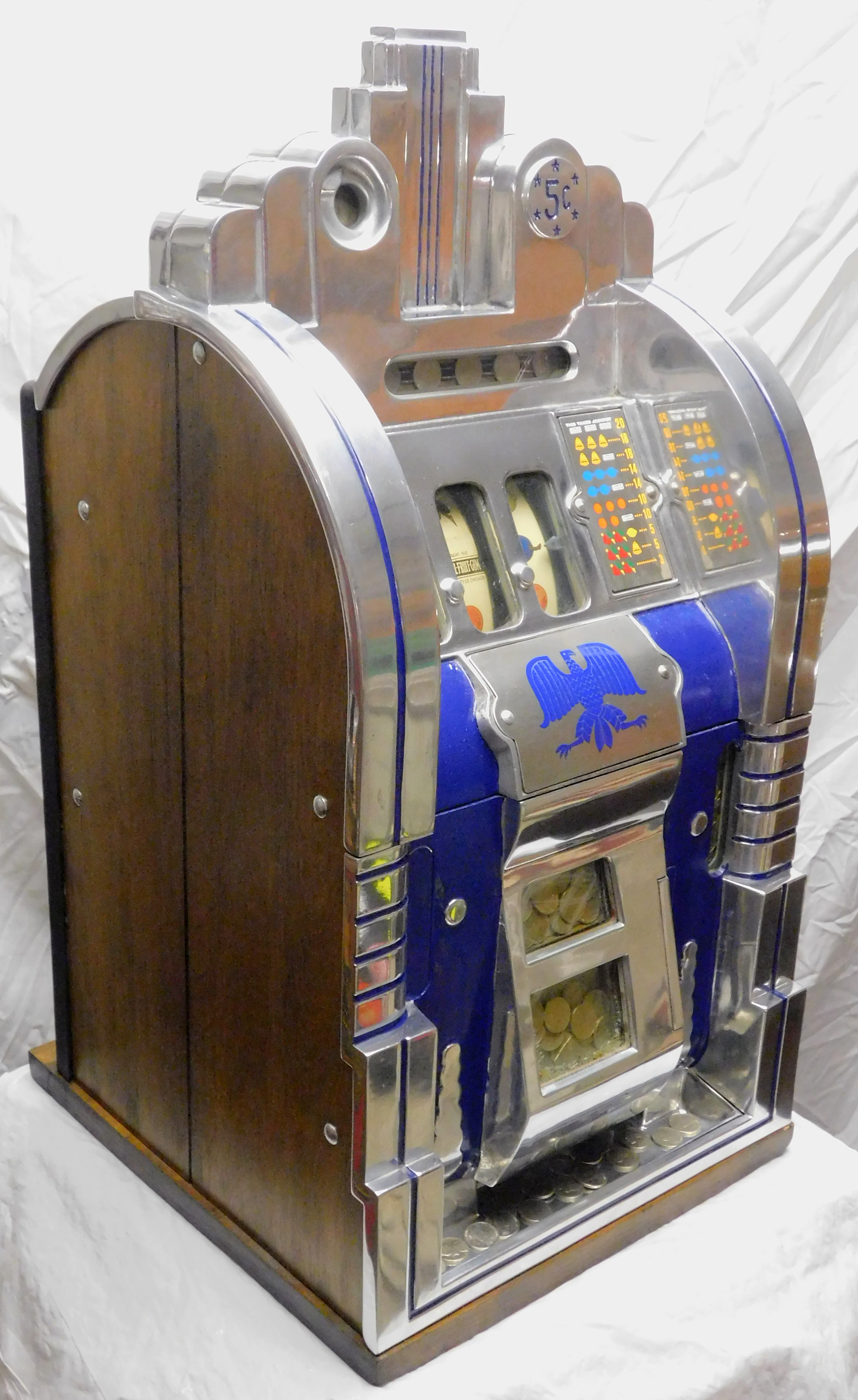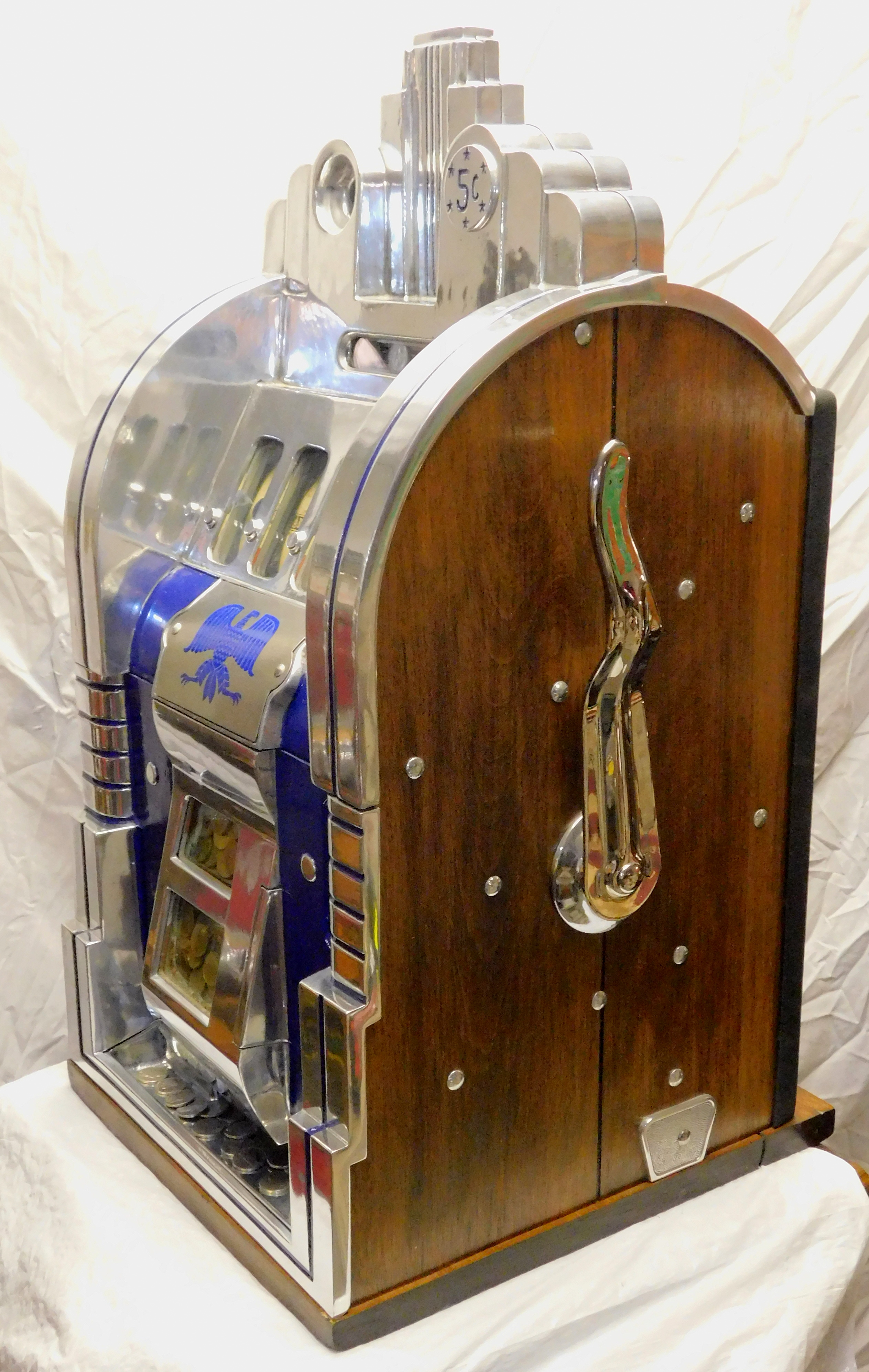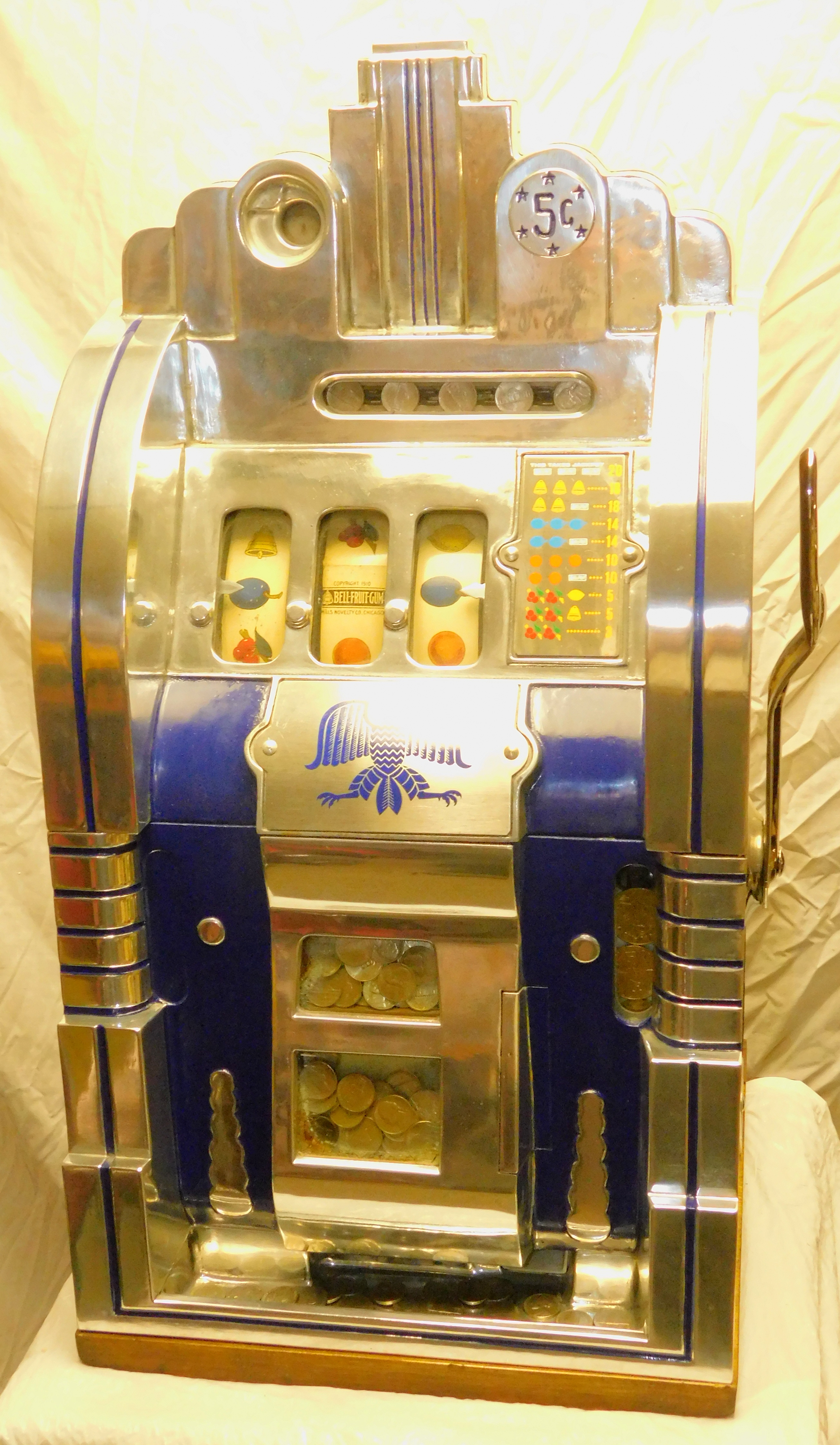 Mills 1937 Extraordinary 5 cent, This is a very nice machine restored. Polished, trimmed in blue. Jackpot with reserve, original back door with Mills lock and one key, extra nice cabinet, gold award is for "display only".
