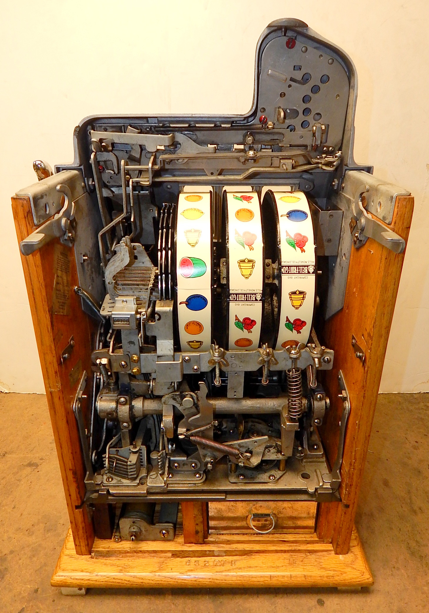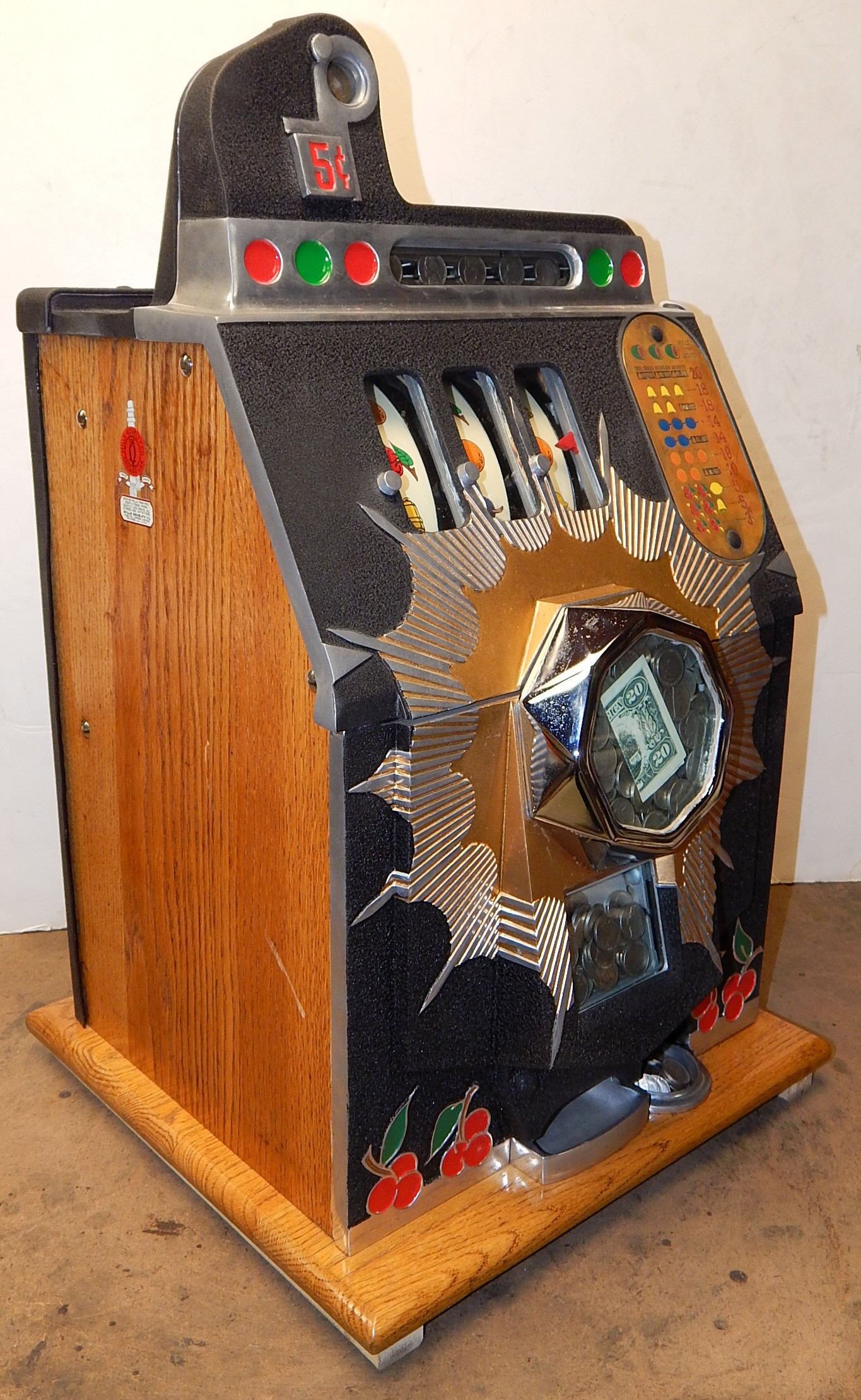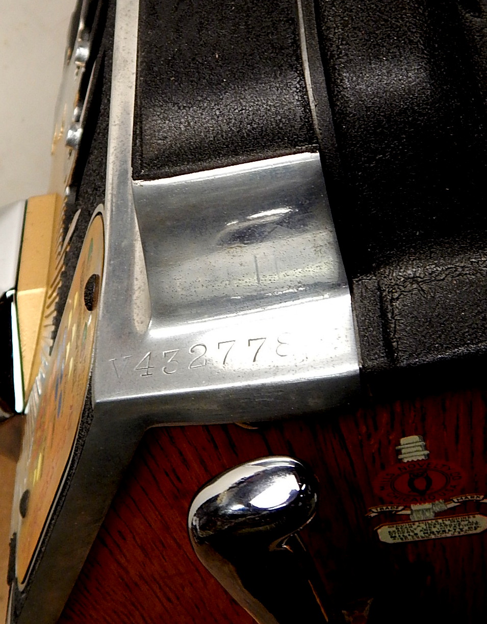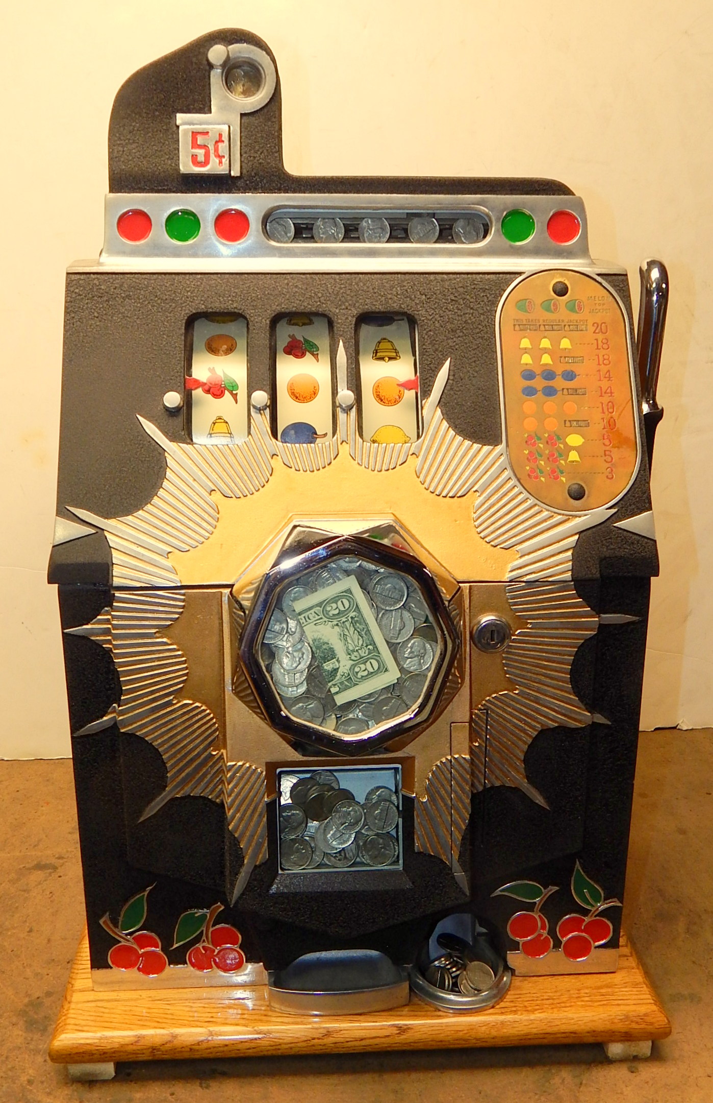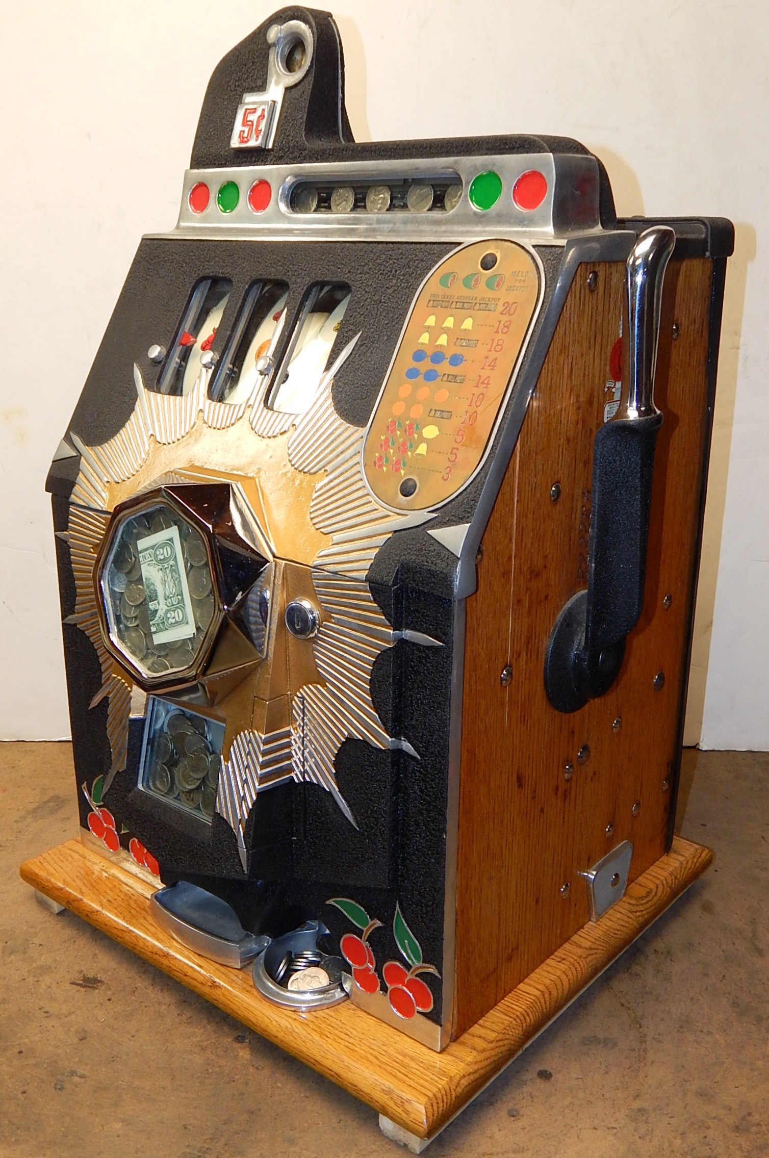 Mills 1938 Bursting Cherry "Melon Bell" 5 cent, previously restored, wrinkle black and gold, with red and green trim colors. Original award card, Jack pot with reserve, original back door and lock with one key, new cash box, new reel strips, new oak base on the cabinet. What is special about this slot machine is it has two Jackpots, one for three Bars and the other is for three Melons. The large diamond jackpot on the front was for the three melons. Back in the day operators would place a watch or paper money in the diamond on the front to attract more players. Plays very easy.