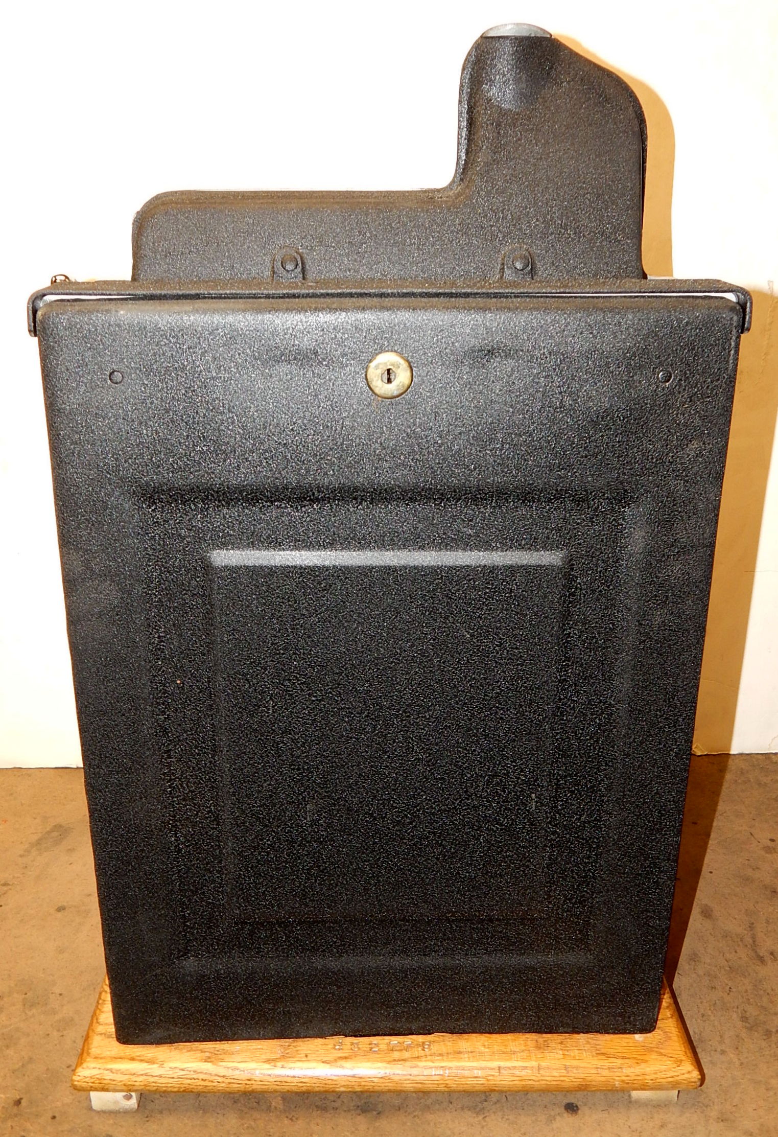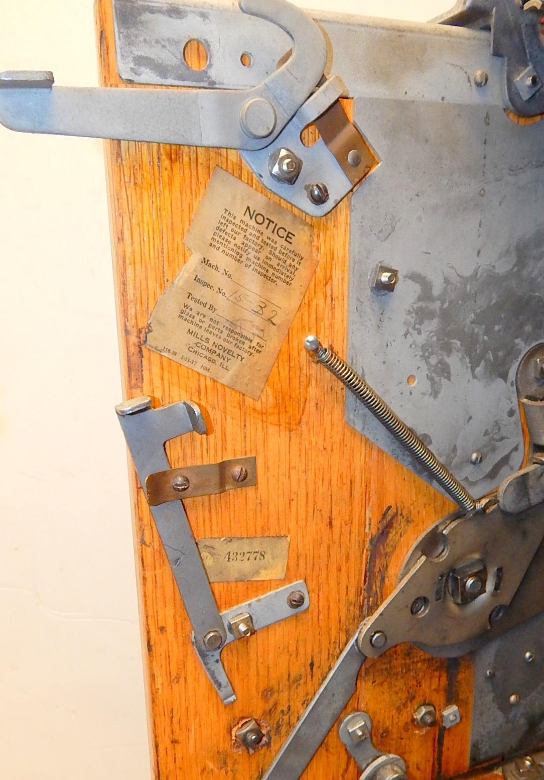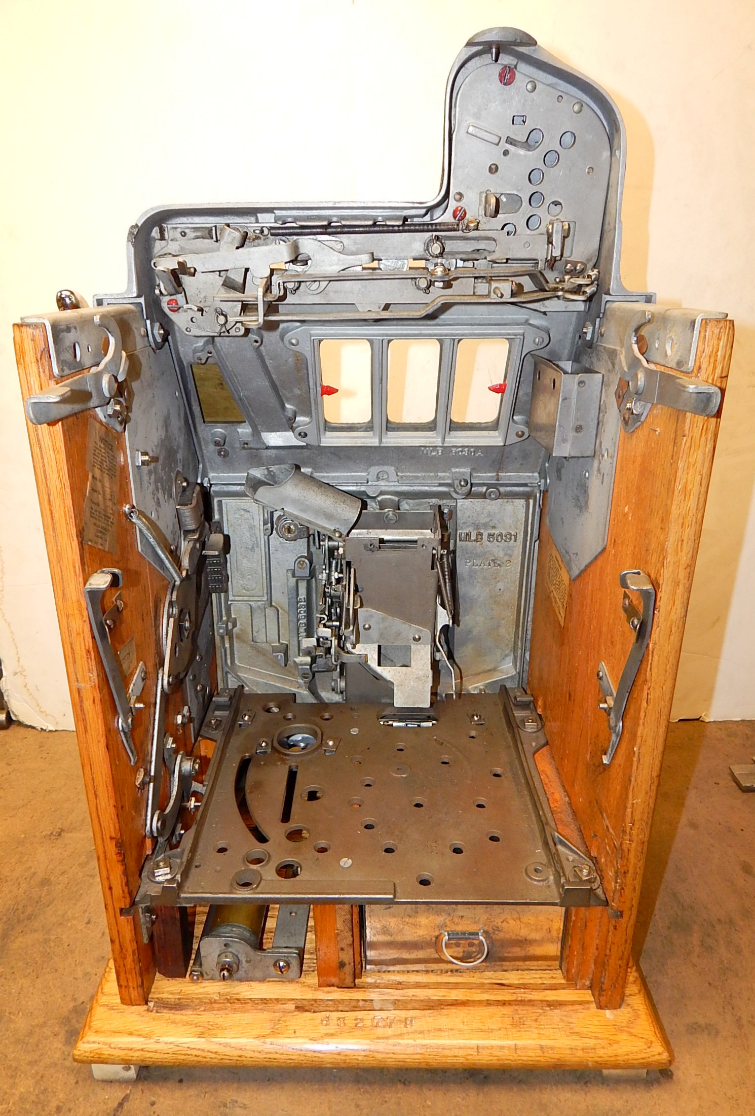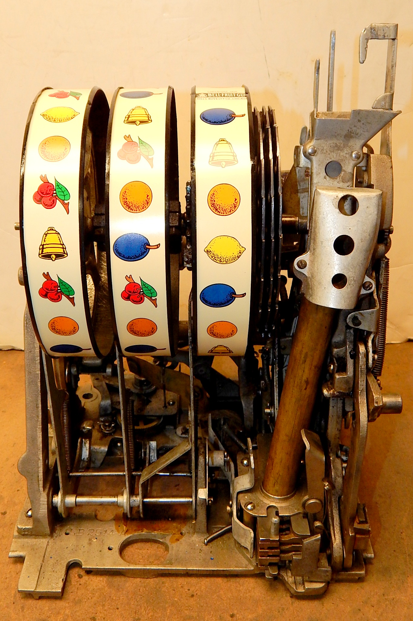Mills 1938 Bursting Cherry "Melon Bell" 5 cent, previously restored, wrinkle black and gold, with red and green trim colors. Original award card, Jack pot with reserve, original back door and lock with one key, new cash box, new reel strips, new oak base on the cabinet. What is special about this slot machine is it has two Jackpots, one for three Bars and the other is for three Melons. The large diamond jackpot on the front was for the three melons. Back in the day operators would place a watch or paper money in the diamond on the front to attract more players. Plays very easy.