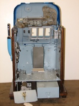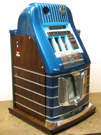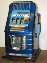 Mills 1947 "7-7-7 Jewel Bell"  Hi-Top $1.00,  This is a very nice large coin machine restored. Casting painted gloss blue, trimmed in light blue. Original condition award card, original back door with Mills lock, original cash box, original cash box door with Mills lock. All oak cabinet. Plays very easy.