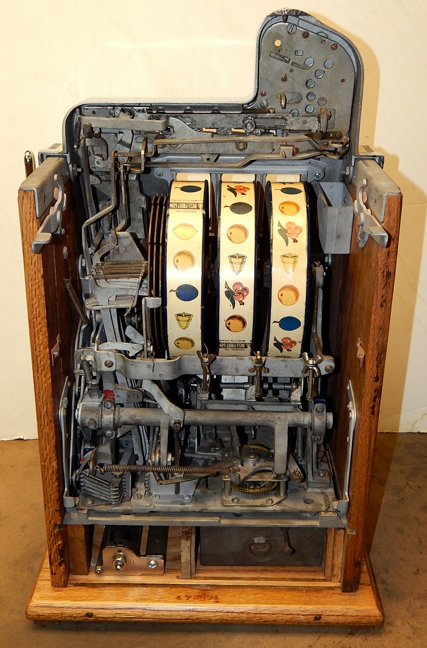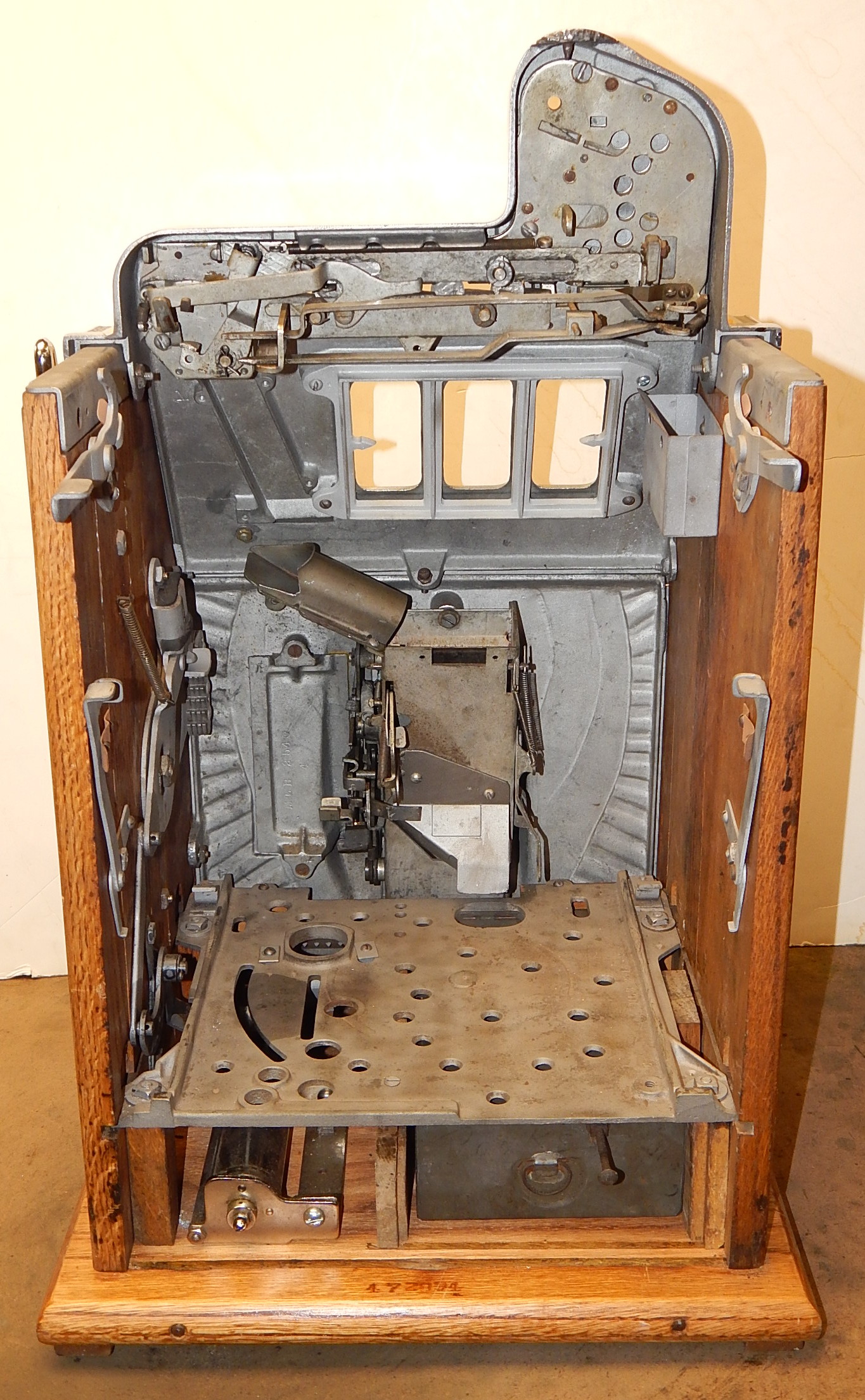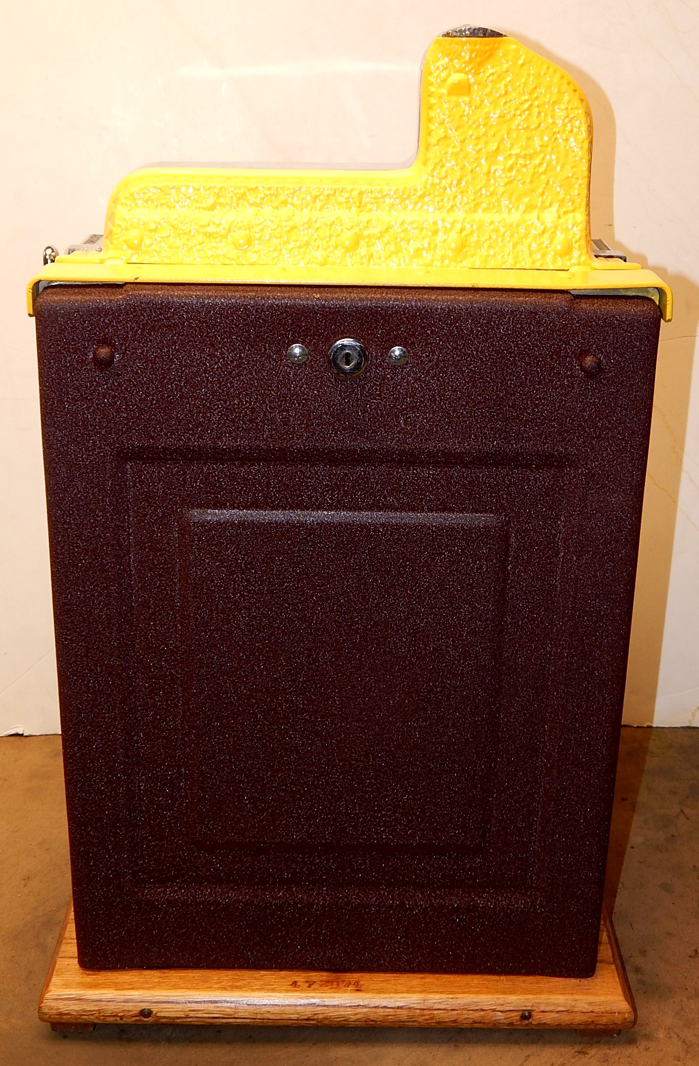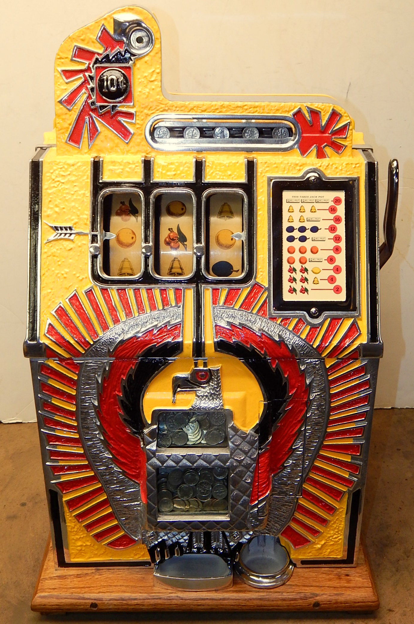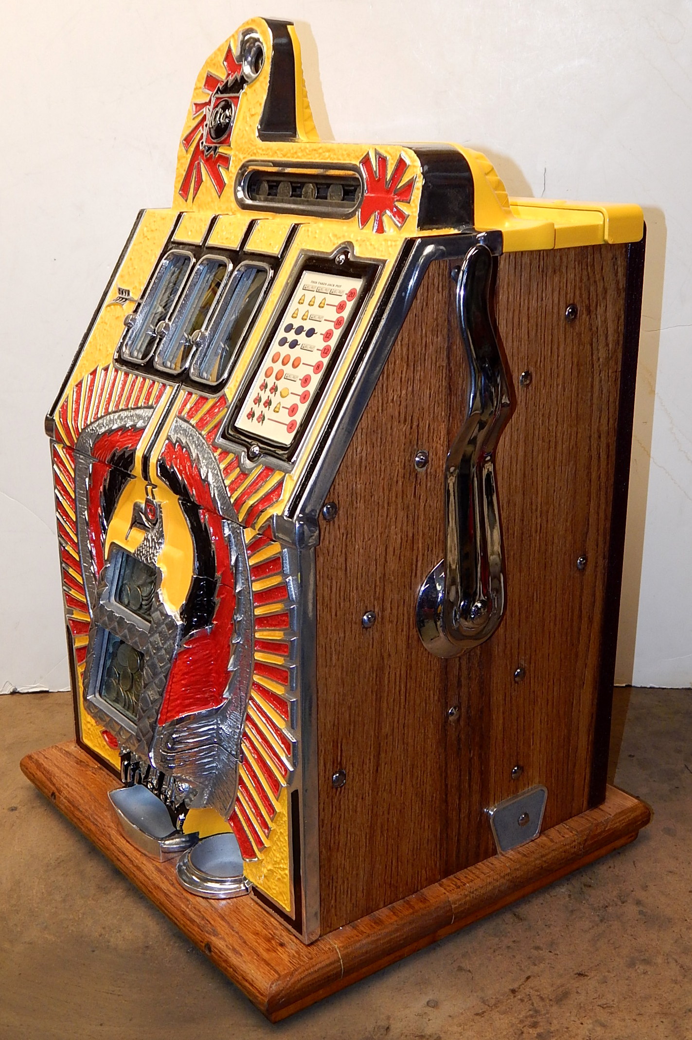 Mills 1931 War Eagle 10 cent, this is a very nice machine complete and original. This machine was restored back to the original colors, Yellow, trimed in Red, Black. Has Jackpot with reserve, original back door with Mills lock with two keys, original "Tin Reel Strips", original cash box. The award card on this machine is an reproduction, along with the decal on the side. Plays very nice.