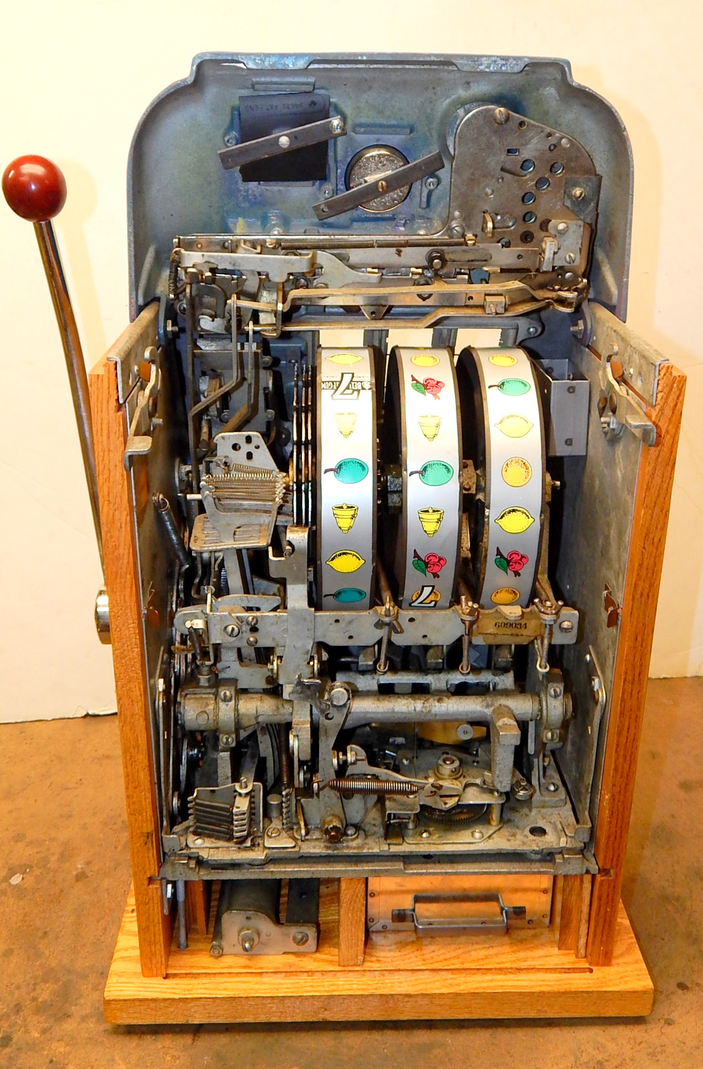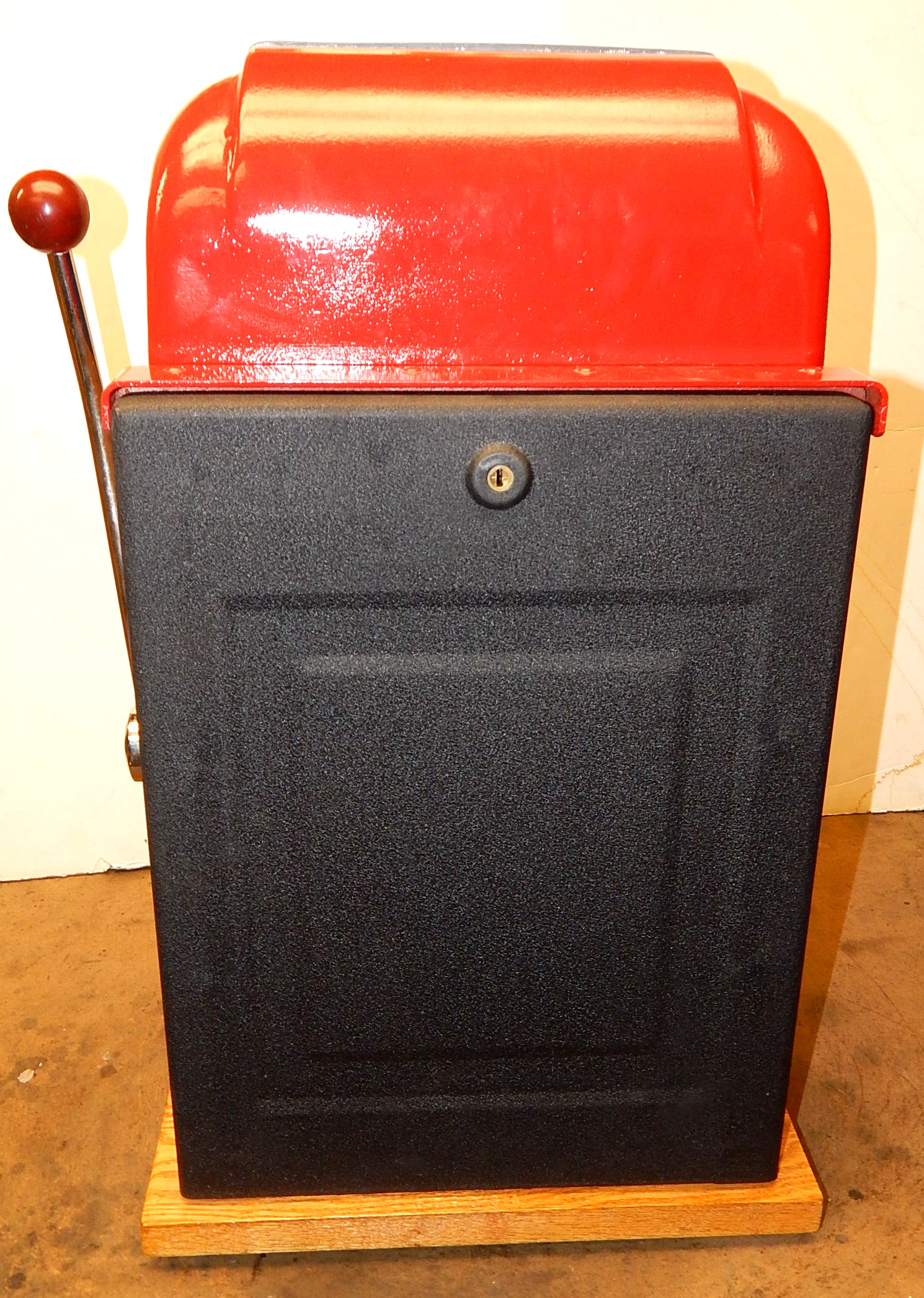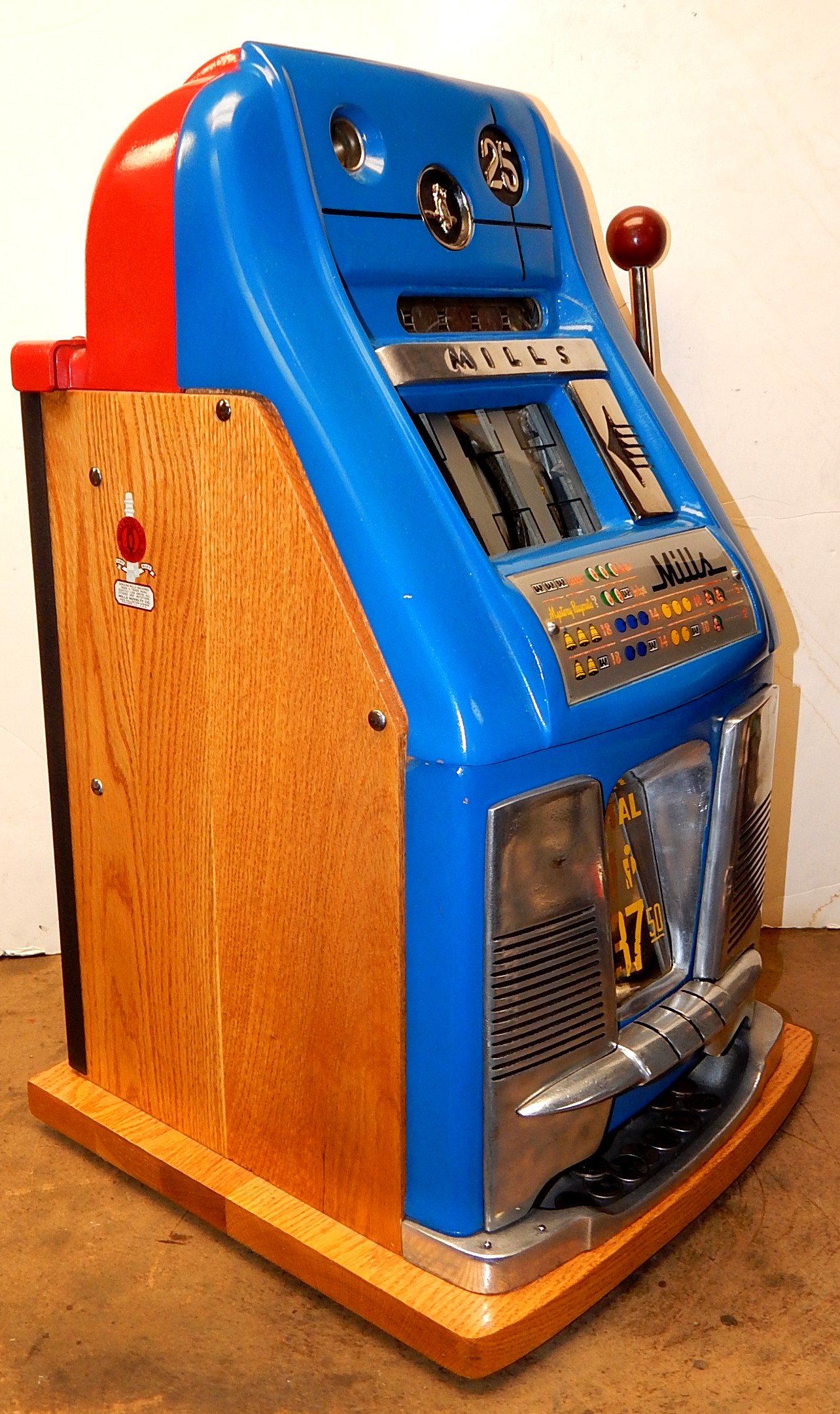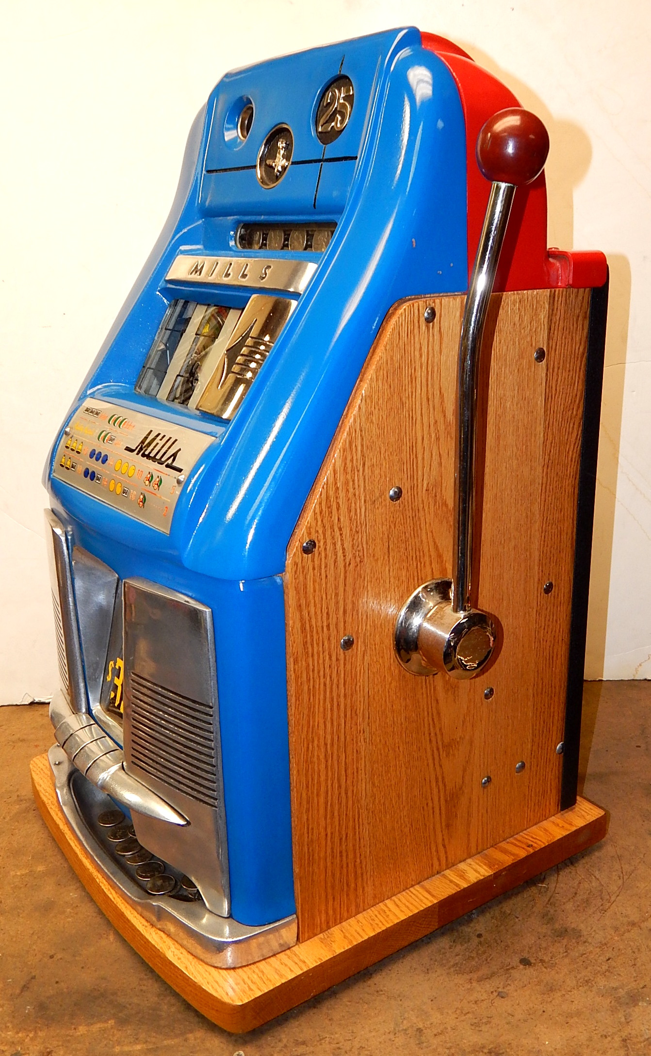 Mills 1960 " 7-7-7 " Hi-Top 25 cent, This is a very nice previously restored machine. Gloss blue, black and red, new cash box, original back door with original Mills lock and key, guaranteed Jackpot, new reel strips, very nice oak cabinet.