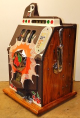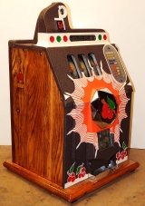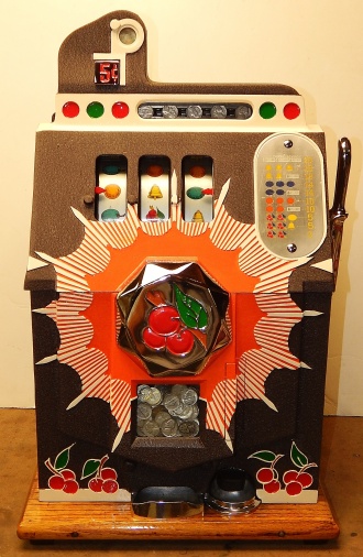 1938 Mills Bursting Cherry 5 cent . This is a very nice cast iron machine restored back to it original colors, Wrinkle brown and Orange, with white, red and green trim colors. Original condition award card, Jack pot with reserve, original back door and original Mills lock with one key, original cash box. Plays very easy, pays as it should.