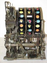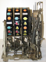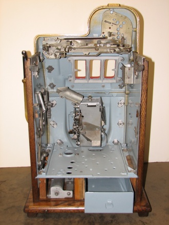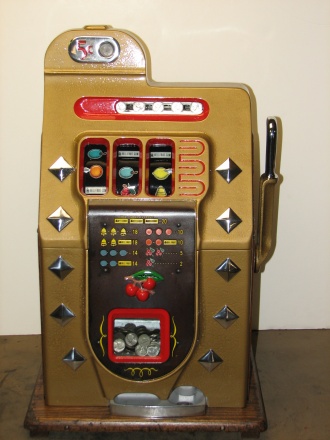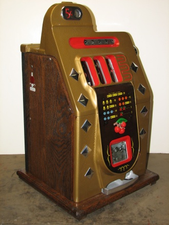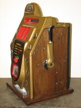Mills 1940 Diamond Front 5 cent. This is a very nice machine restored in Hammer tone Gold finish trimmed in red. The cabinet on this machine has a beautiful oak wood finished and stained to bring out it's natural beauty. Mint condition award card, Jack pot with reserve, original back door and lock with two keys, original cash box. mint condition reel strips. Plays and pay as it should, 2-5 payout.