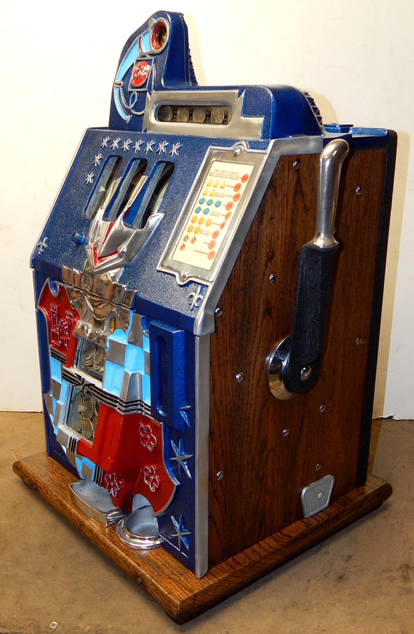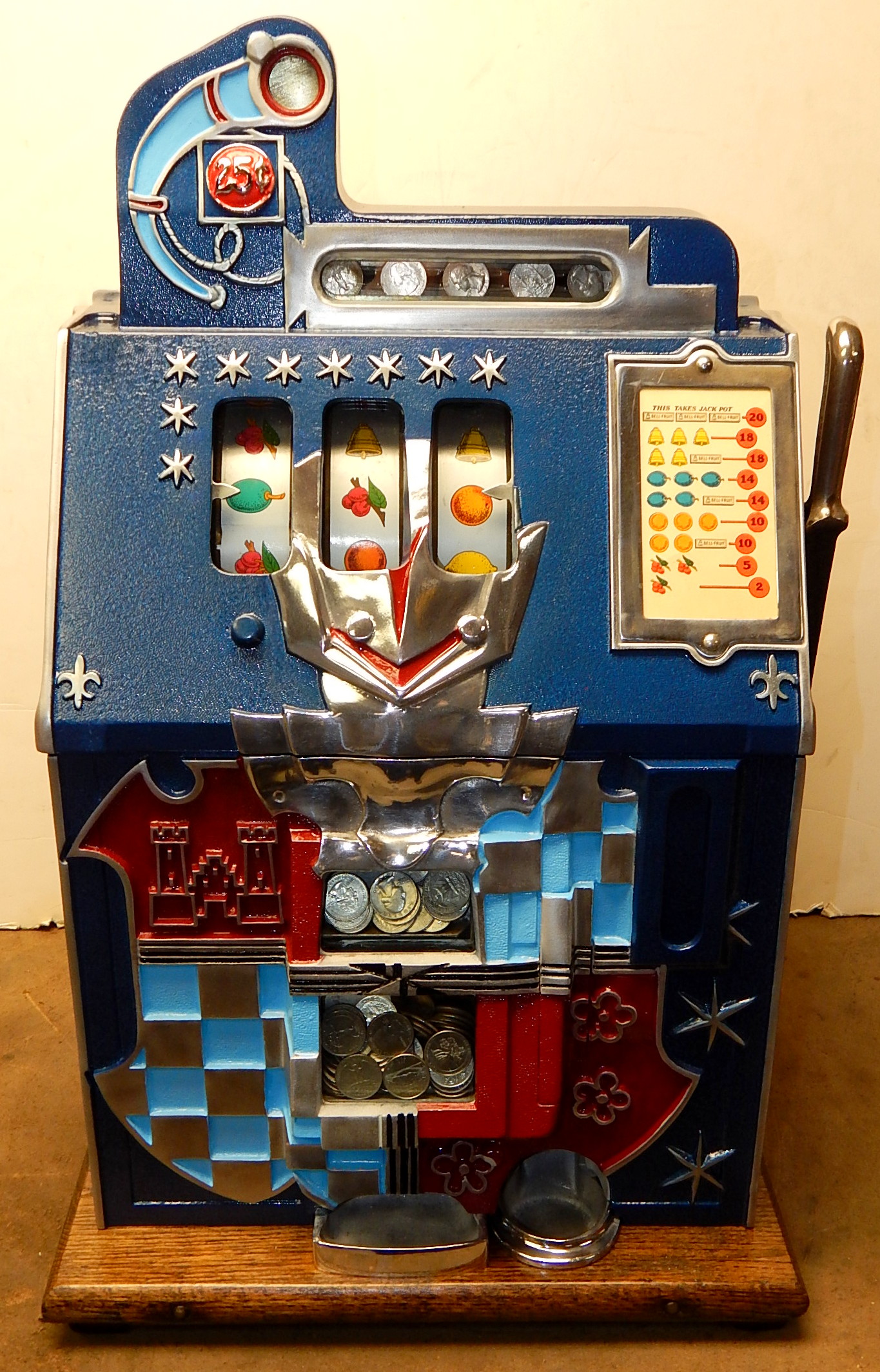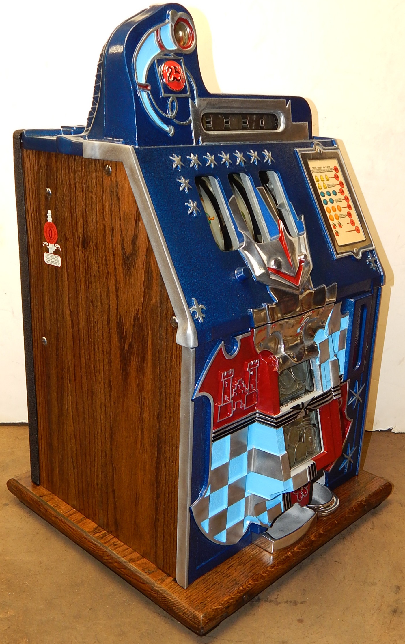 1935 Mills Castle Front 25 cent, in restored condition with working Jackpot and reserve, original Reel Strip in mint condition, original back door, original lock with one key, original cash box. 3-5 play out. Plays very easy.