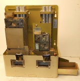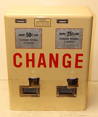 Takes quarters or fifty cent pieces, gives back either five nickels for a quarter or ten nickels for fifty cent. These machines were used in arcades, or any where that nickels were used to operator anything. I remember see them in places were slot machines were being played. Many county's in the state of Maryland back in the 60s only allowed nickel machines to be operated, so these machines were a big hit, no one had to be there waiting to give out change.