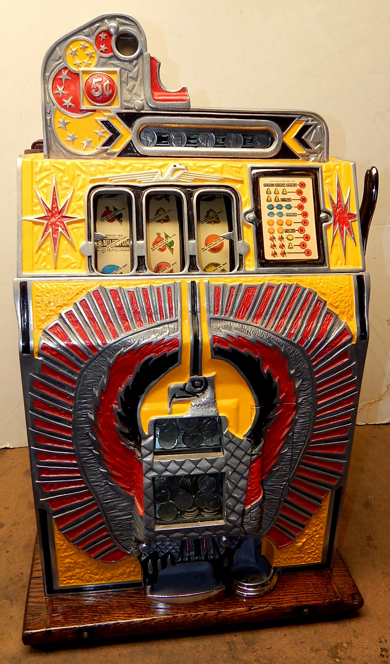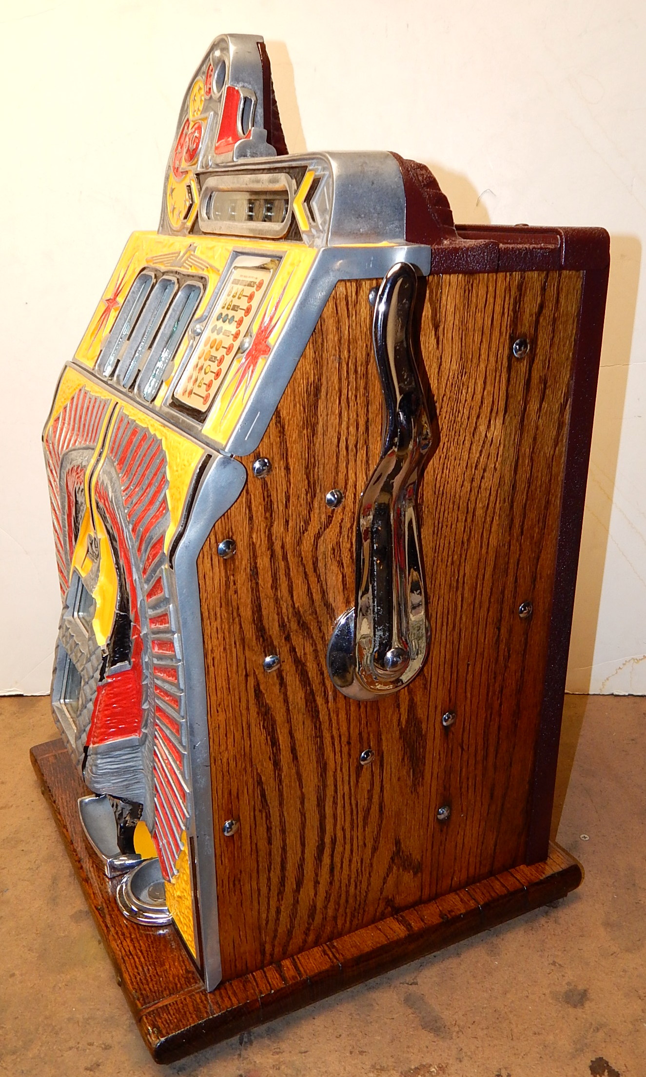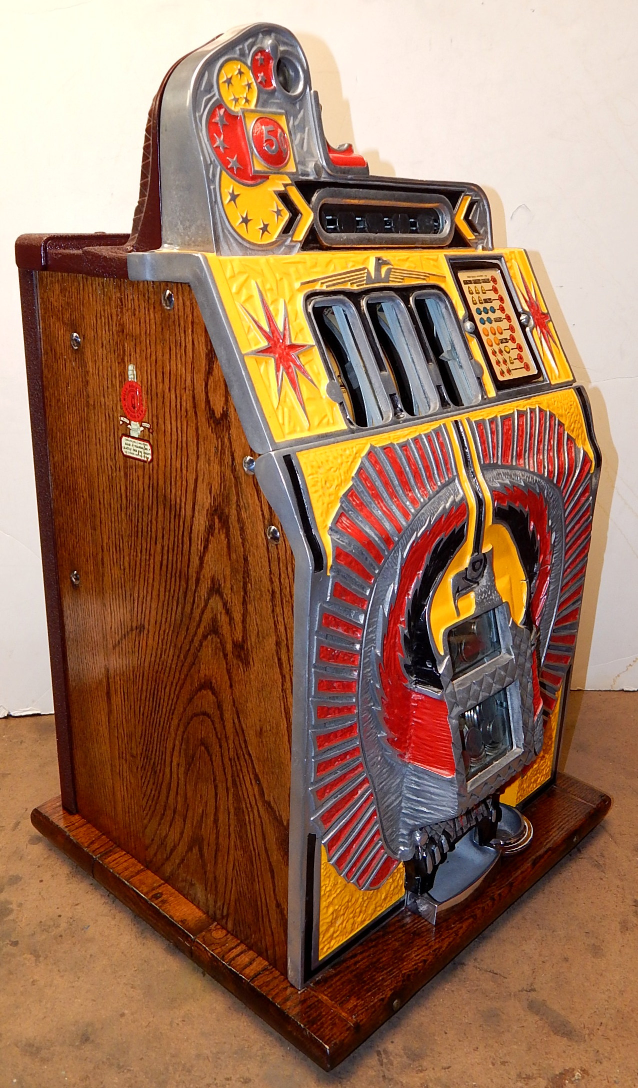 Mills 1933 War Eagle "Rock-ola"5 cent, previously restored back to the original colors, Yellow, Red , Black. Jackpot with reserve, original back door and lock with one key, original cash box, very nice oak cabinet. Plays very easy.