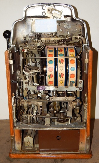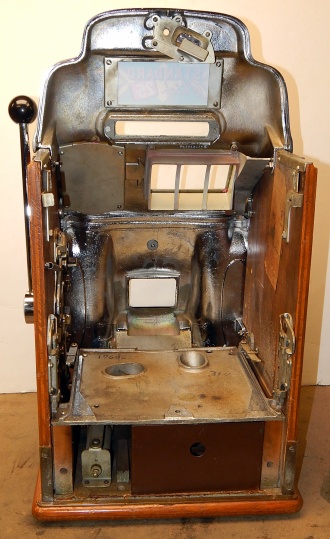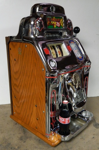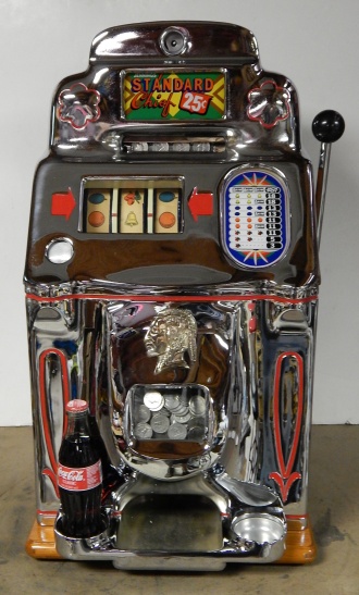 1947 Jennings Standard Chief 25 cent. Everything on this machine is original but, the chrome plating. Chrome is a 9 out of 10. Original back door, original cashbox, ace lock, oak cabinet, drink and ash tray holder on the front. Play easy.