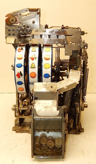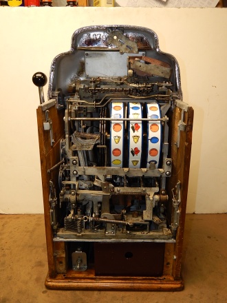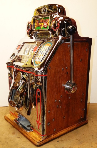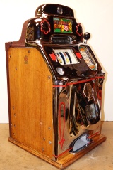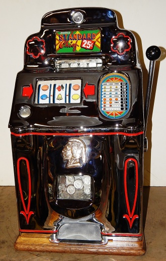 1947 Jennings "Chrome" Standard Chief 25 cent, a very nice machine. The chrome plating on this machine is a 9 out of 10, just beautiful. Everything on this machine is original but, the new chrome plating. Original cash box, original back door with Ace lock and key. 3-5 payout