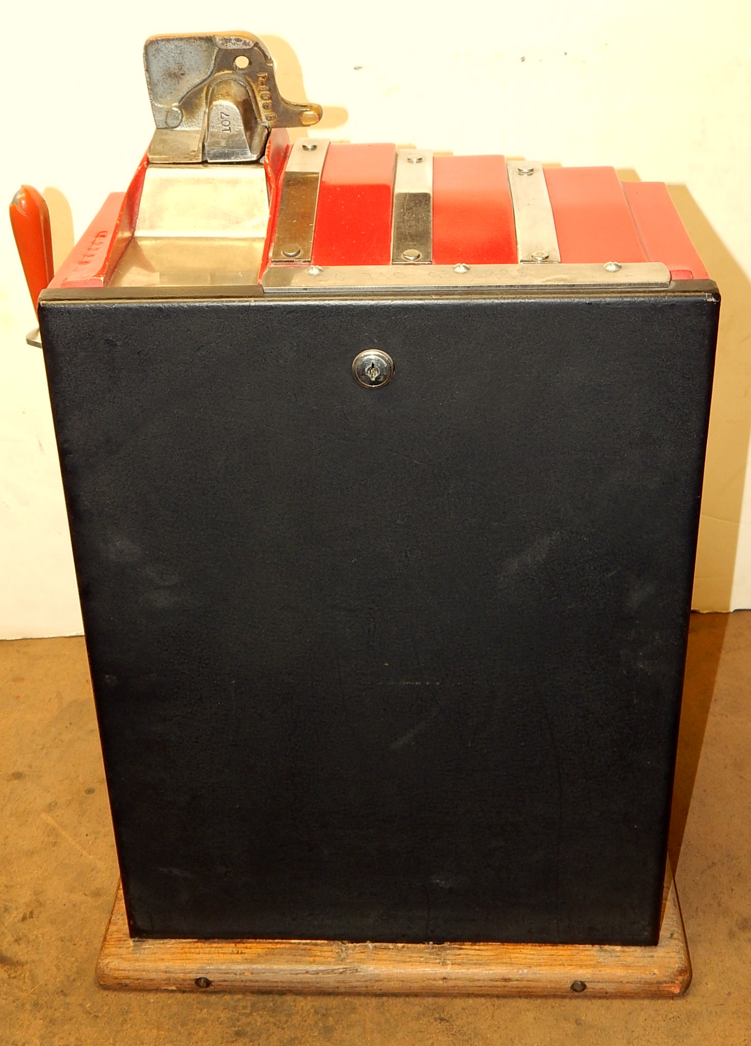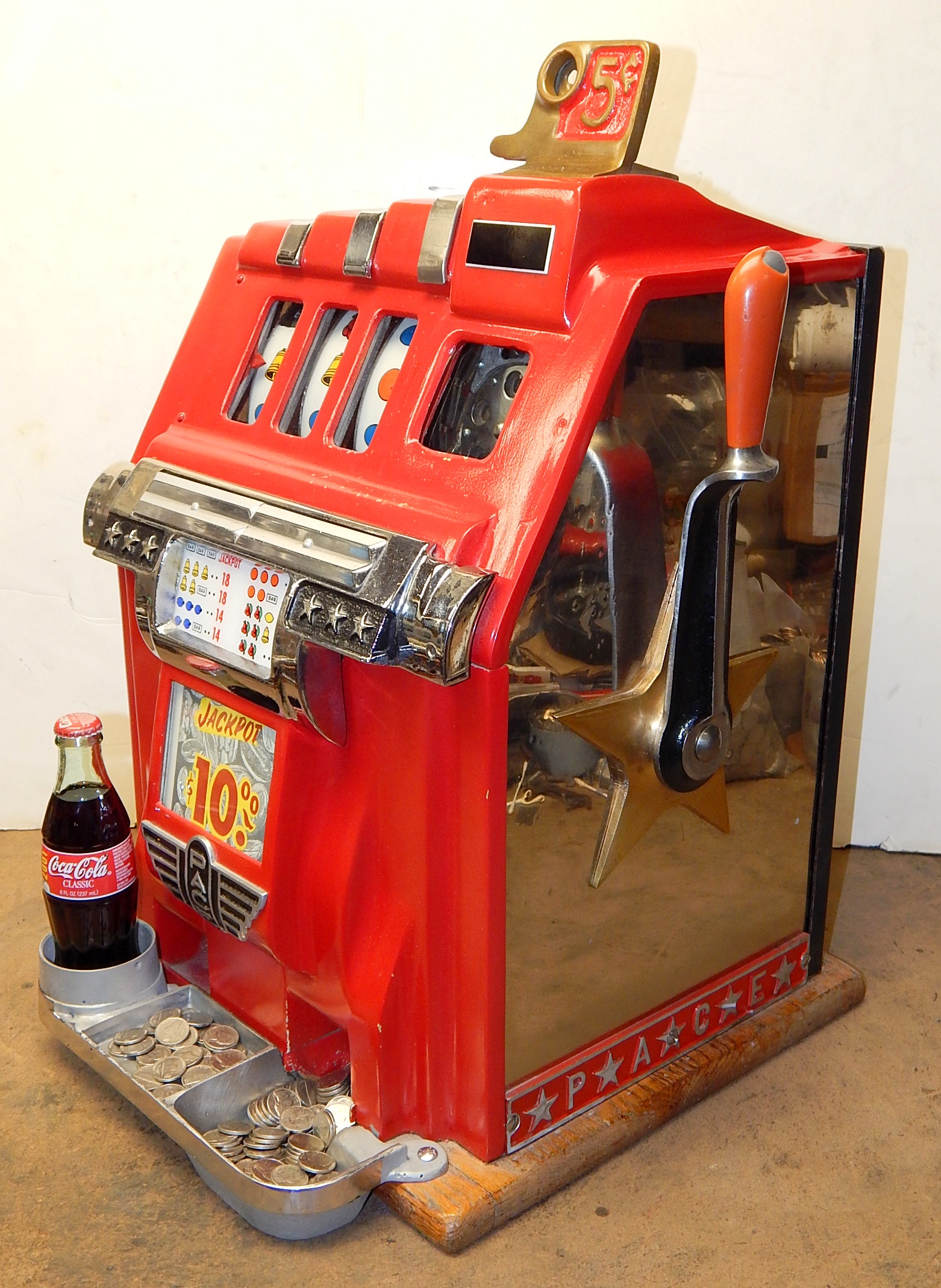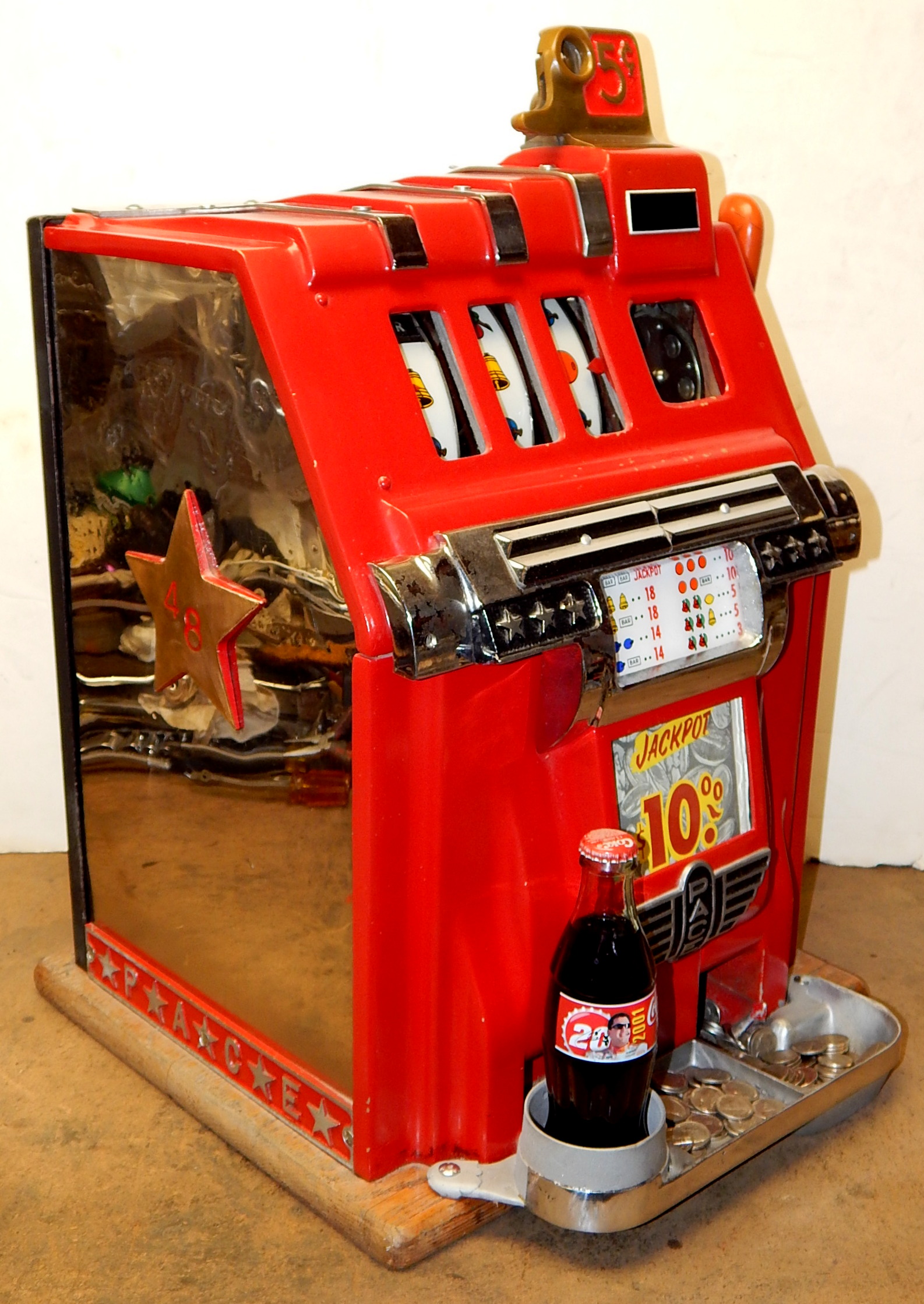 1949 Pace "Harold's Club 6 star", 5 cent. This is the "Private Label" Pace 6 Star, a variation of the single "Guaranteed sign Jackpot" model of the Pace Deluxe Chrome made for Harold's Club in Reno Nevada. Original reel strips, original back door, with Pace lock and key, new cashbox with drink holder. This is the first one we have ever had. Both sides have a beautiful high polish stainless steel plates, looks like chrome. The machine has a few small coin chips in the paint on the front. Play's very easy.