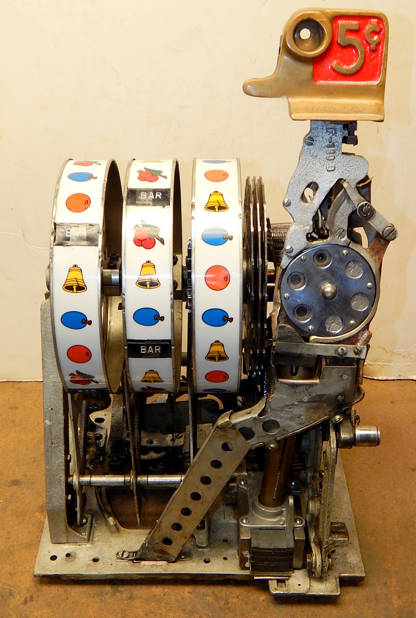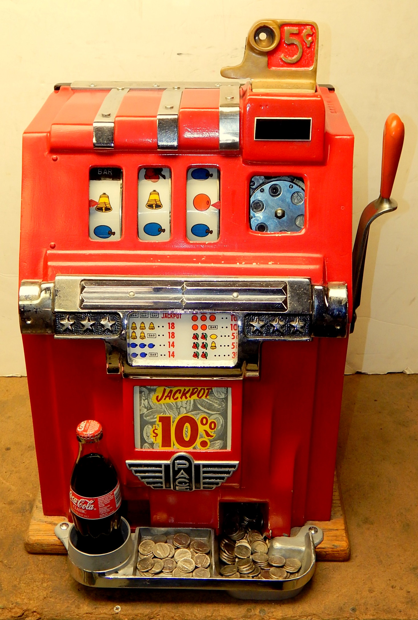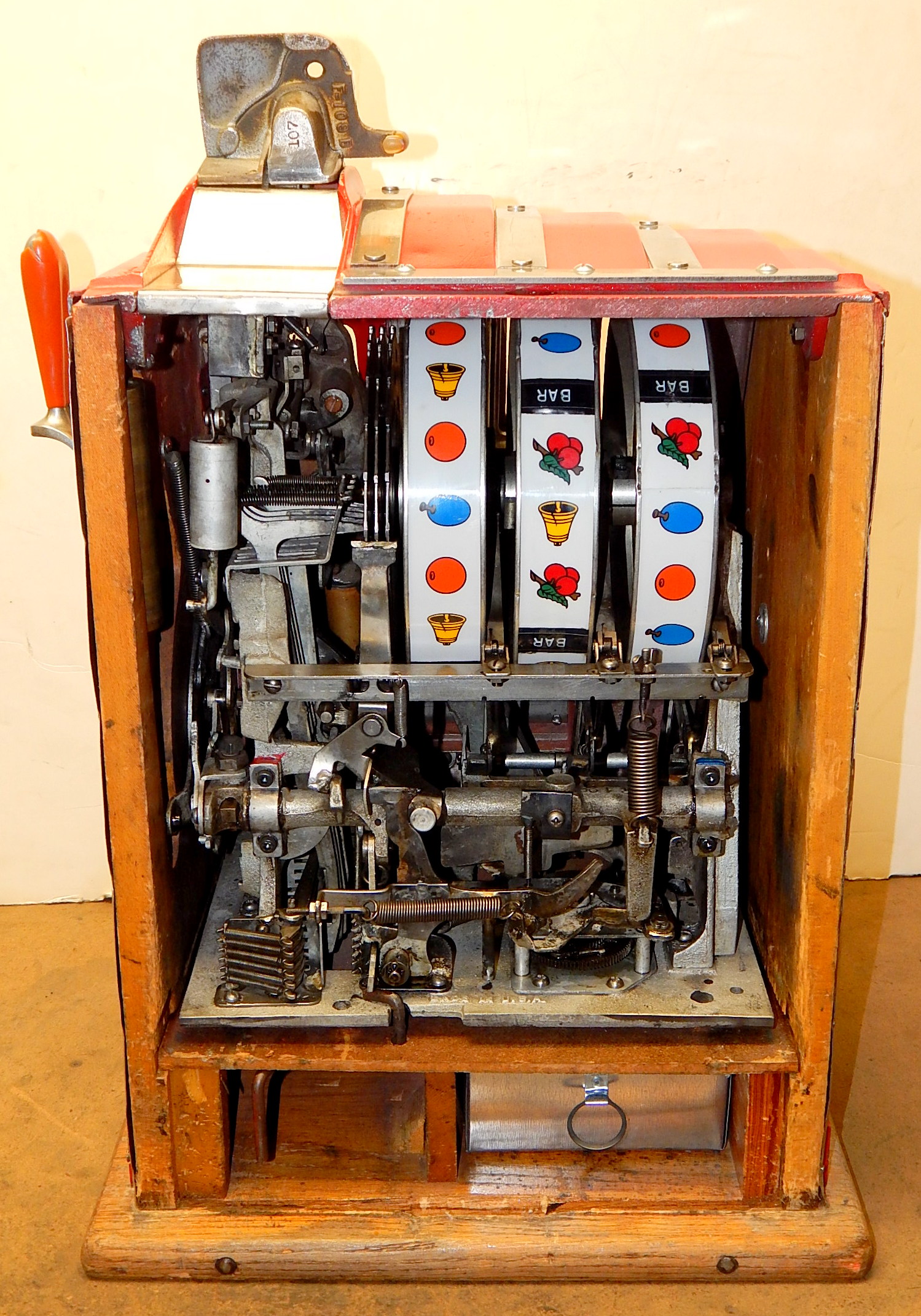 1949 Pace "Harold's Club 6 star", 5 cent. This is the "Private Label" Pace 6 Star, a variation of the single "Guaranteed sign Jackpot" model of the Pace Deluxe Chrome made for Harold's Club in Reno Nevada. Original reel strips, original back door, with Pace lock and key, new cashbox with drink holder. This is the first one we have ever had. Both sides have a beautiful high polish stainless steel plates, looks like chrome. The machine has a few small coin chips in the paint on the front. Play's very easy.