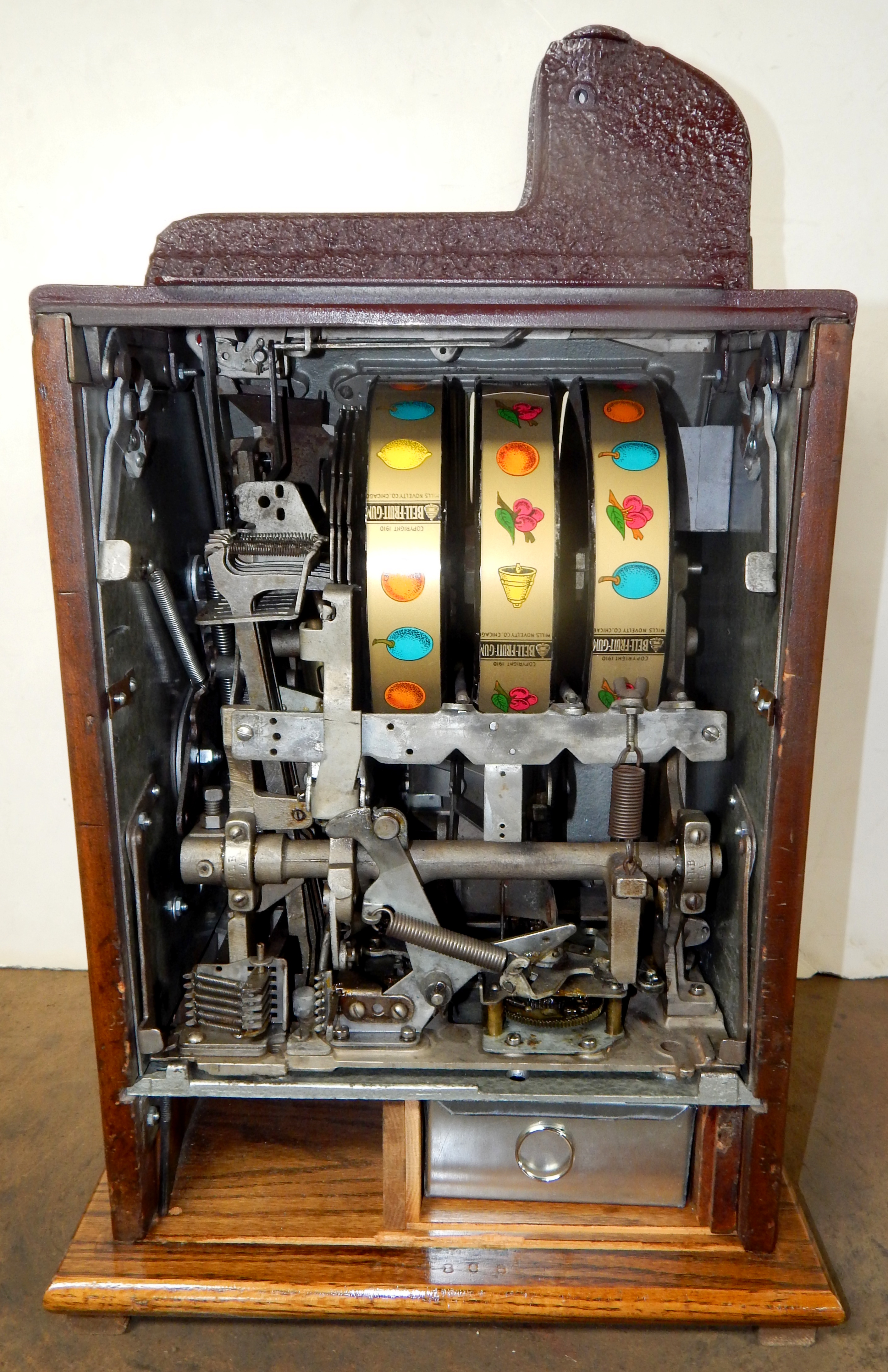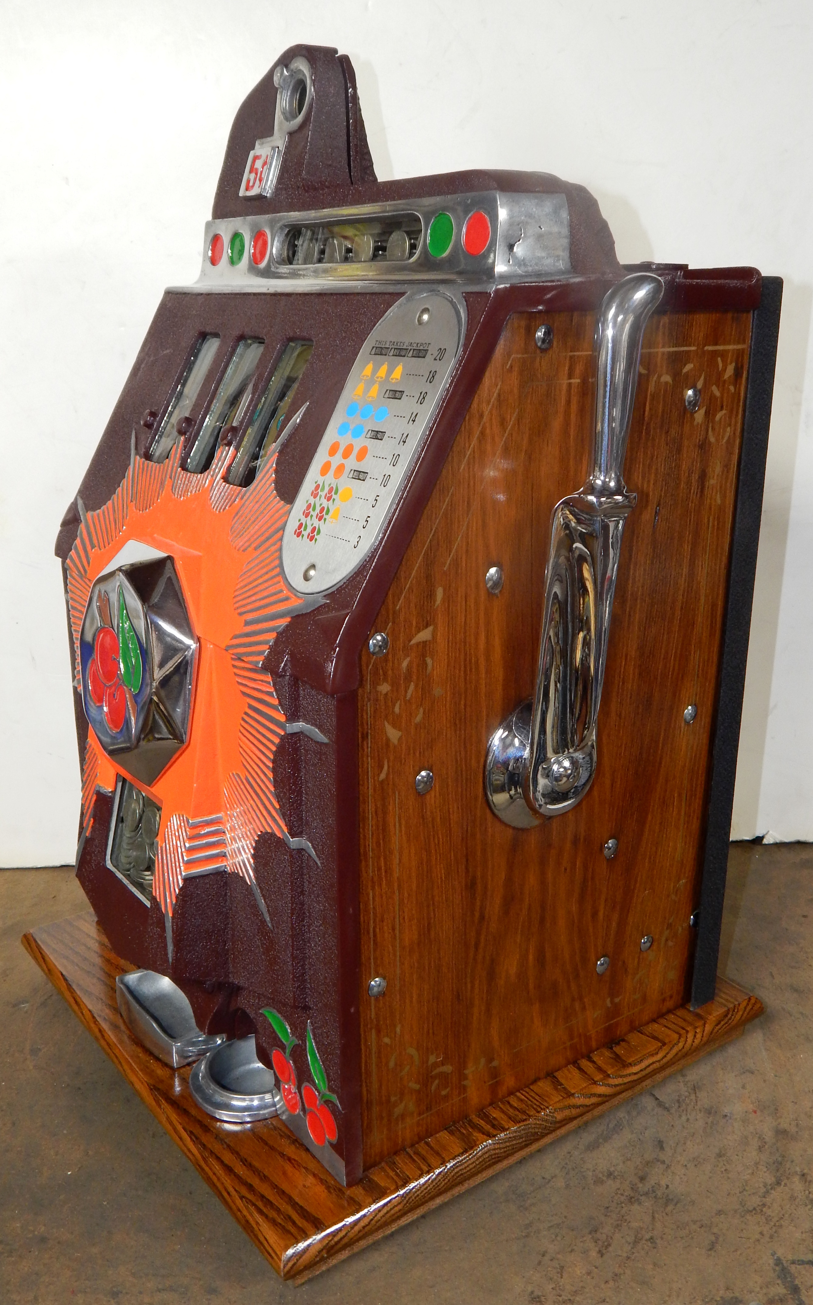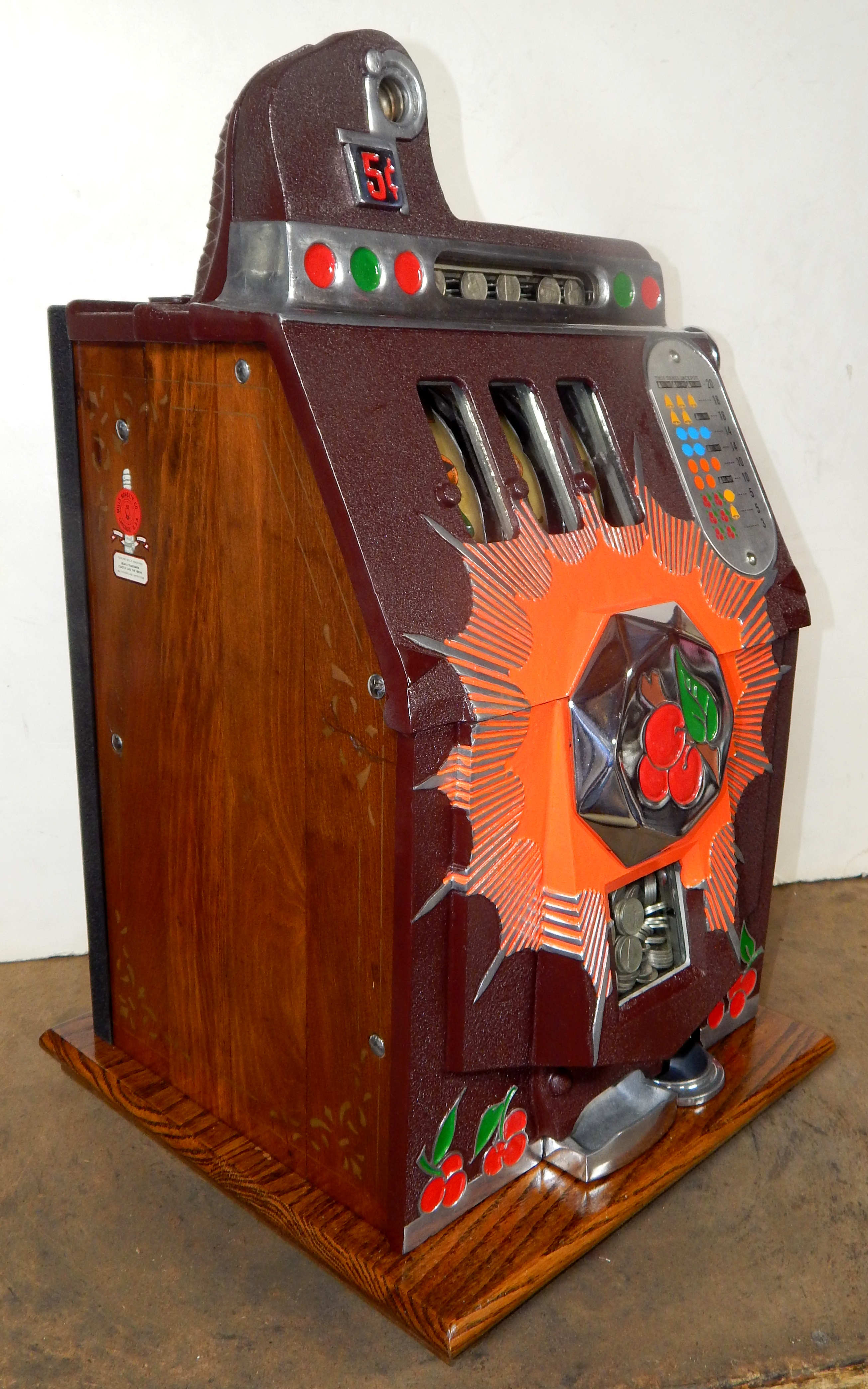 1938 Mills Brown Front "Bursting Cherry", 5 cent . This is a very nice restored condition machine, with red and orange trim colors.  Jackpot with reserve, new cash box. Beautiful oak cabinet. Plays very easy, pays as it should.