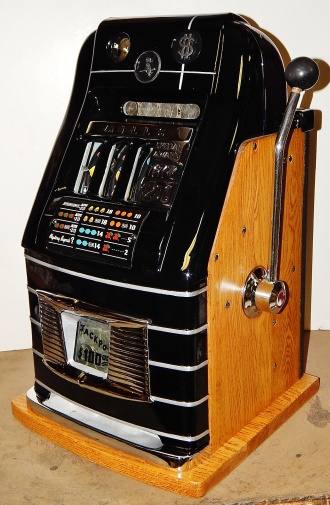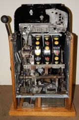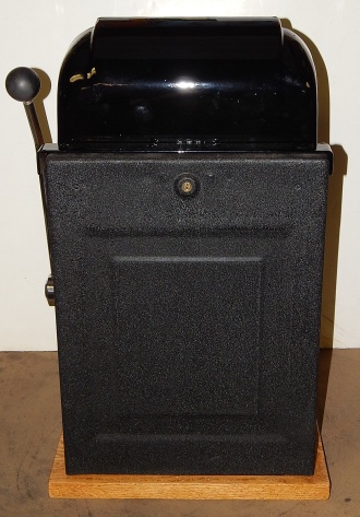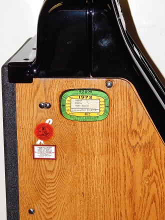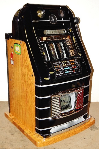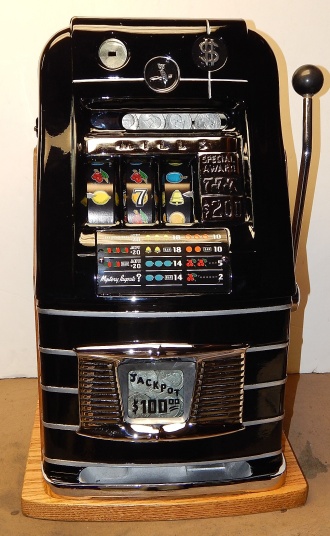 Mills 1946 "7-7-7" Hi-Top $1.00, This is a very nice hard too find large coin machine restored. Comes with guaranteed jackpot $100.00 Casting powder coated gloss black, trimmed in sliver. All the trim on this machine has been chrome plated to add to this beautiful machine. Original condition award card, original back door with Mills lock, original cash box, new reel strips. All oak cabinet, cabinet base has been replaced. Comes with 100 dollar tokens. Still has the South Carolina slot machine tax commission stamp on the side from May 17, 1973 Plays very easy.
