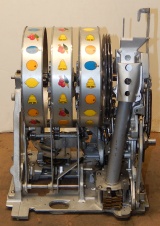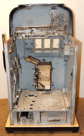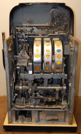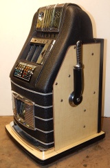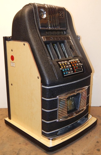 Mills 1948 Hi-Top 25 cent. This is a very nice machine restored in wrinkle black. The cabinet on this machine has a laminate oak wood finished. Mint condition award card, Jack pot with reserve, original back door and lock with one keys, original cash box, original reel strips. Plays and pay as it should, easy to play.