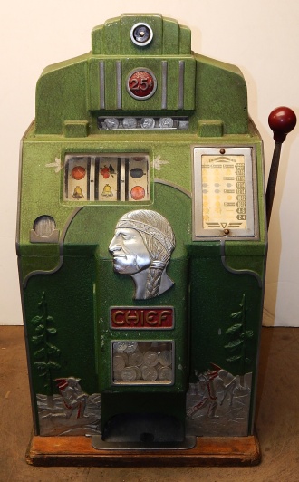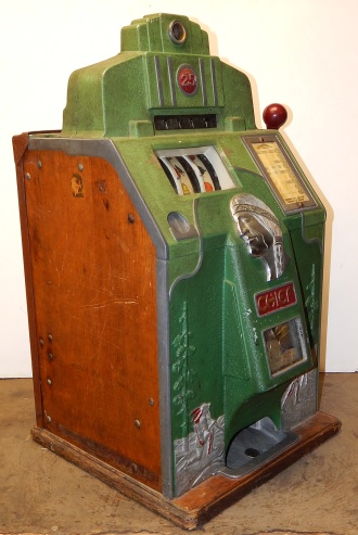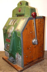 1937 Jennings "Hunting Scene" Chief, 5 cent. Oak cabinet, original cash box, original back door, original reel stripes. Original locks on back door with ODJ keys.