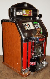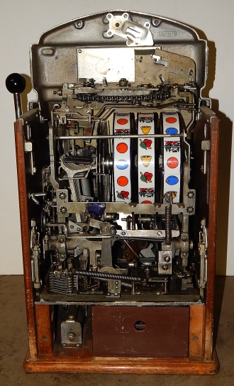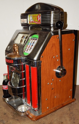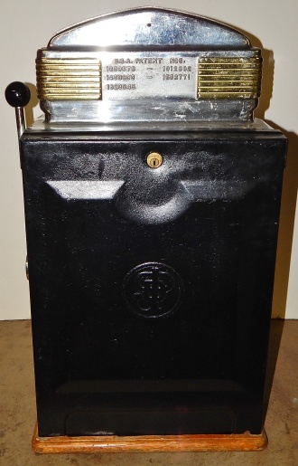 1949 Jennings Sun Chief "Nevada Club", 5 cent. Very nice original machine not restored, the original chrome on this machine is 8 out of 10. Has the original cash box, original back door with original Yale lock and key ,original Nevada Club reel stripes and Award Card. If you are looking for a nice all original machine here it is. This is not a light-up machine, it has a solid metal front that is painted Red.
