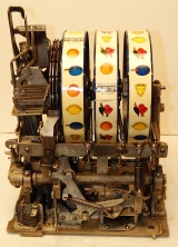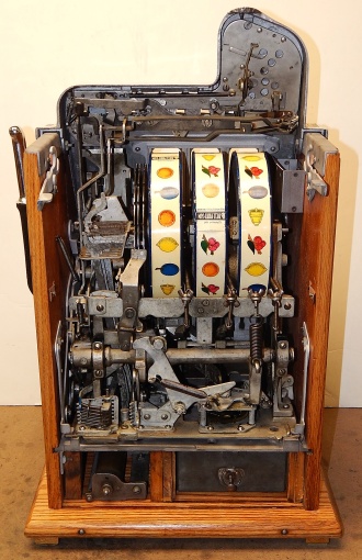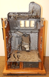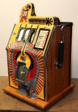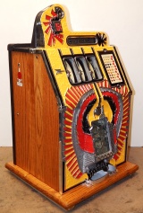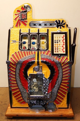1939 Mills War Eagle 5 cent, restored back to the original colors. Super nice original oak cabinet, has a rare front load Jackpot, original back door, nice original reel strips, original cash box, new award card. Plays very easy and pays as it should.