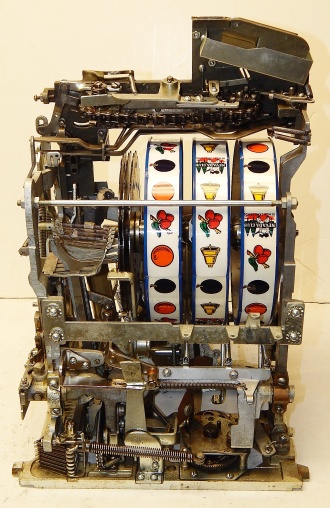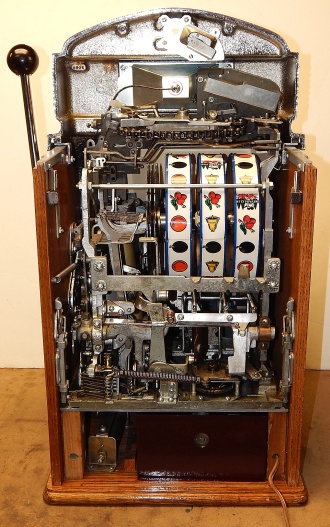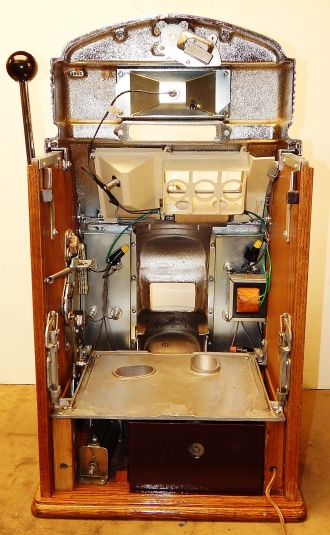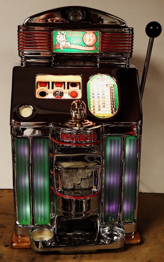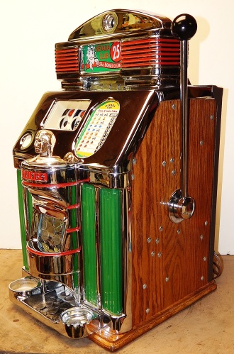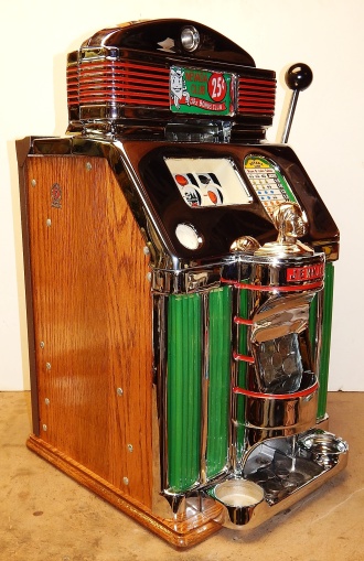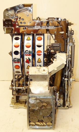 1949 Jennings Sun Chief "Nevada Club" 25 cent "Lite-Up". Restored. Chrome plated 10 out of a 10. Mint condition award card, reel strips, marquee. Working automatic Jackpot with reserve. Back door and With Ace lock with one keys, Very Nice oak cabinet with drink and ash tray in mint condition, original cash box. Plays very easy and pays as it should. 3-5 Pay out.