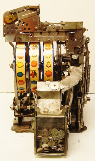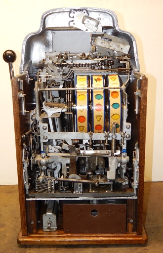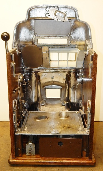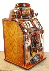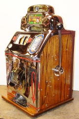 1947 Jennings "Chrome" Standard Chief 25 cent, a very sweet machine. The chrome plating on this machine is triple plated, a 10 out of 10, just beautiful. Everything on this machine is original but, the new chrome plating and the solid all oak cabinet. Original cash box, original back door. Still has the inspection stamp in the base plate. 3-5 payout