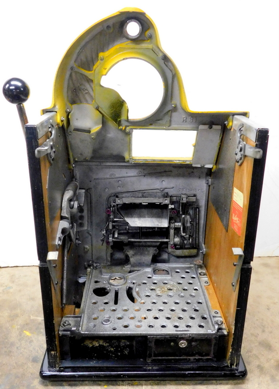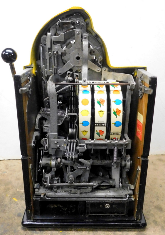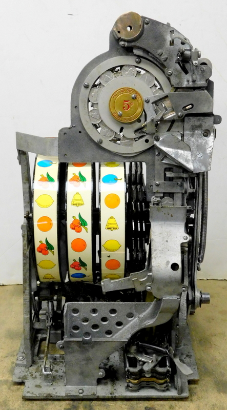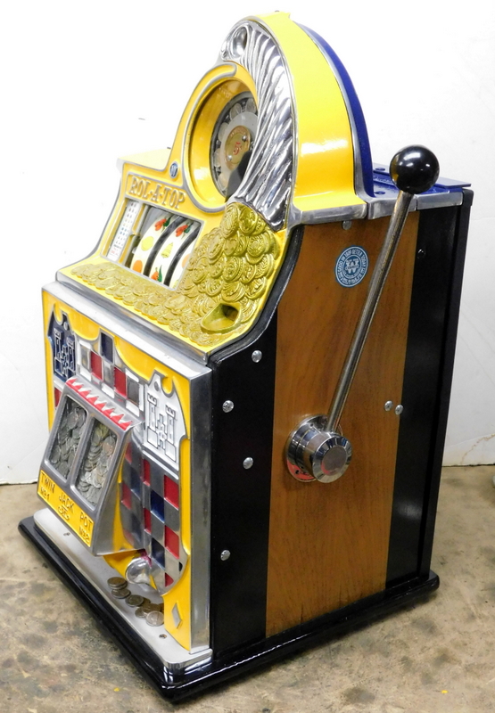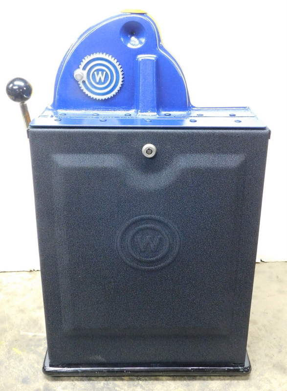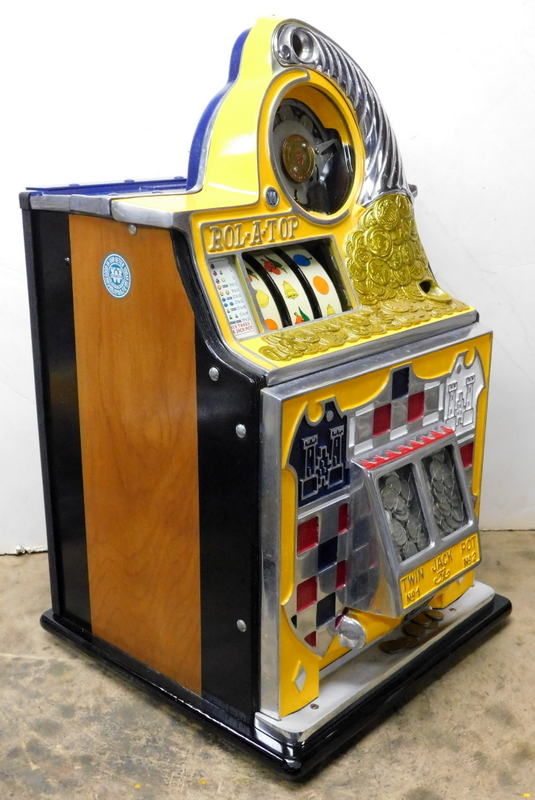 Watling 1947 Rol-A-Top "Checker Board" 5 cent. Previously restored, painted back to the original colors. New reel strips, original award card, original back door with lock and key, original cash box. Twin Jackpots.
