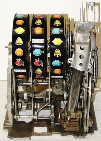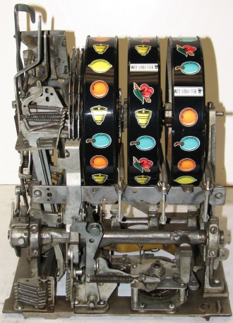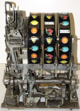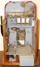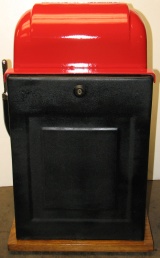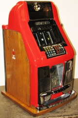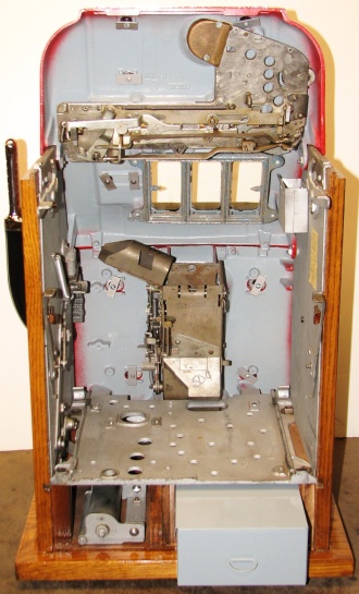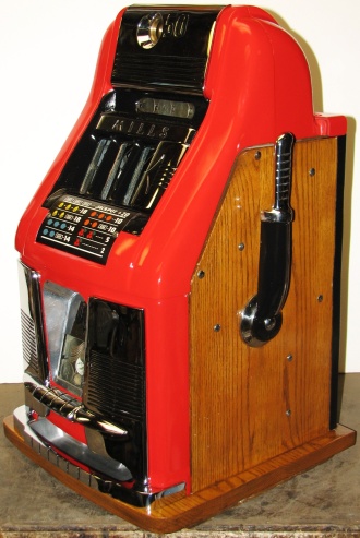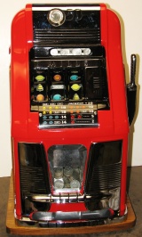 Mills 1950 Hi-Top 50 cent, This is a very nice restored large coin machine, Gloss Red trimmed in black. All the trim on this machine has been chrome plated to add a little flash to the gloss red color. Mint condition award card, Jack pot with reserve, original back door with an original MIlls lock with one key, cash box.