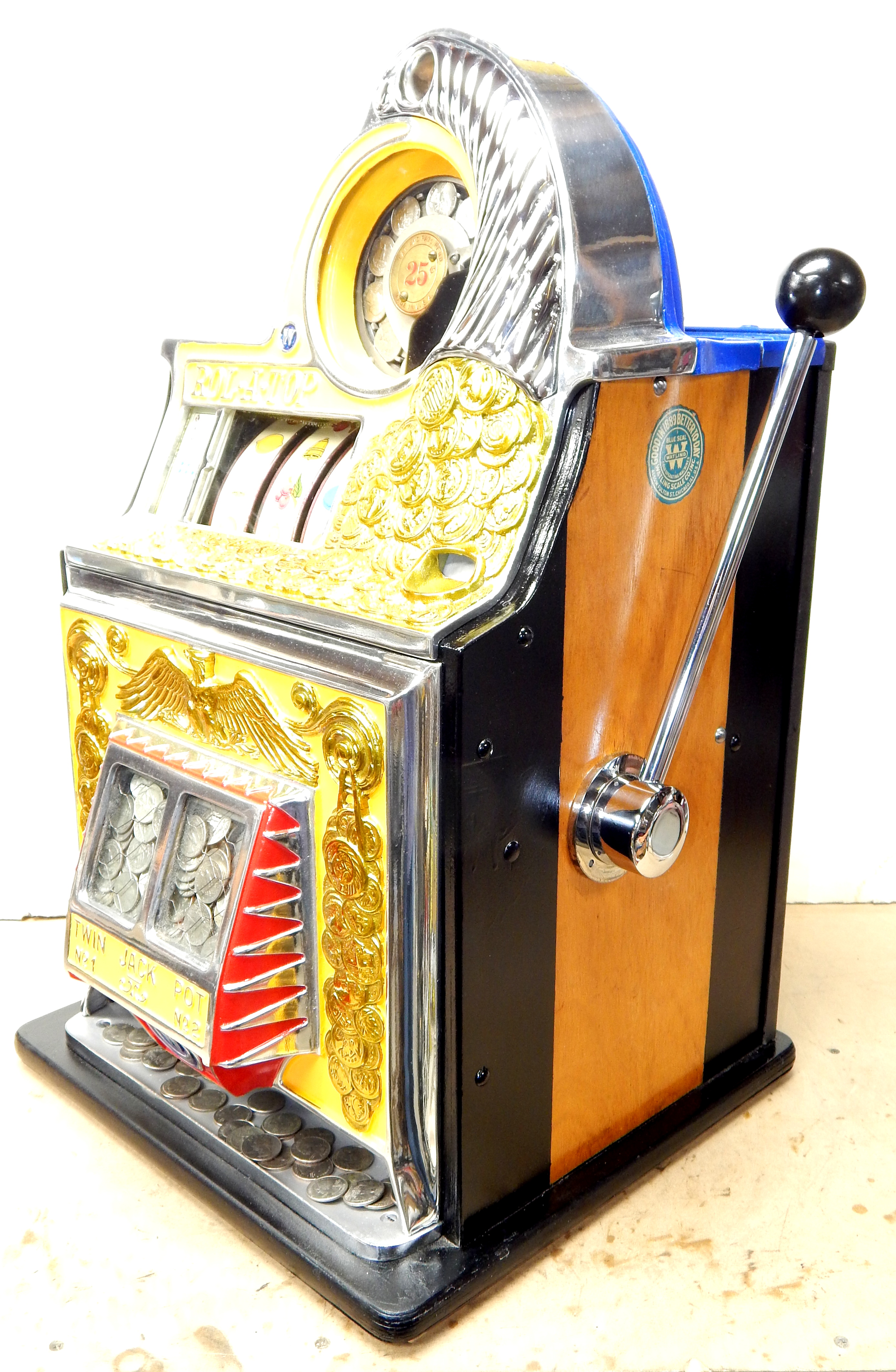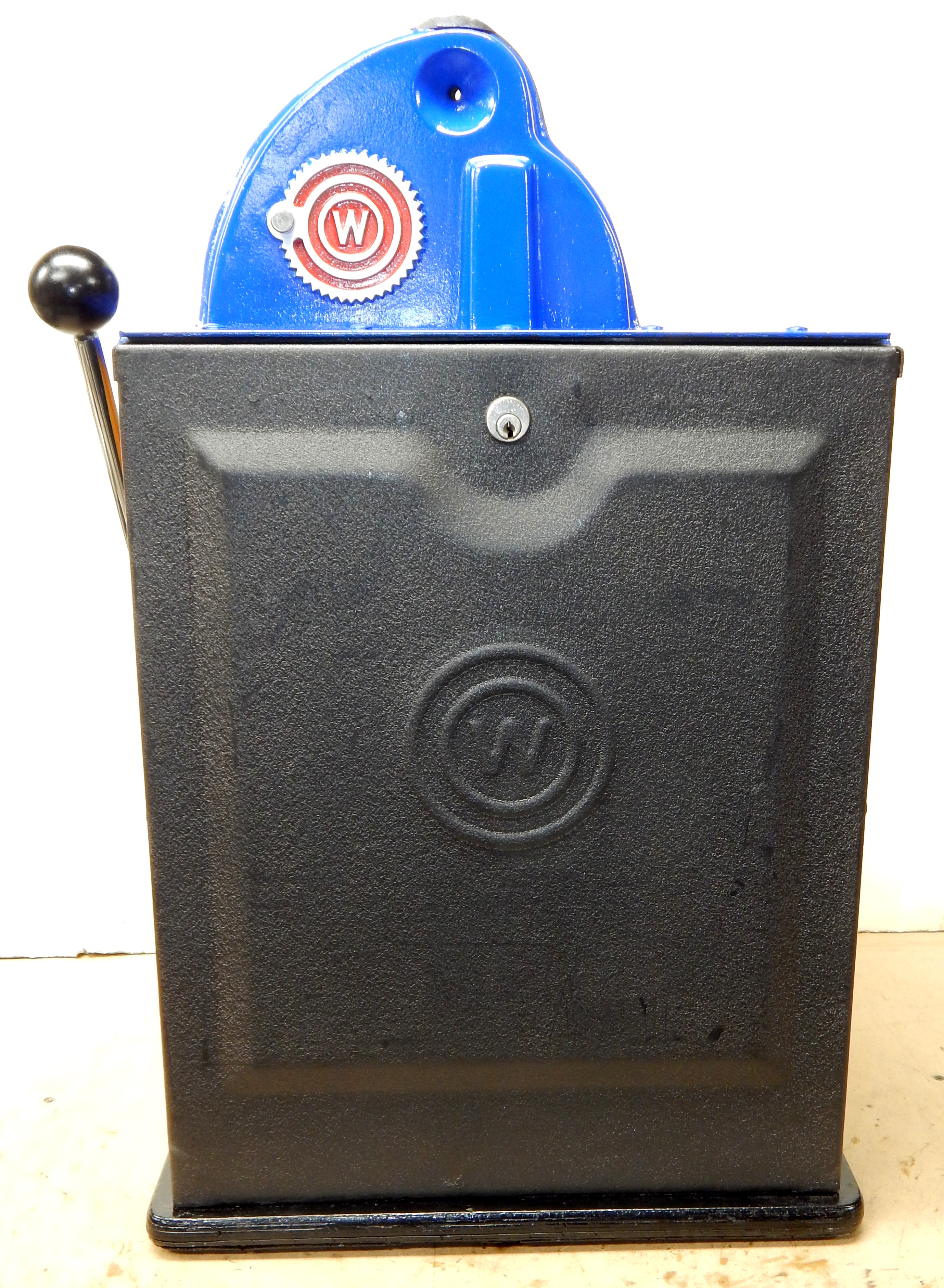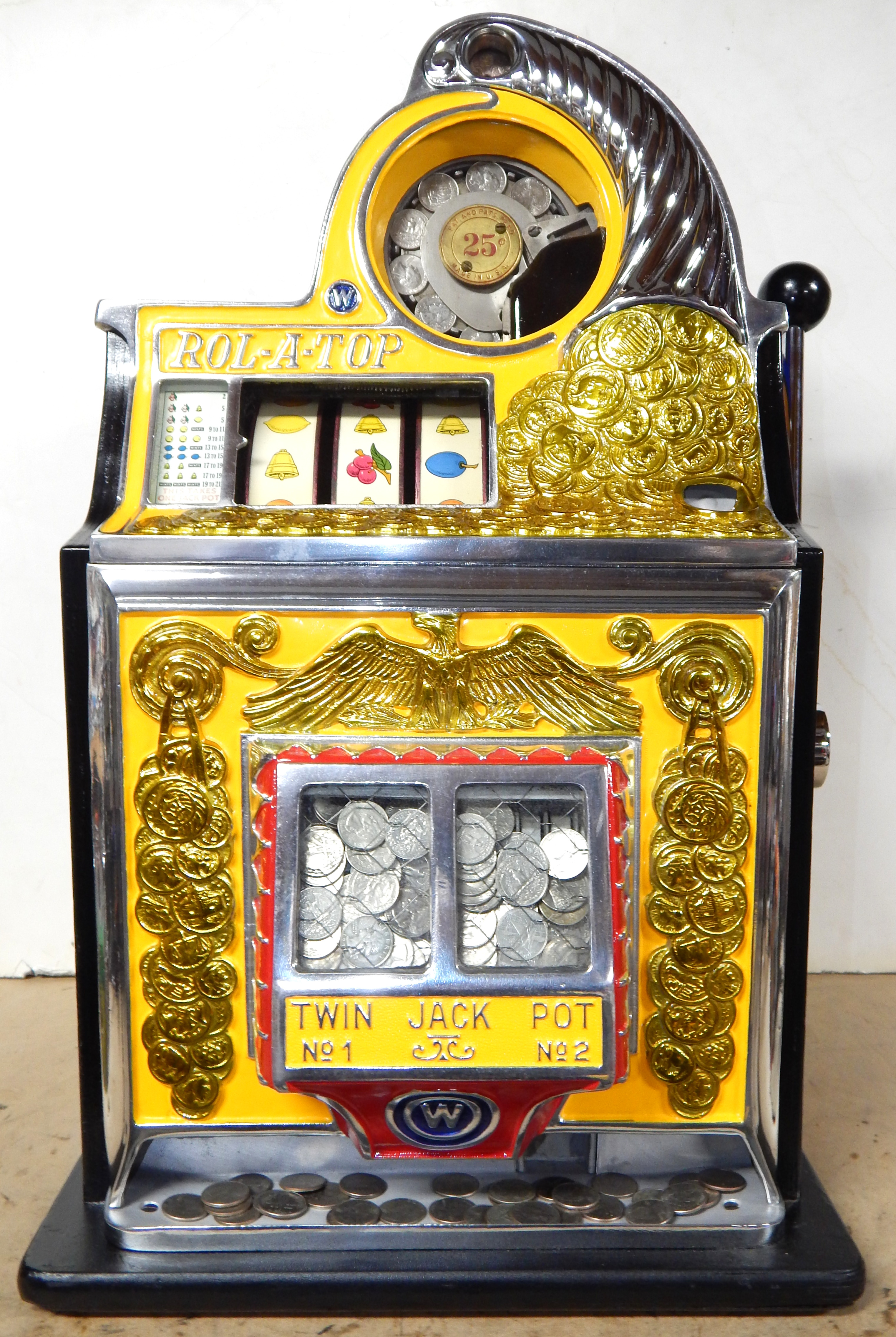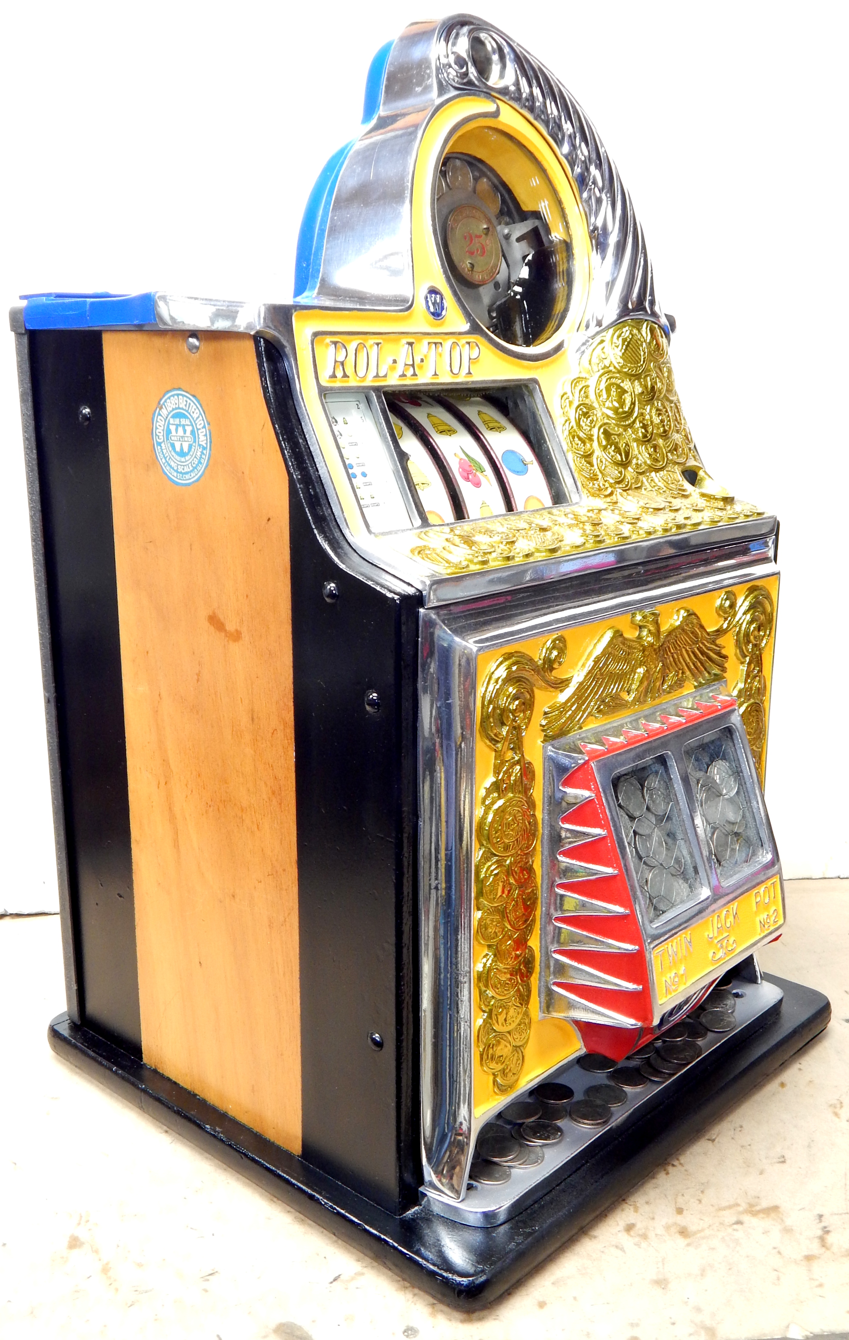 1941 Watling Rolatop "Coin Front" 25 cent, restored back to it original colors, tinted gold coins trim in Yellow, red and blue. mint original reel strips, original back door with Corbin lock and key, very nice cabinet, twin Jackpots, original cash box with original watling lock and key.
