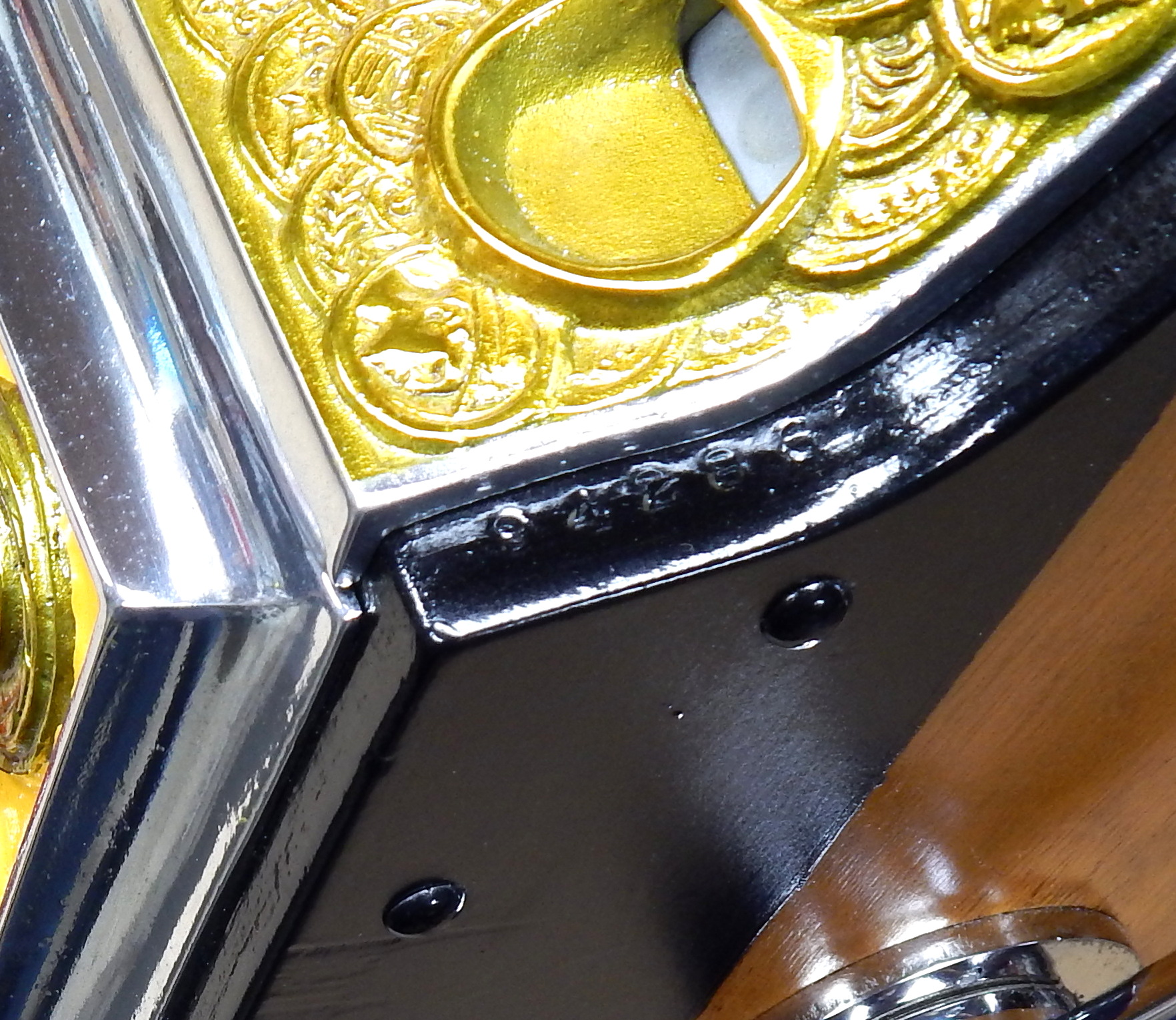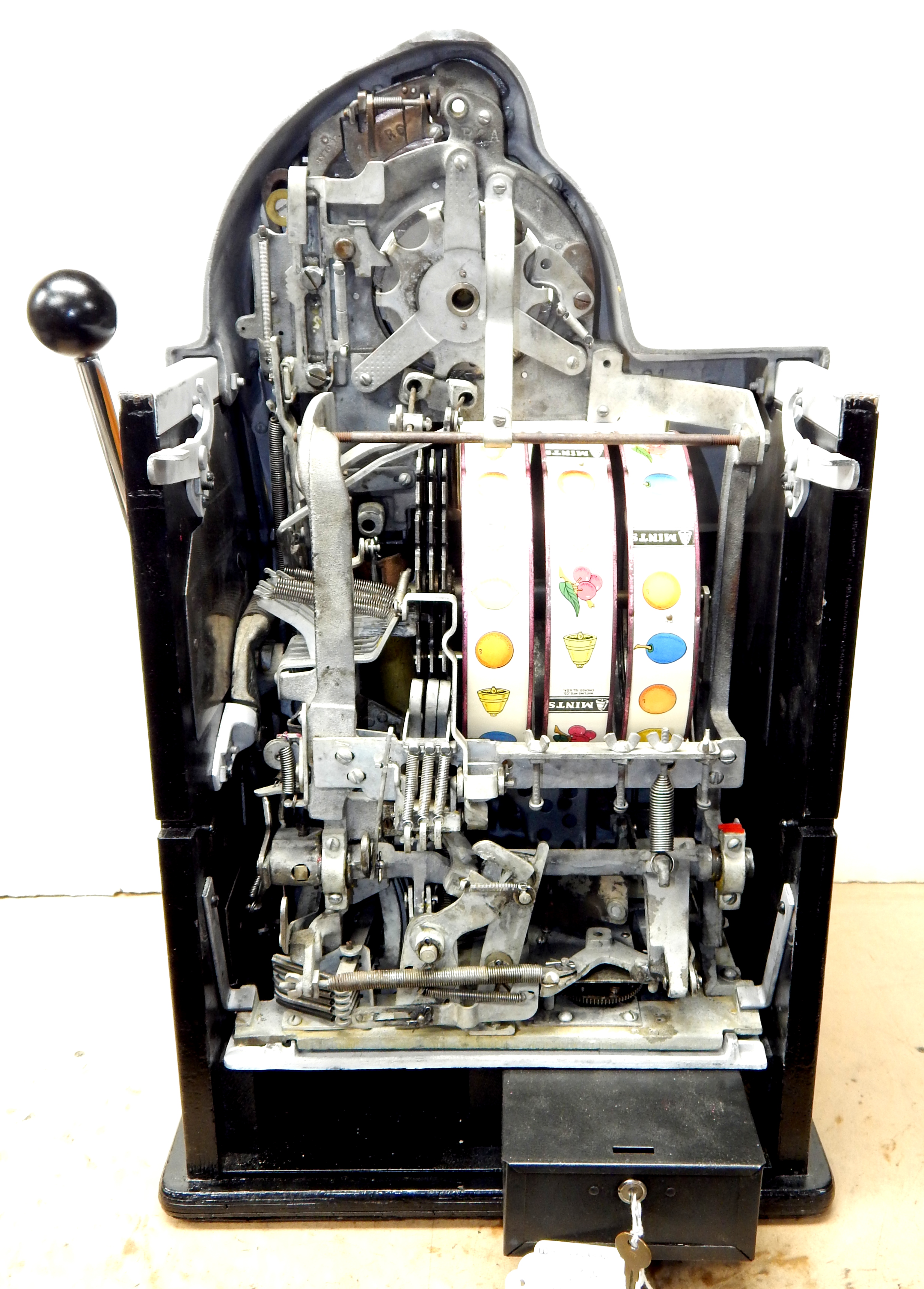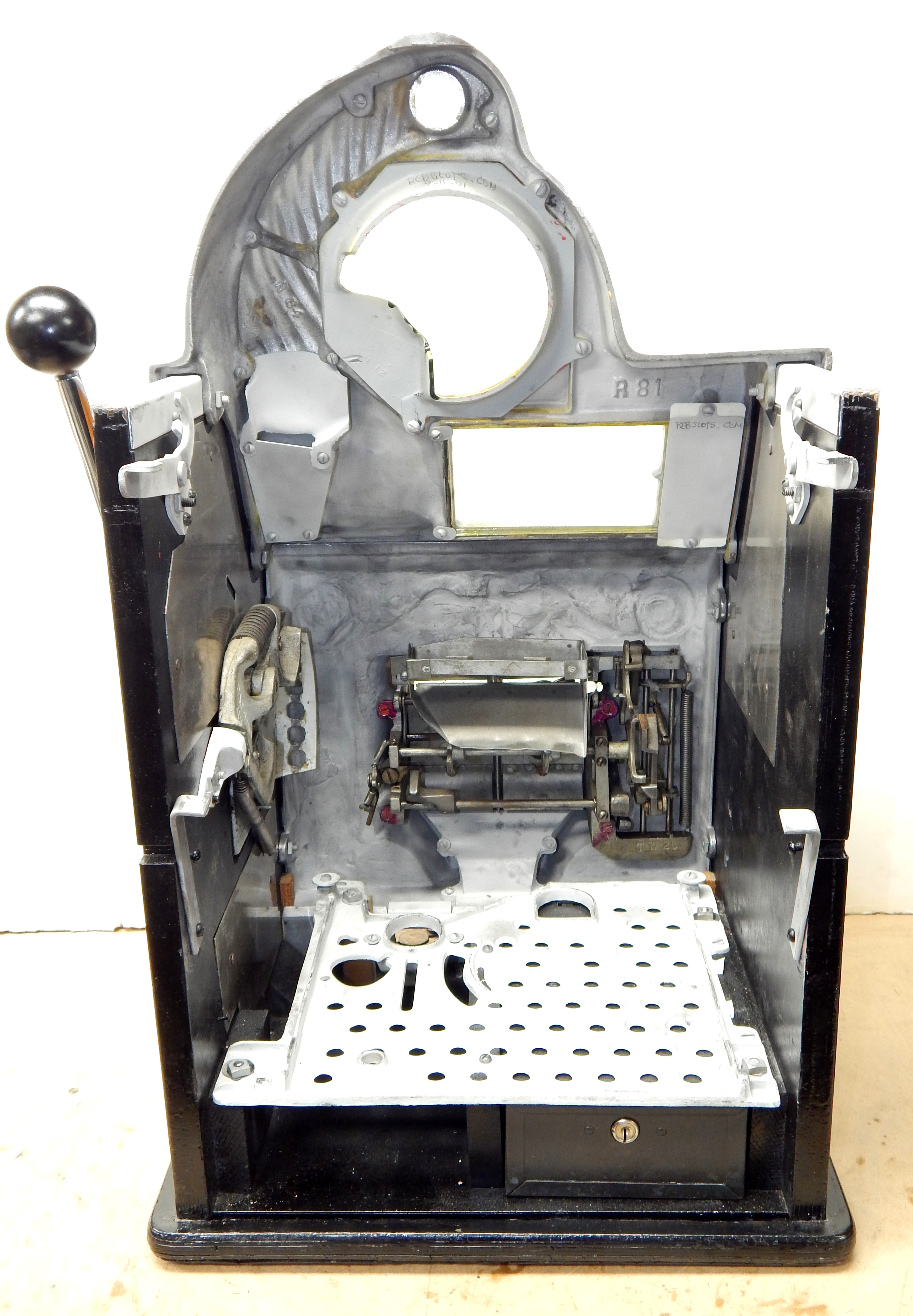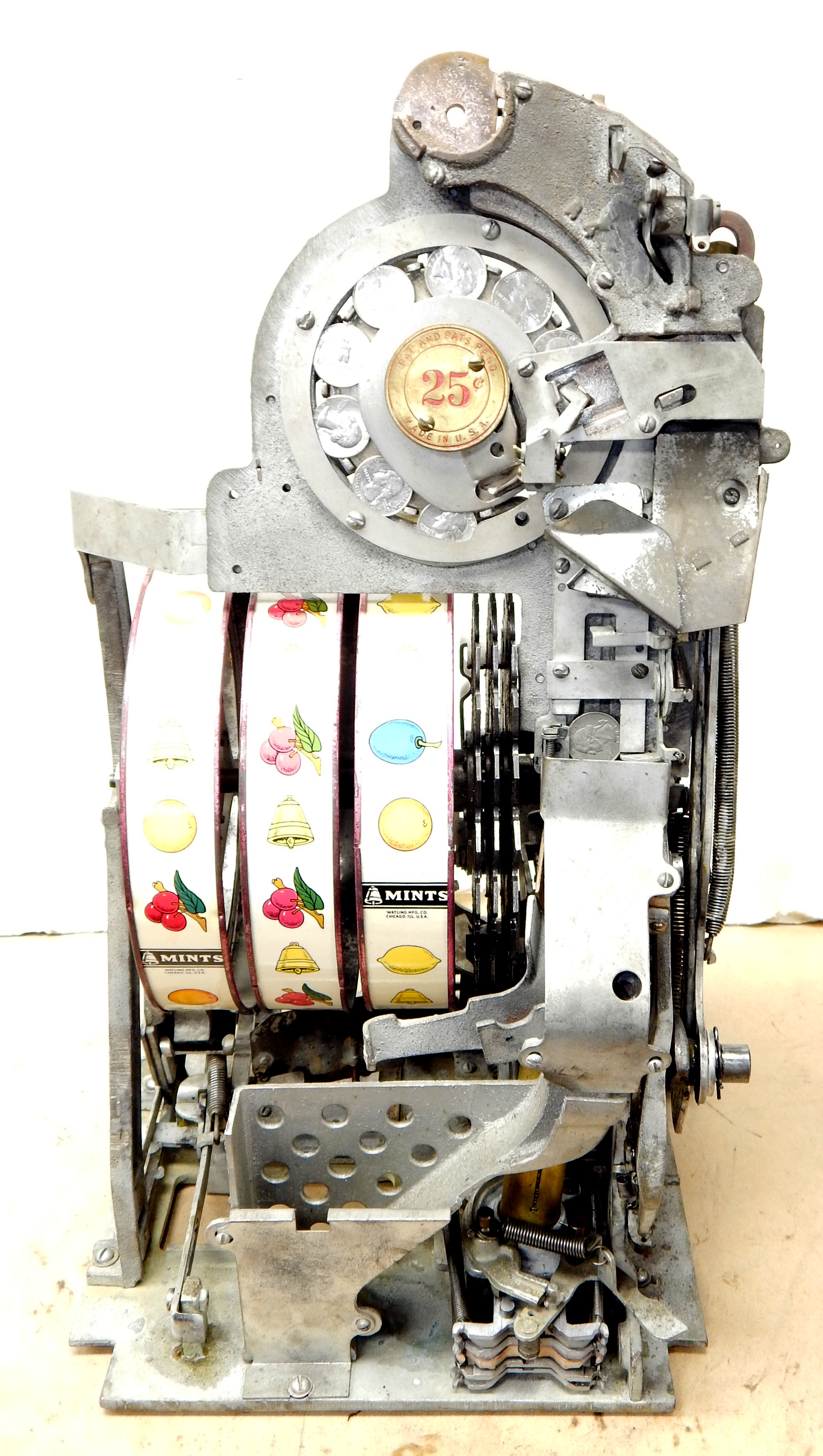 1941 Watling Rolatop "Coin Front" 25 cent, restored back to it original colors, tinted gold coins trim in Yellow, red and blue. mint original reel strips, original back door with Corbin lock and key, very nice cabinet, twin Jackpots, original cash box with original watling lock and key.