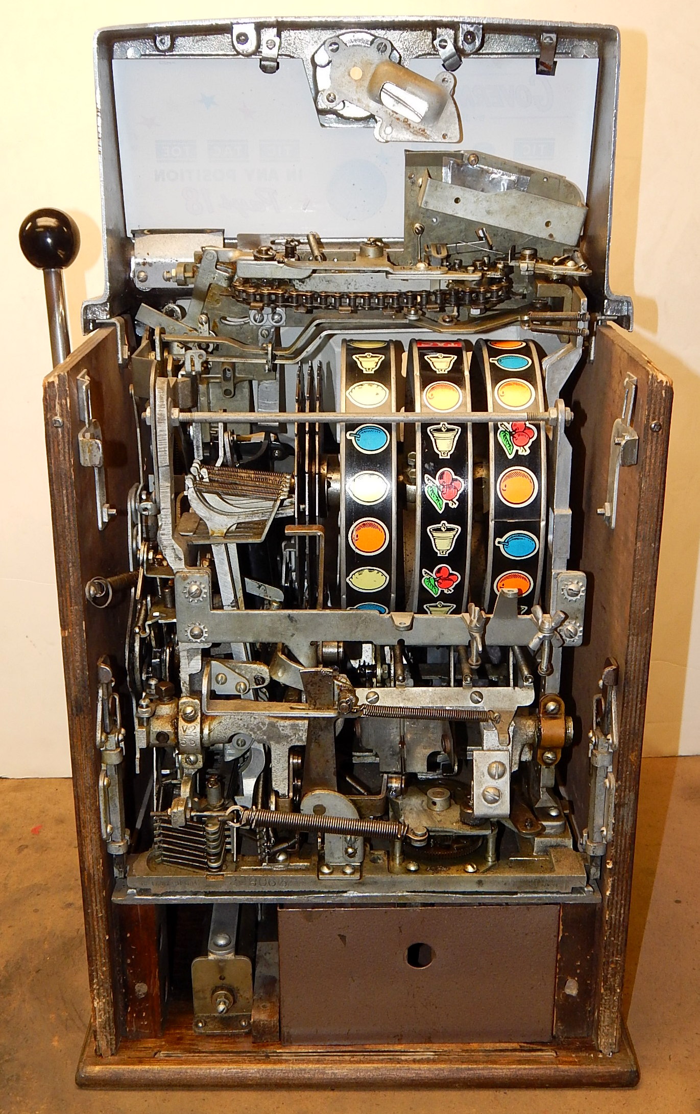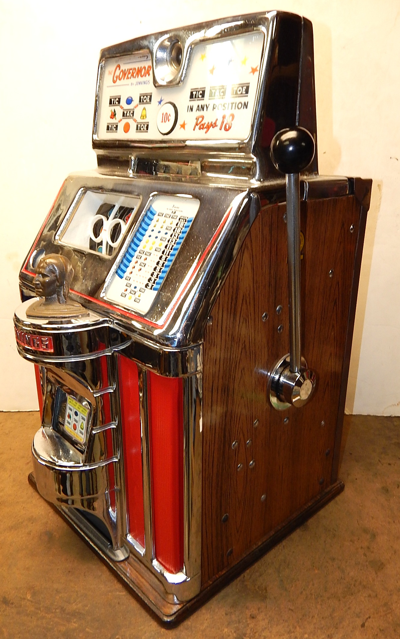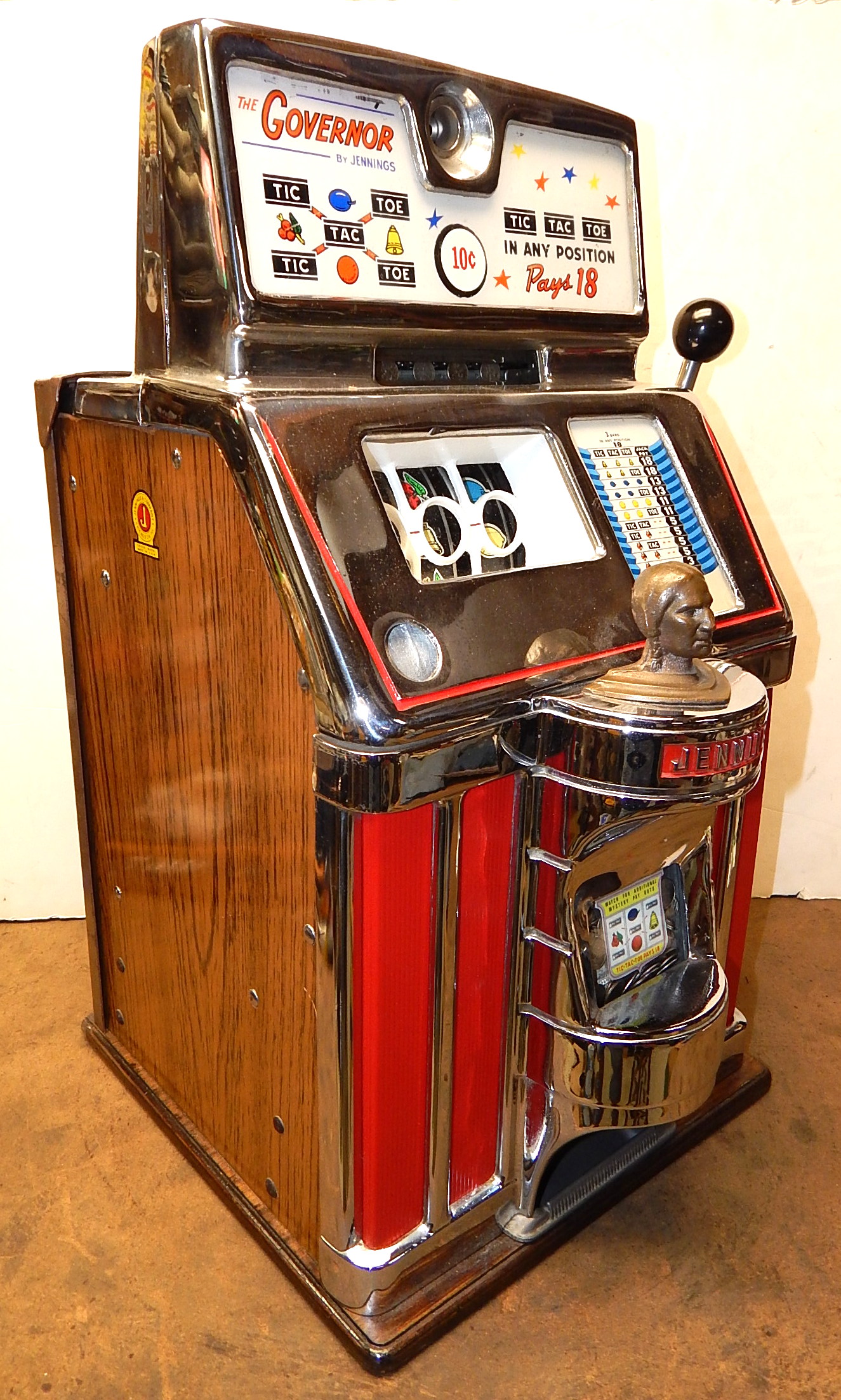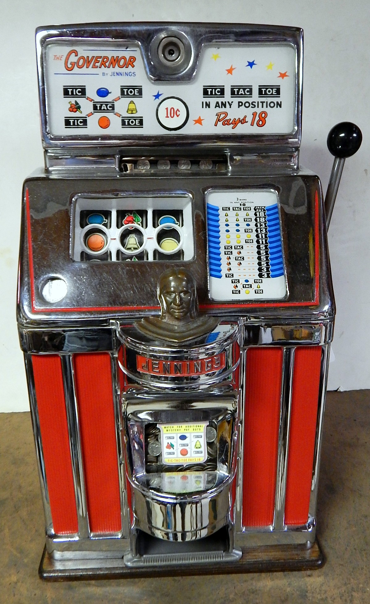1960 Jennings Governor Tic, Tac, Toe, 10 cent. chrome, trimmed in red. Very nice original machine not restored, original cash box, original back door, original black reel stripes. This is not a "lite-up" machine. Plays very easy.