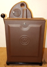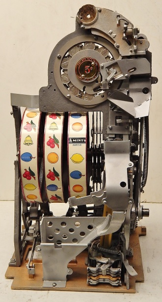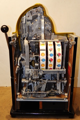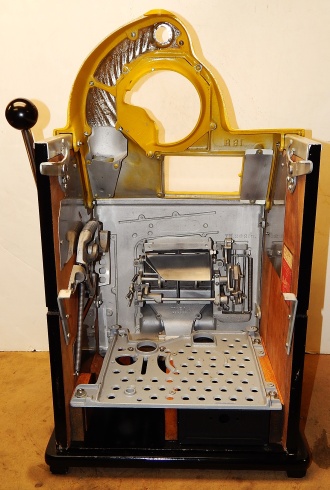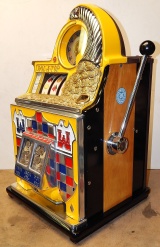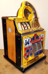 Watling 1948 Rol-A-Top "Checker Board" 5 cent. Previously restored, painted back to the original colors. New reel strips, original award card, original back door with lock and key, original cash box. Twin Jackpots.