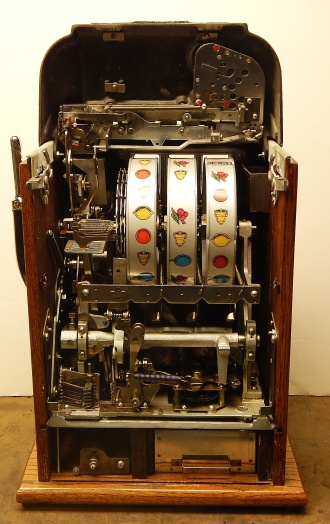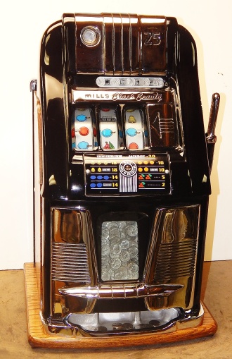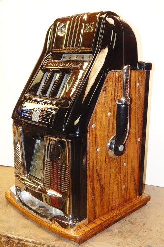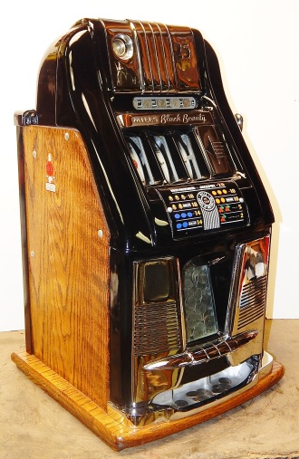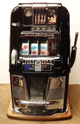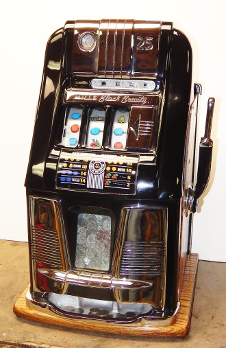 Mills 1950 Black Beauty 25 cent, This is a very nice previously restored machine, Gloss Black with chrome plated trim. This machine does not have a working Jackpot, Play very nice and pay as it should.