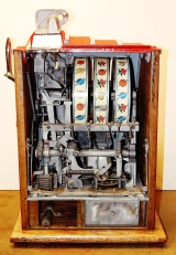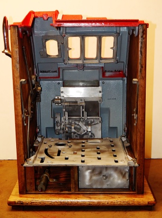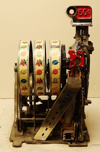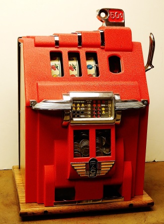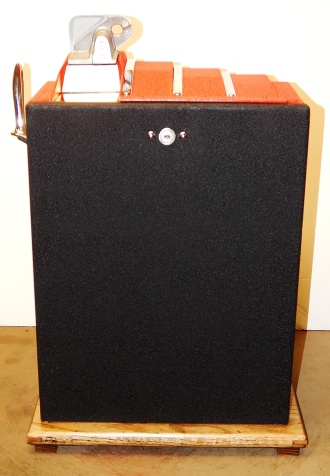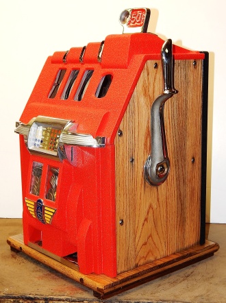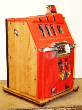 1939 Pace Deluxe Comet 50 cent, restored back to the original color "red wrinkle" paint. Oak Cabinet with new fortune reel strips, original back door, original cash box with Pace lock and key. This large coin machine has a working front load Jack pot. Very nice original machine, plays easy and pay as it should, 3-5 pay out.
