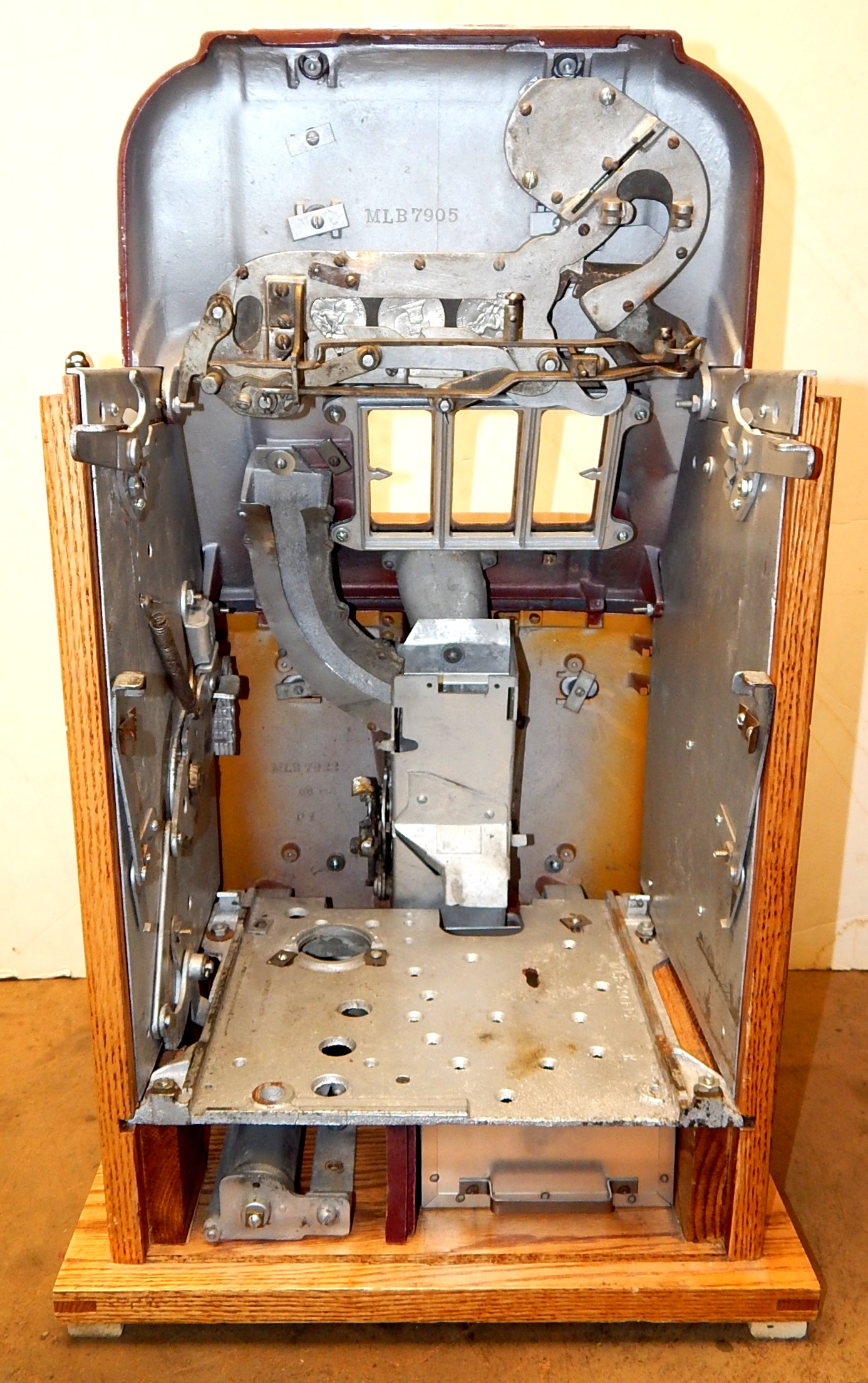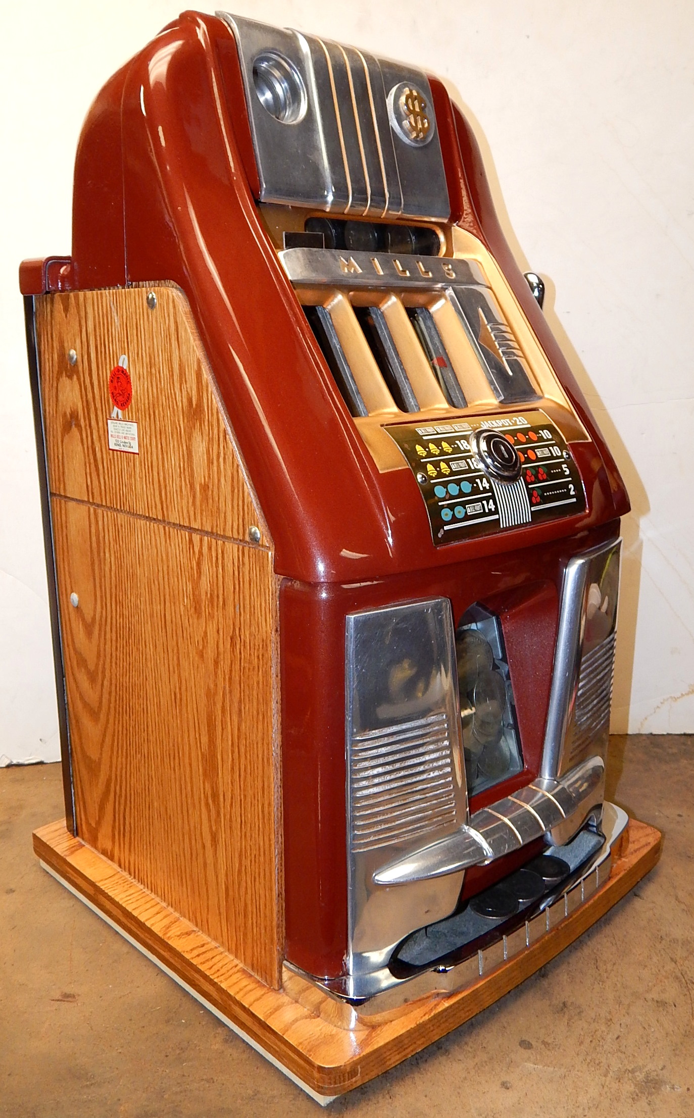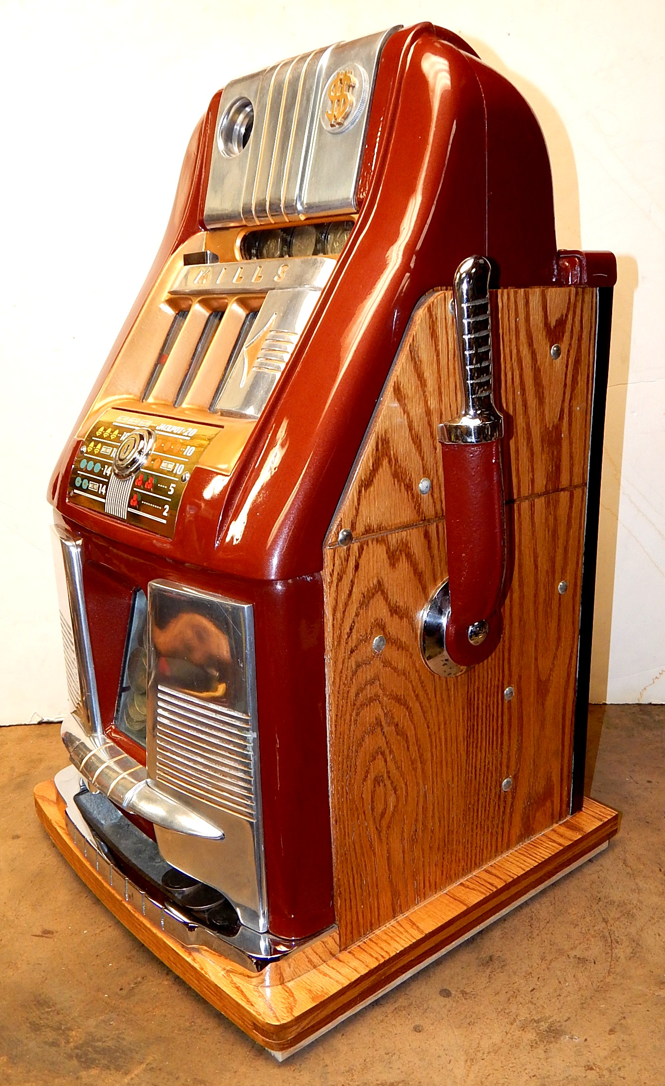Mills 1950 Hi-Top $1.00, This is a very nice hard to find large coin machine previously restored. Casting painted brown trim in gold. Front load Jackpot with leap fog escalator. Original award card, original back door with Mills lock, original cash box, new black reel strips. oak cabinet. This machine also has a coin return, something I have not seen before, any coins other then a dollar will be return. Coins are received at the top left hand side just above the name plate, real cool. Comes with 100 dollar tokens. Plays very easy. If you are looking to complete your collection with that hard to find dollar machine here's your chance.