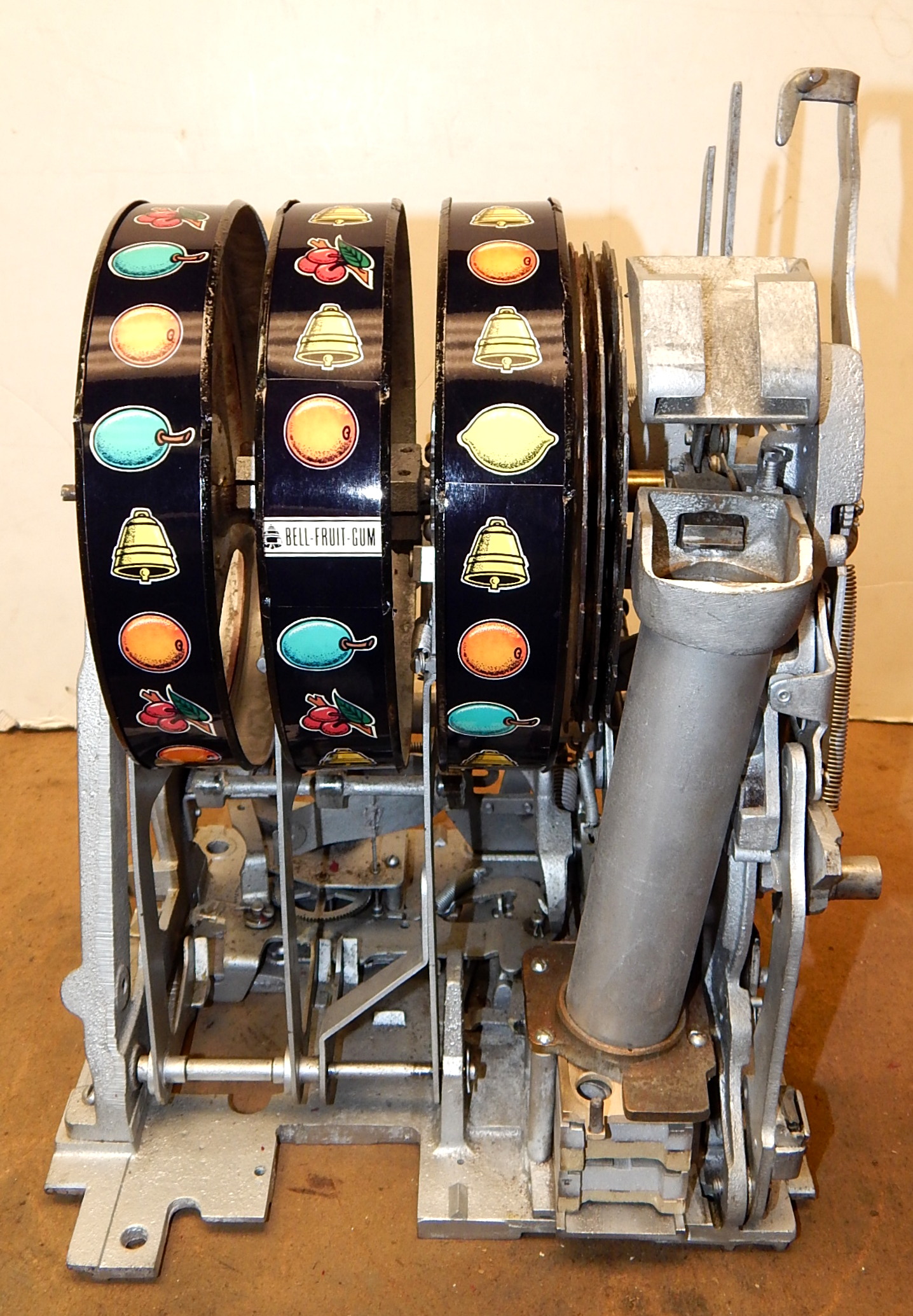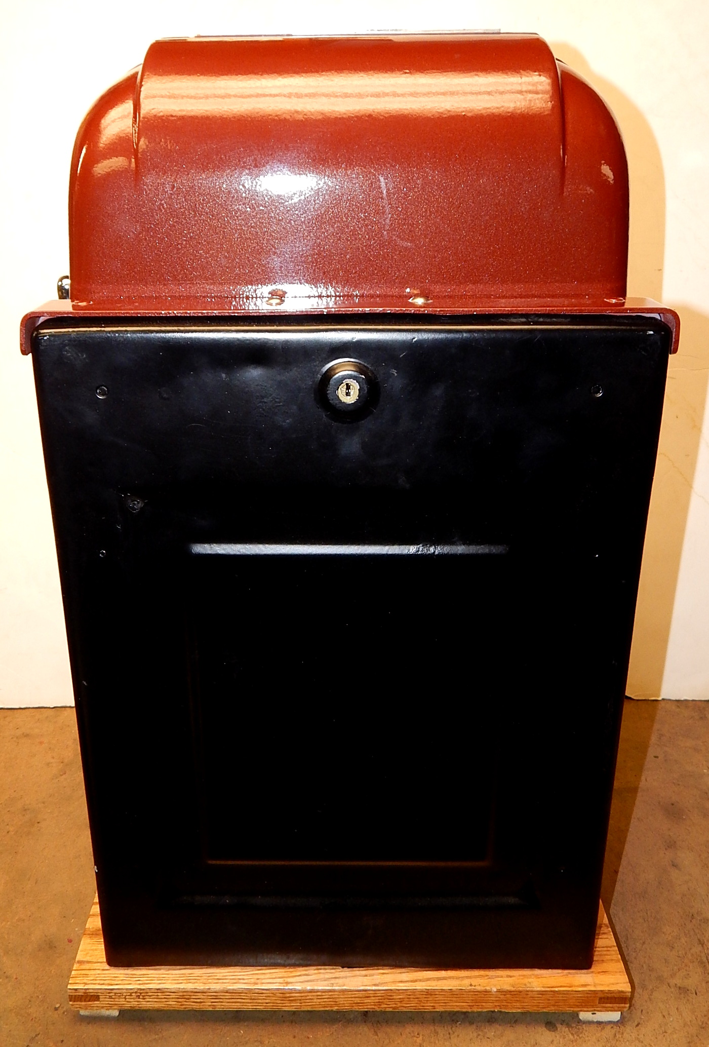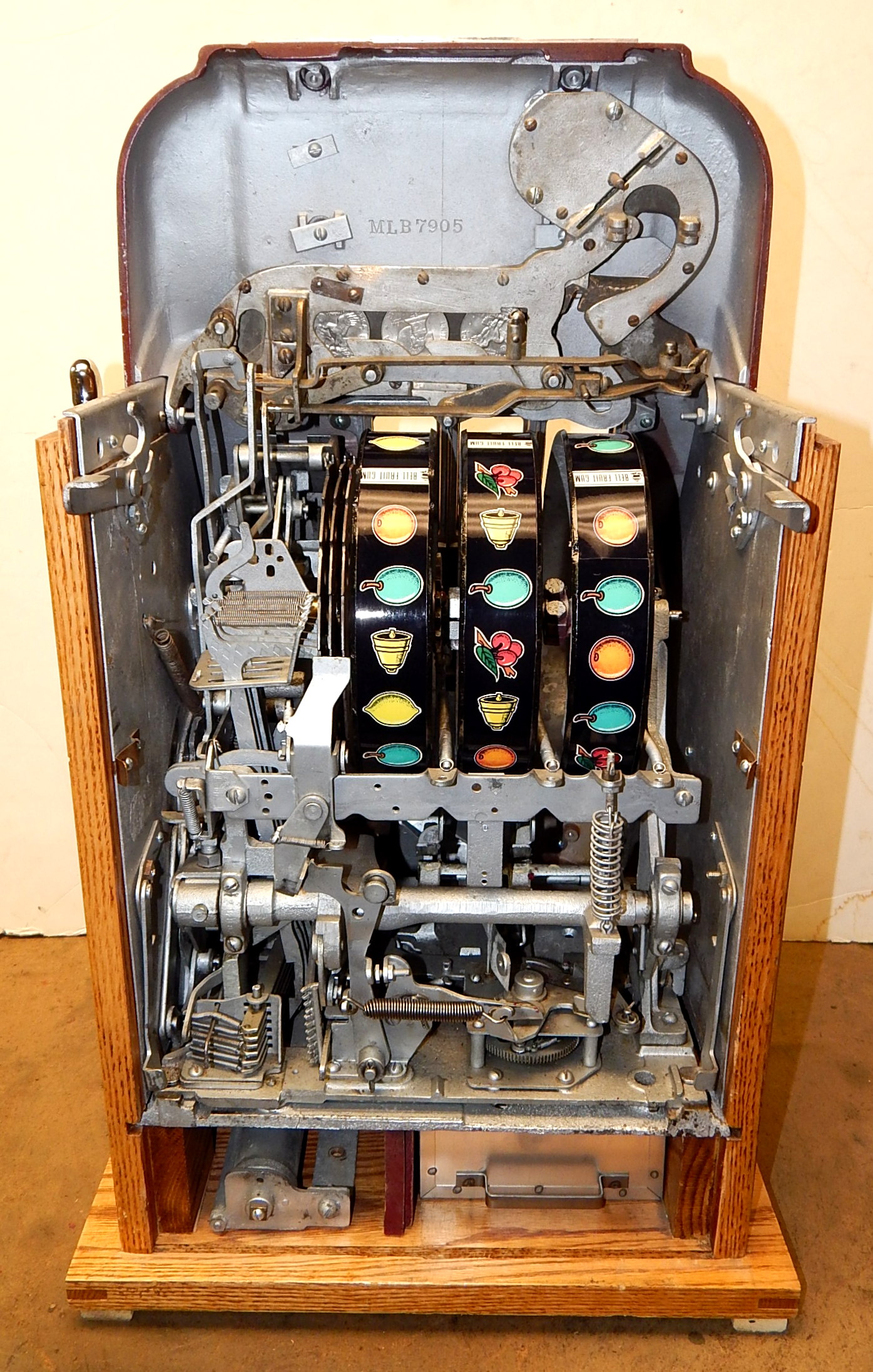 Mills 1950 Hi-Top $1.00, This is a very nice hard to find large coin machine previously restored. Casting painted brown trim in gold. Front load Jackpot with leap fog escalator. Original award card, original back door with Mills lock, original cash box, new black reel strips. oak cabinet. This machine also has a coin return, something I have not seen before, any coins other then a dollar will be return. Coins are received at the top left hand side just above the name plate, real cool. Comes with 100 dollar tokens. Plays very easy. If you are looking to complete your collection with that hard to find dollar machine here's your chance.