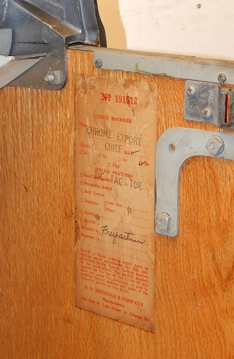 1949 Jennings Export Chief, 25 cent, "Tic Tac Toe" Original condition, numbers matching. Original cash box, original back door, original reel strips. Chrome on this machine is a 9 out 10. Not bad for a machine that is 67 years old. Plays nice, pay as it should. If you are looking for a nice un-touch machine, here you are.