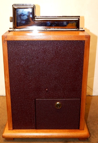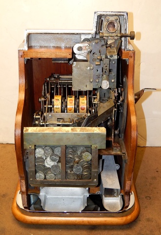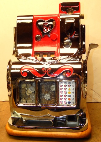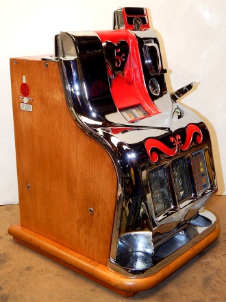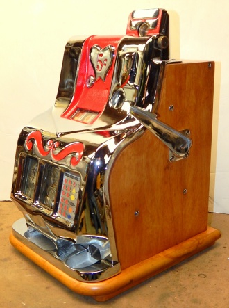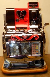 1941 Mills QT "Sweet Heart" 5 cent. This is a very nice restored cast iron machine. Chrome plating is 9.5 out of a 10. Trimmed in red. Twin Jackpots, original front and back door locks , original cash box, original award card, original reel strips. Very nice hard wood cabinet. Measurements 12.5" X 13.5" X 18", 51 pounds. Plays very easy pays as it should.