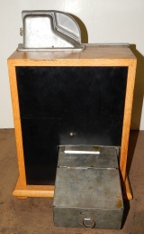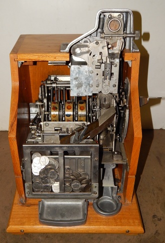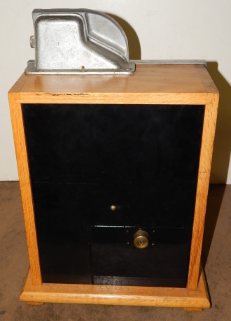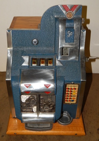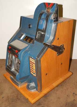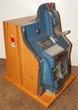 1936 Mills QT "Chevron" 5 cent. This is a very nice original condition machine. Blue and Red in color. Twin Jackpots, original back door, original cash box, original award card, original Mills front and back door locks with Mills keys. Very nice oak hard wood cabinet. Measurements 12.5" X 13.5" X 18", 51 pounds. Plays very easy, pays as it should.