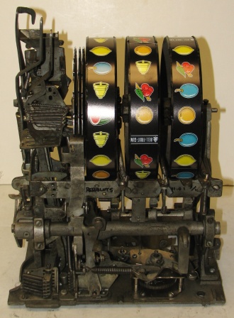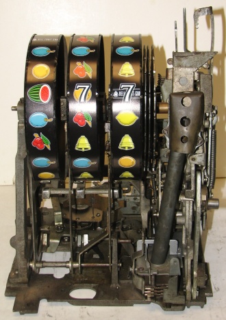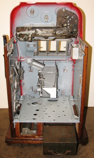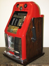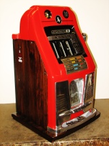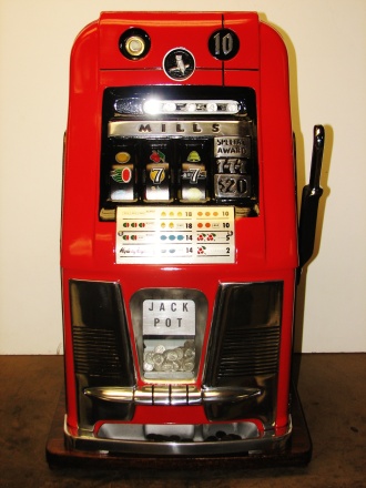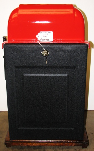 Mills 1959 " 7-7-7 " Hi-Top 10 cent, This is a very nice restored machine, Gloss red trimmed in black, original cash box, back door, jackpot with reserve. The 7-7-7 token vendor has been removed before we received this machine.
