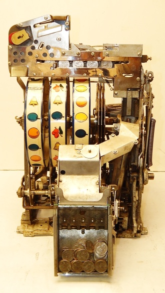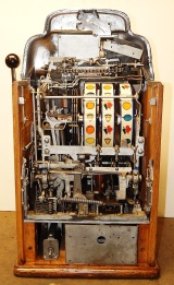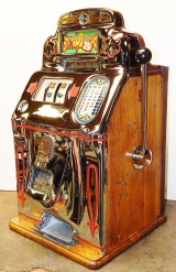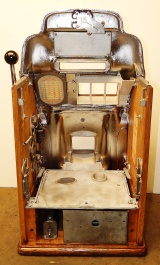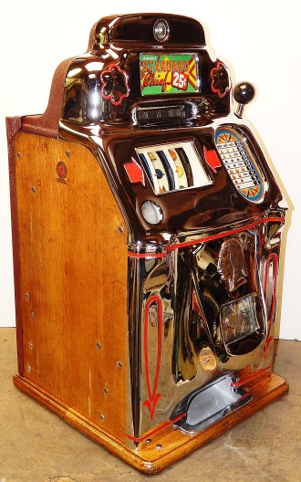1947 Jennings "Chrome" Standard Chief 25 cent, a very sweet machine. The chrome plating on this machine is triple plated, a 10 out of 10, just beautiful. Everything on this machine is original but, the new chrome plating. Very nice solid all oak cabinet. Original cash box, original back door. Plays very nice and easy. 3-5 payout