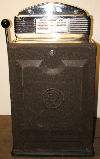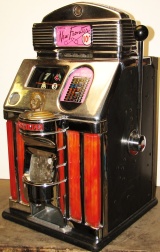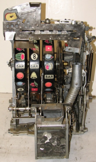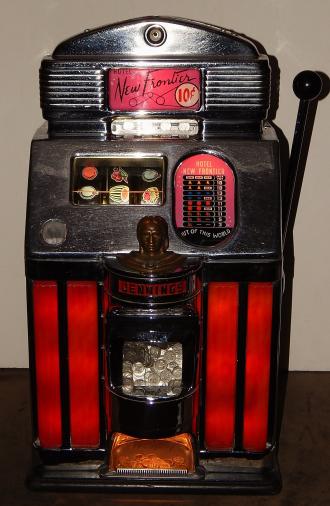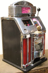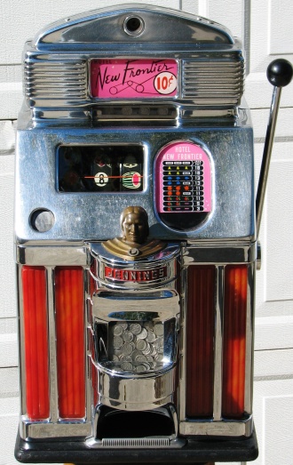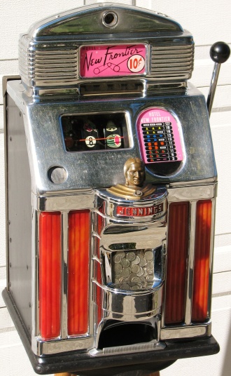 1951 Jennings (lite-up) "Hotel New Frontier" 10 cent, with front-load functioning jackpot, original reel strips, original back door with Ace lock. This machine is in original condition, has the lites-up front casting with red plastic's at the bottom and black-lite for the reel strips which look very nice with low lights. The chrome plating on this machine is 8 out of an 10. This machine also has 5 different jackpot symbols which makes it a lot more fun to play. The cabinet is made of oak wood, painted black. The machine plays and pays as it should.