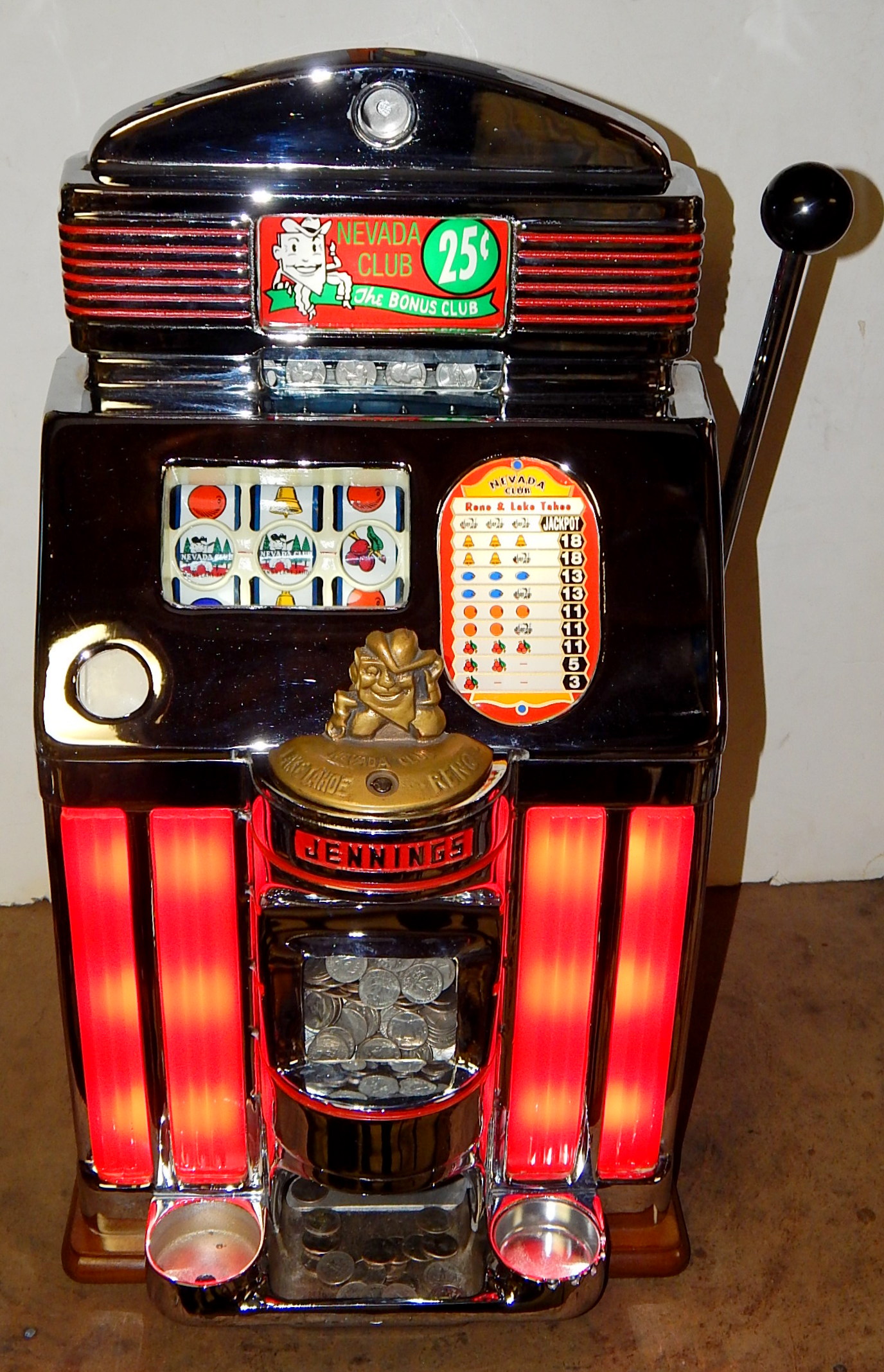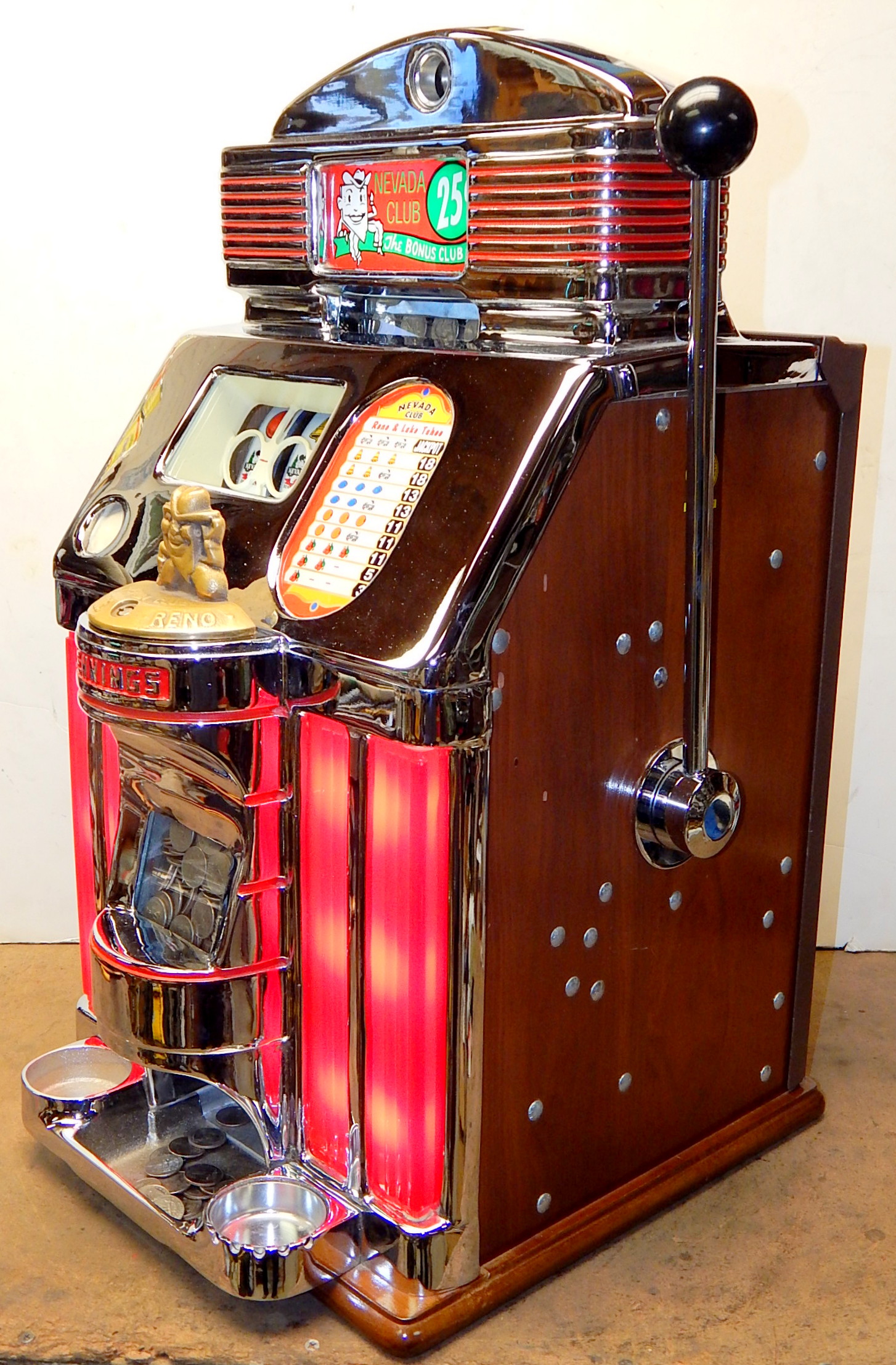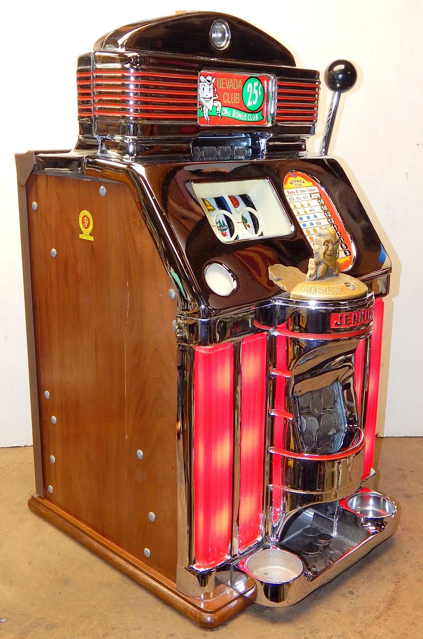 1949 Jennings Sun Chief (lite-up) "Nevada Club" lake Tahoe 25 cent, previously restored with the hard to find Glass and Ash tray money bowl. Functioning front load jackpot, back door with lock and keys. Has red top marquee, award card, bottom plastic. The chrome plating on this machine is 10 out of an 10. The cabinet is made of mahogany. Cash box and back door lock are replacements The machine plays very easy and pays as it should.